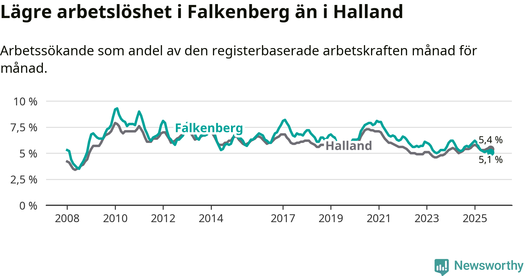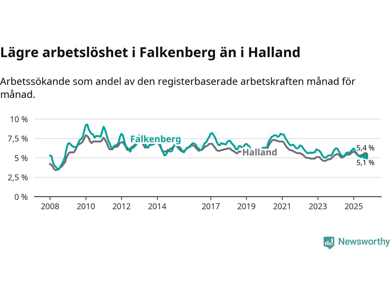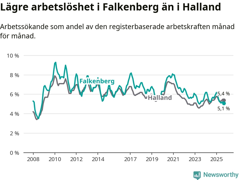 Graf: Arbetslöshet i Falkenbergs kommun och Hallands län