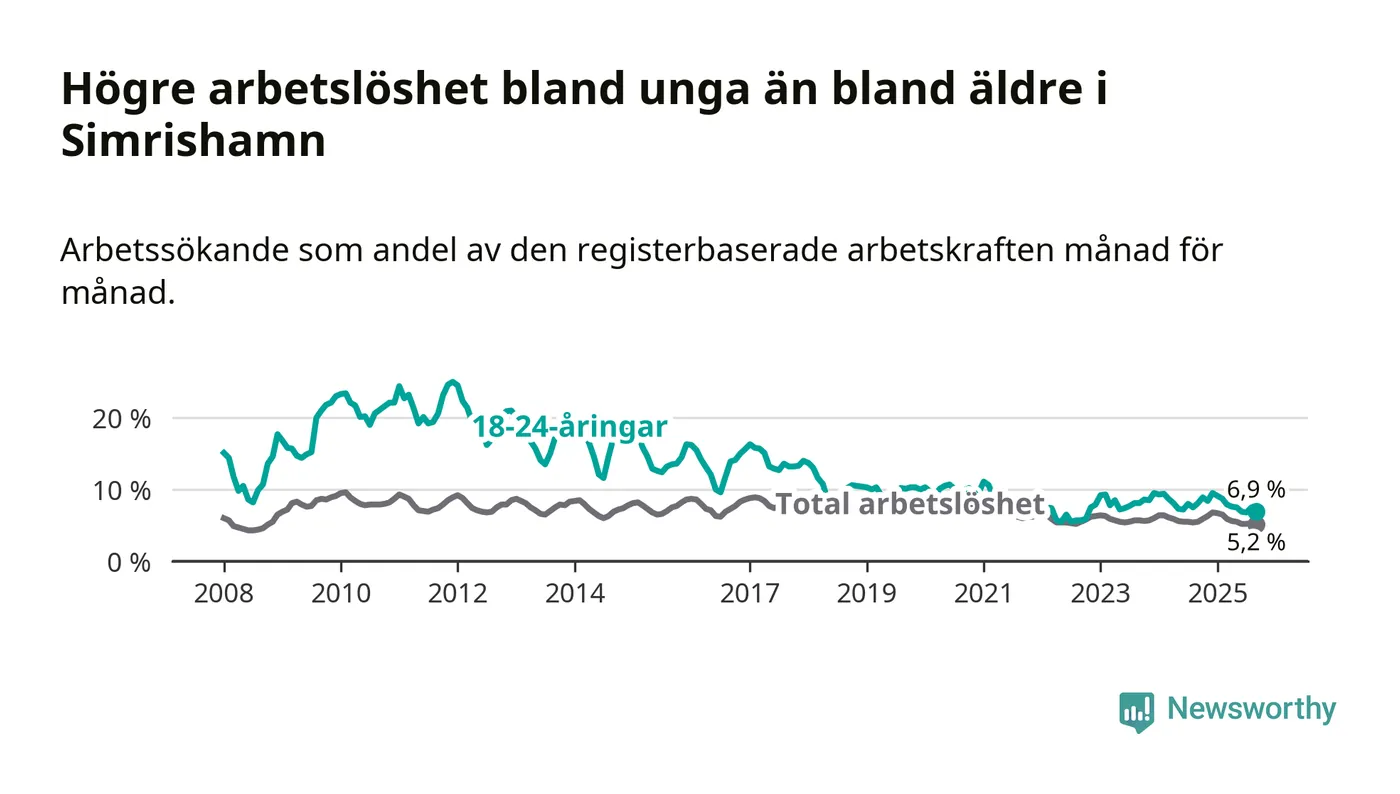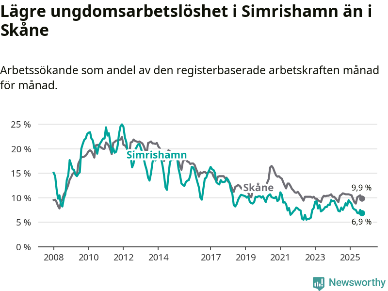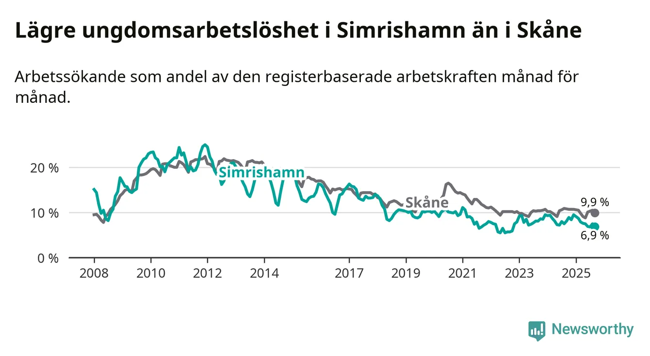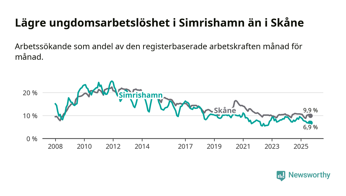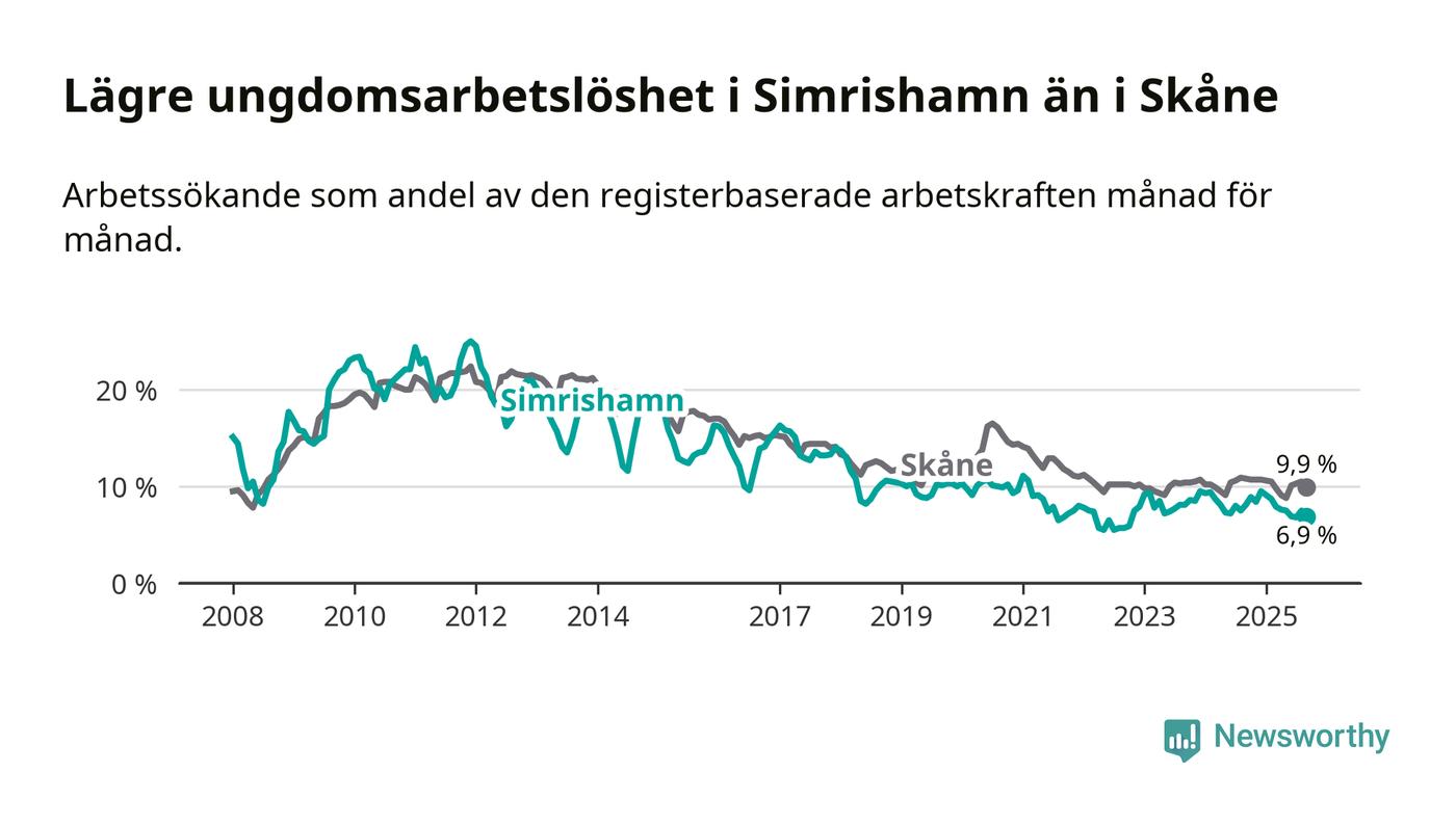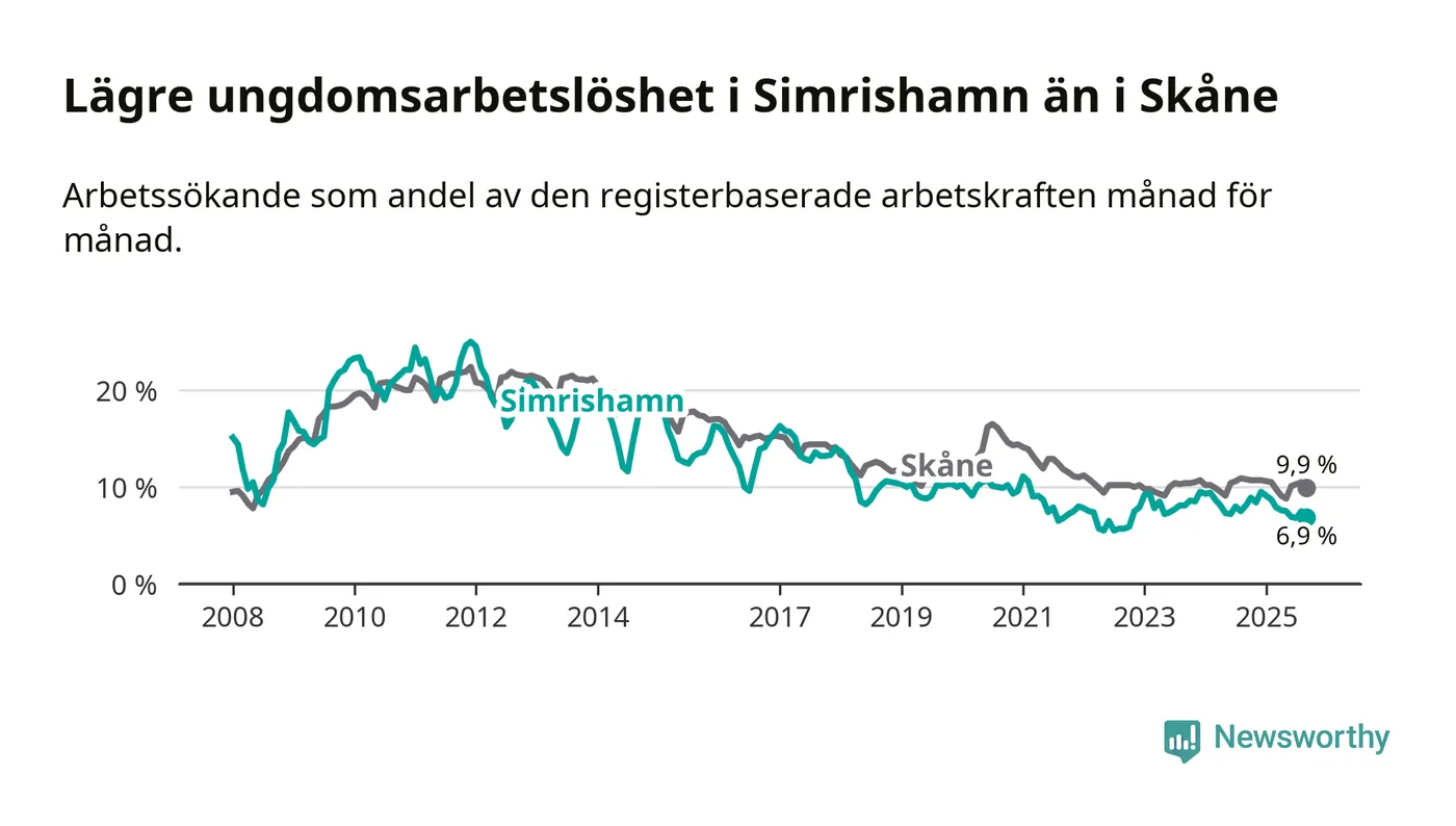 Precis som den totala arbetslösheten ligger ungdomsarbetslösheten i Simrishamn lägre än i Skåne som helhet. Skillnaden mellan kommunen och länet är 3,0 procentenheter.