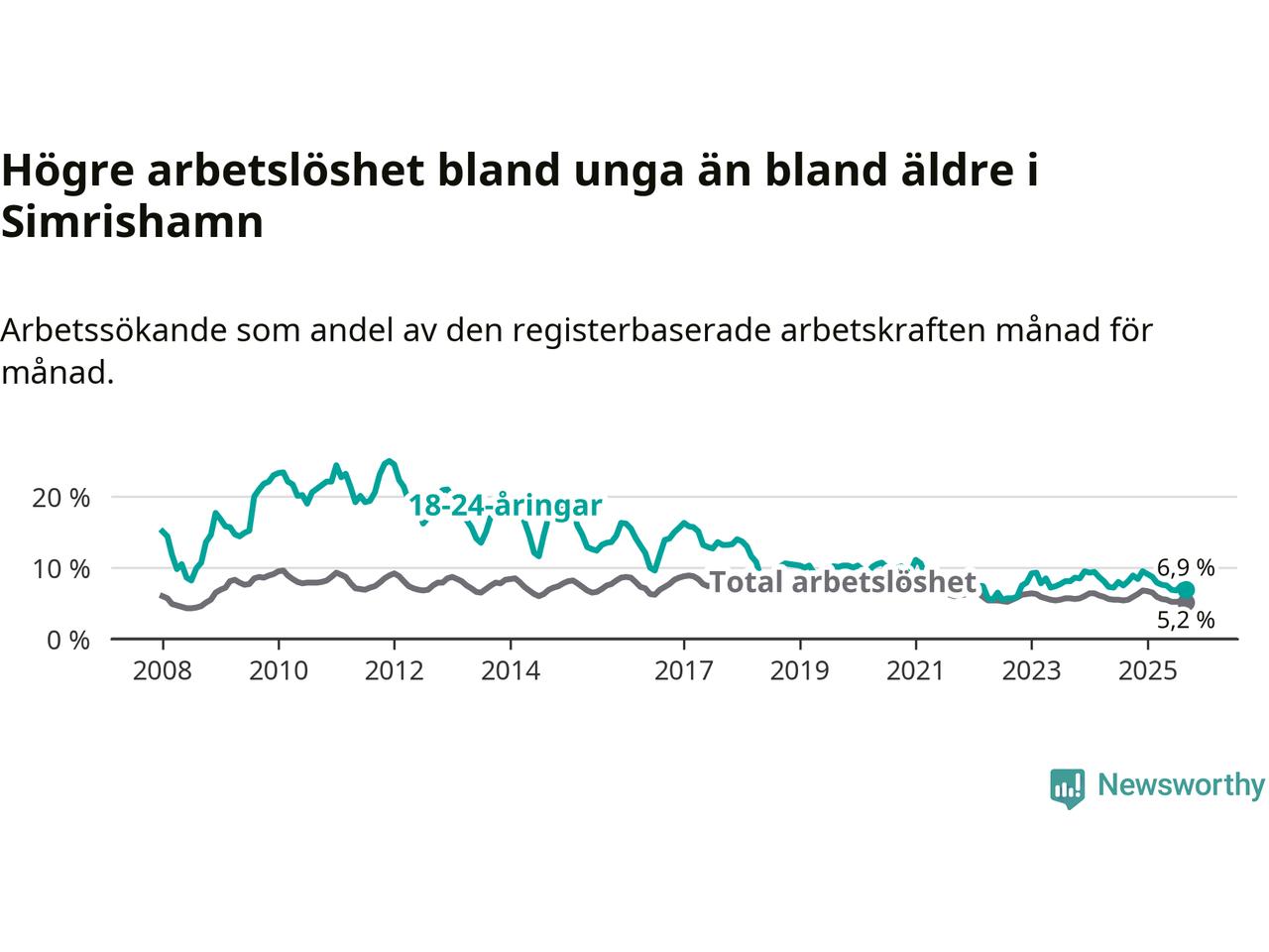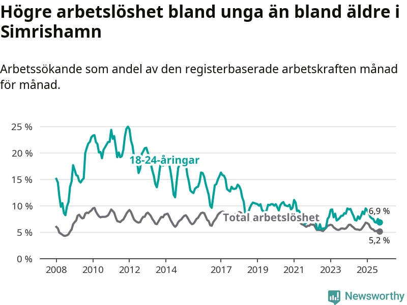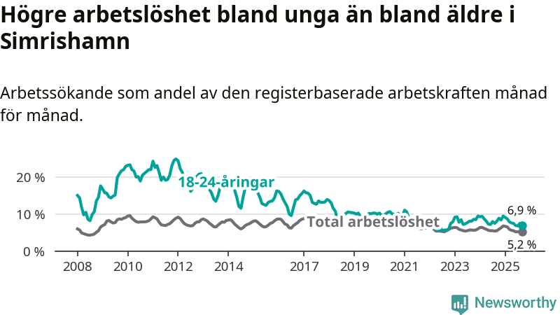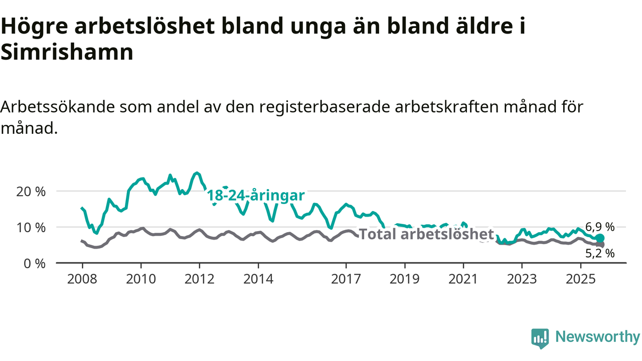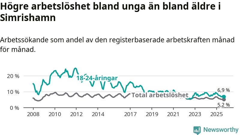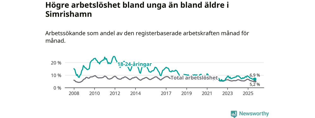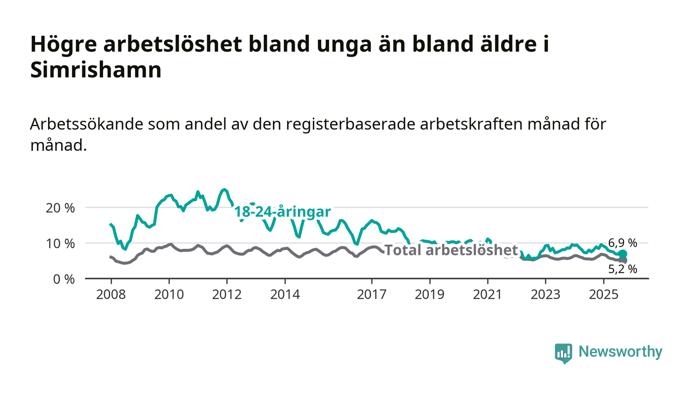 Precis som den totala arbetslösheten ligger ungdomsarbetslösheten i Simrishamn lägre än i Skåne som helhet. Skillnaden mellan kommunen och länet är 3,0 procentenheter.