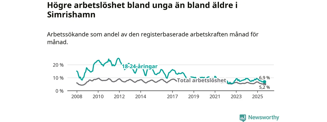 Precis som den totala arbetslösheten sjunker arbetslösheten bland unga (−1,2 procentenheter). I september var 6,9 procent av 18–24-åringarna inskrivna som arbetssökande (motsvarande 49 personer). Mäter vi antalet inskrivna ser vi en minskning med tio personer på ett års sikt.