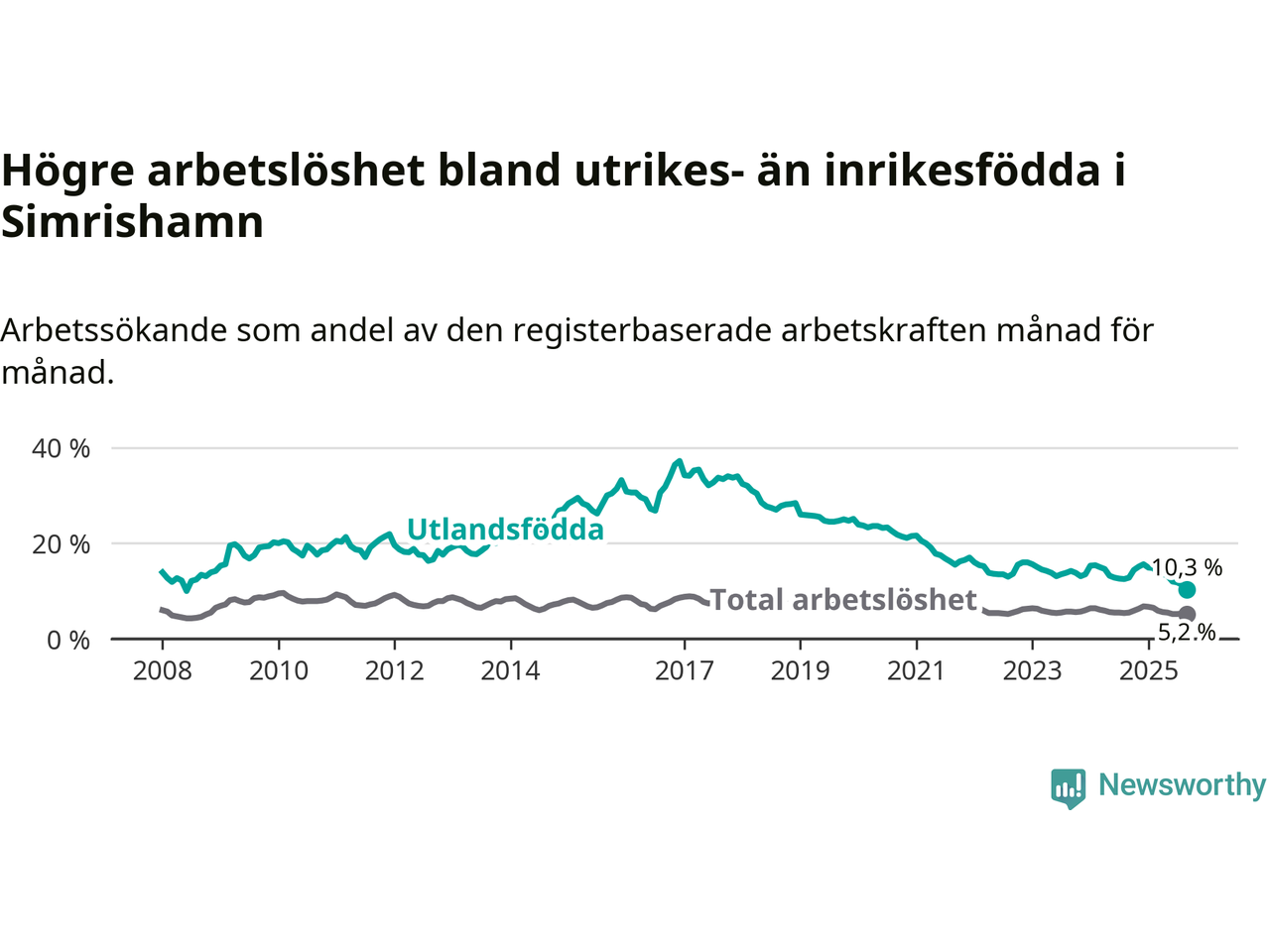 Skillnaden i arbetslöshet mellan utrikesfödda och hela befolkningen är 5,1 procentenheter i Simrishamn. Det är en betydligt mindre skillnad än för ett år sedan (−2,2 procentenheter).