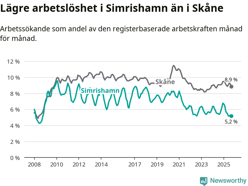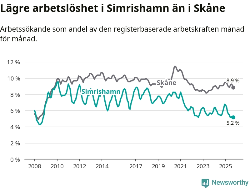 Det är sjunde månaden i följd som arbetslösheten i Simrishamn är lägre än den var under samma tidpunkt året innan. Sedan februari har arbetslösheten gått ner från 6,5 till 5,2 procent.