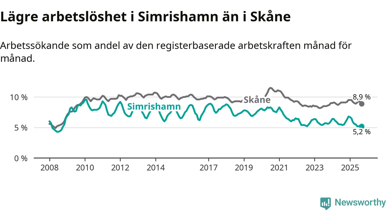 Under september månad rapporterade Simrishamns kommun en total arbetslöshet på 5,2 procent. Det är en minskning jämfört med samma tidpunkt i fjol (−0,3 procentenheter). Även i Skåne län sjunker arbetslösheten .