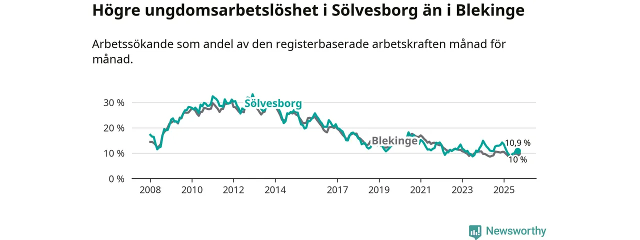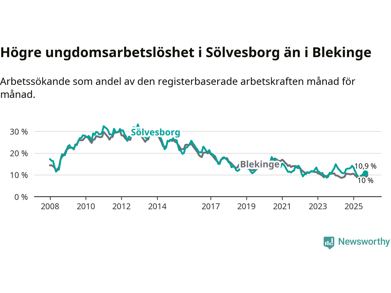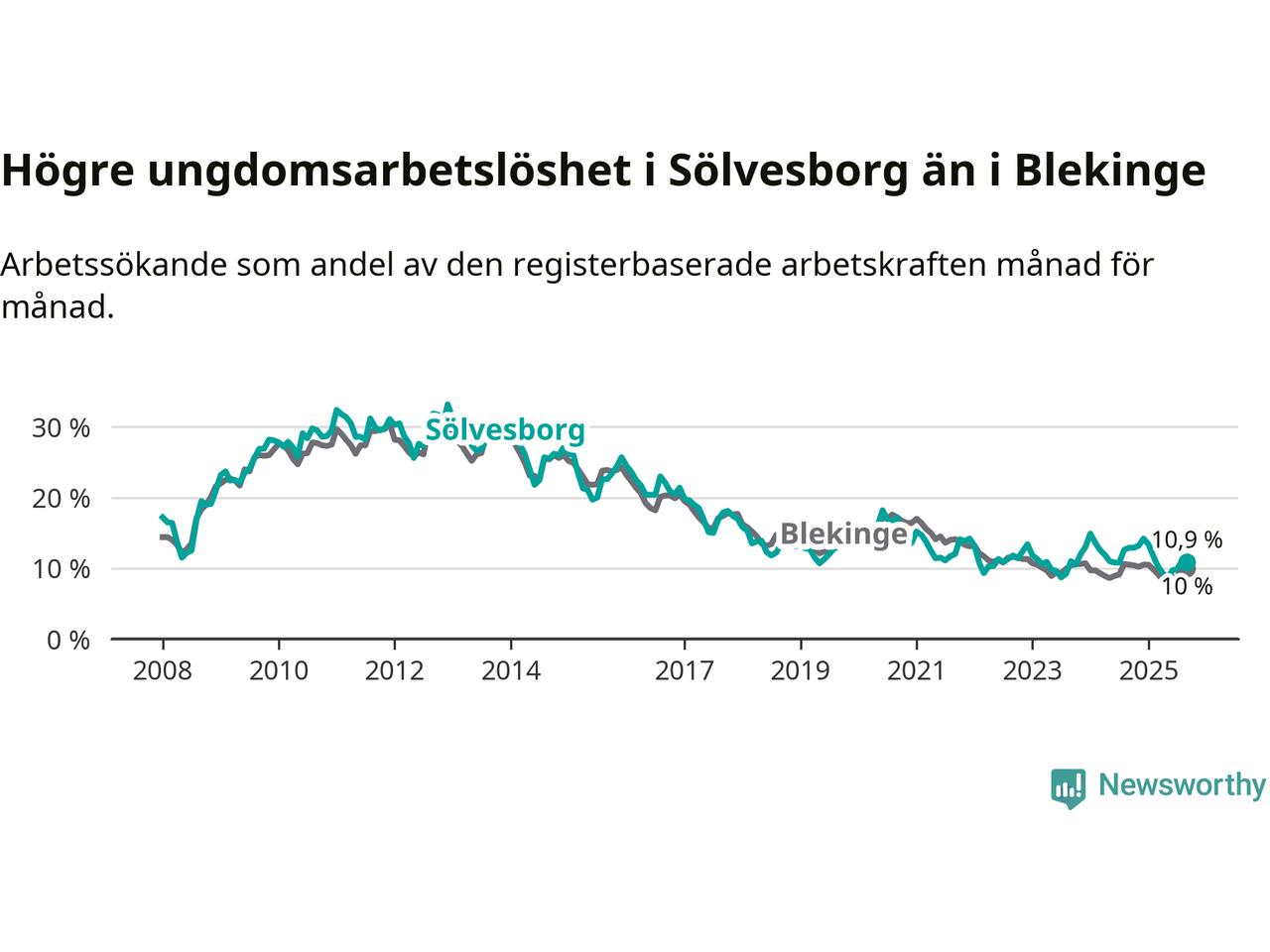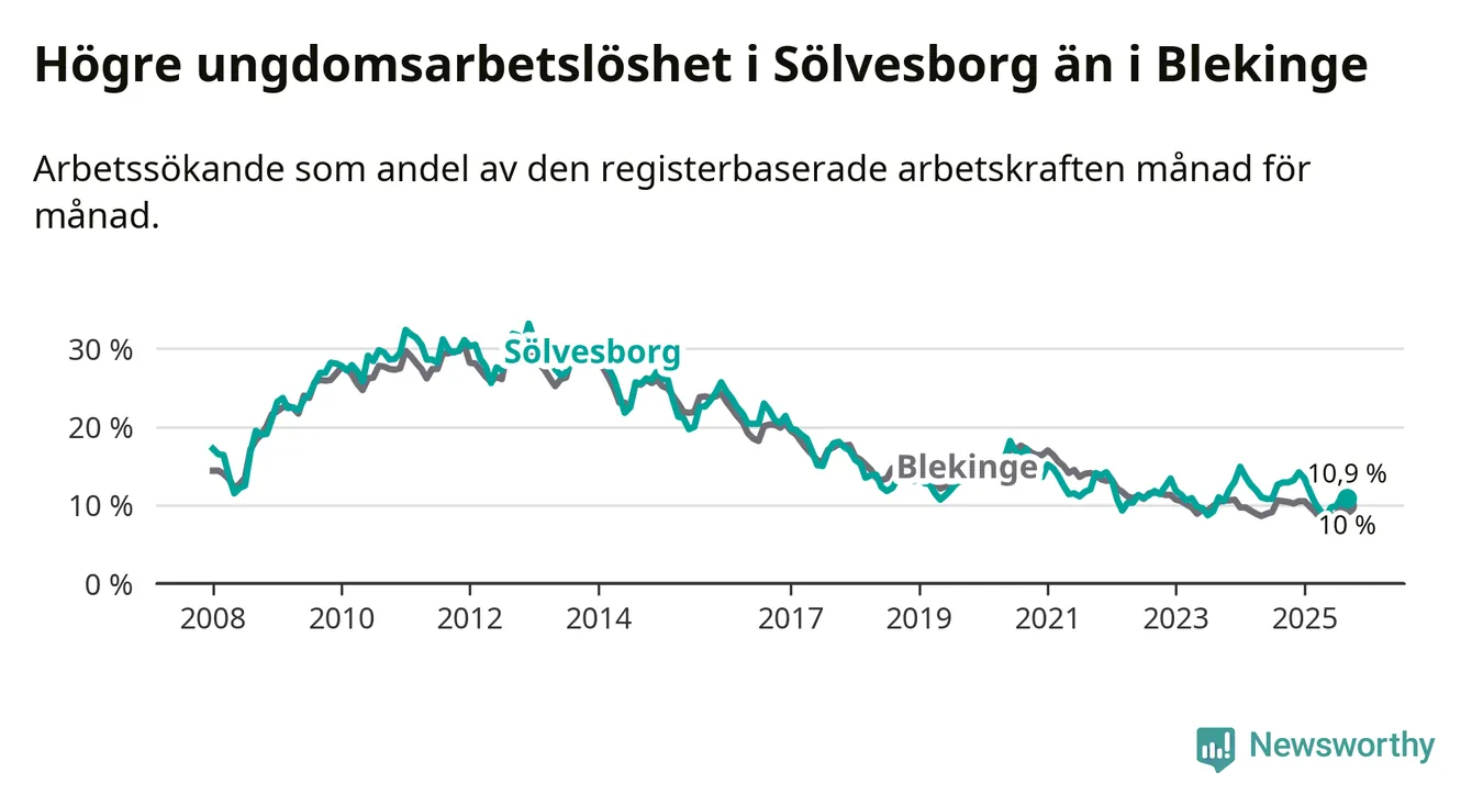 Medan Sölvesborg har lägre total arbetslöshet än Blekinge, ligger ungdomsarbetslösheten 0,9 procentenheter högre i Sölvesborg.