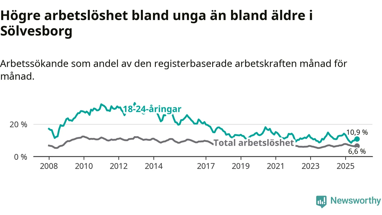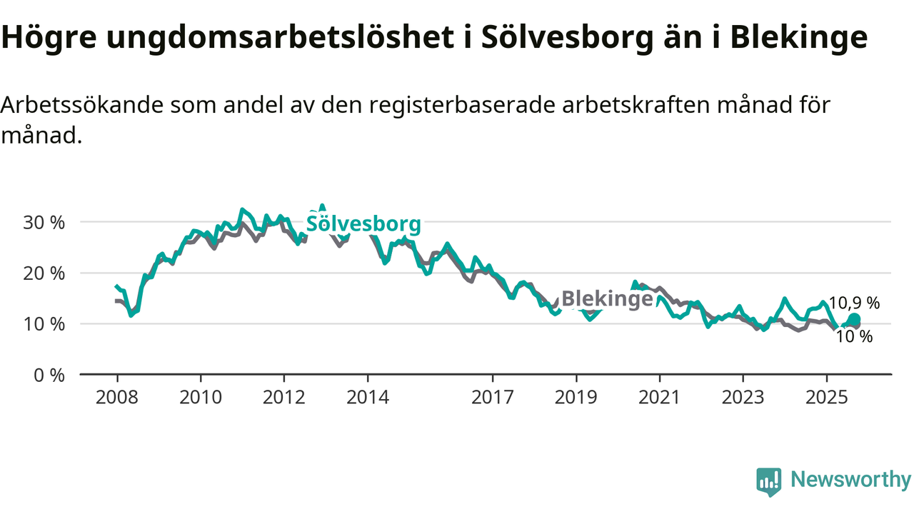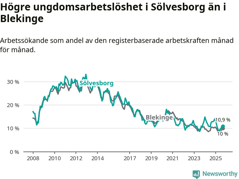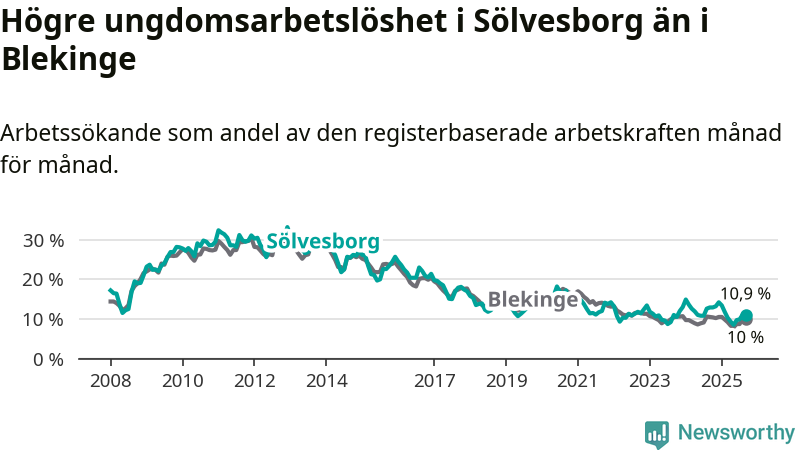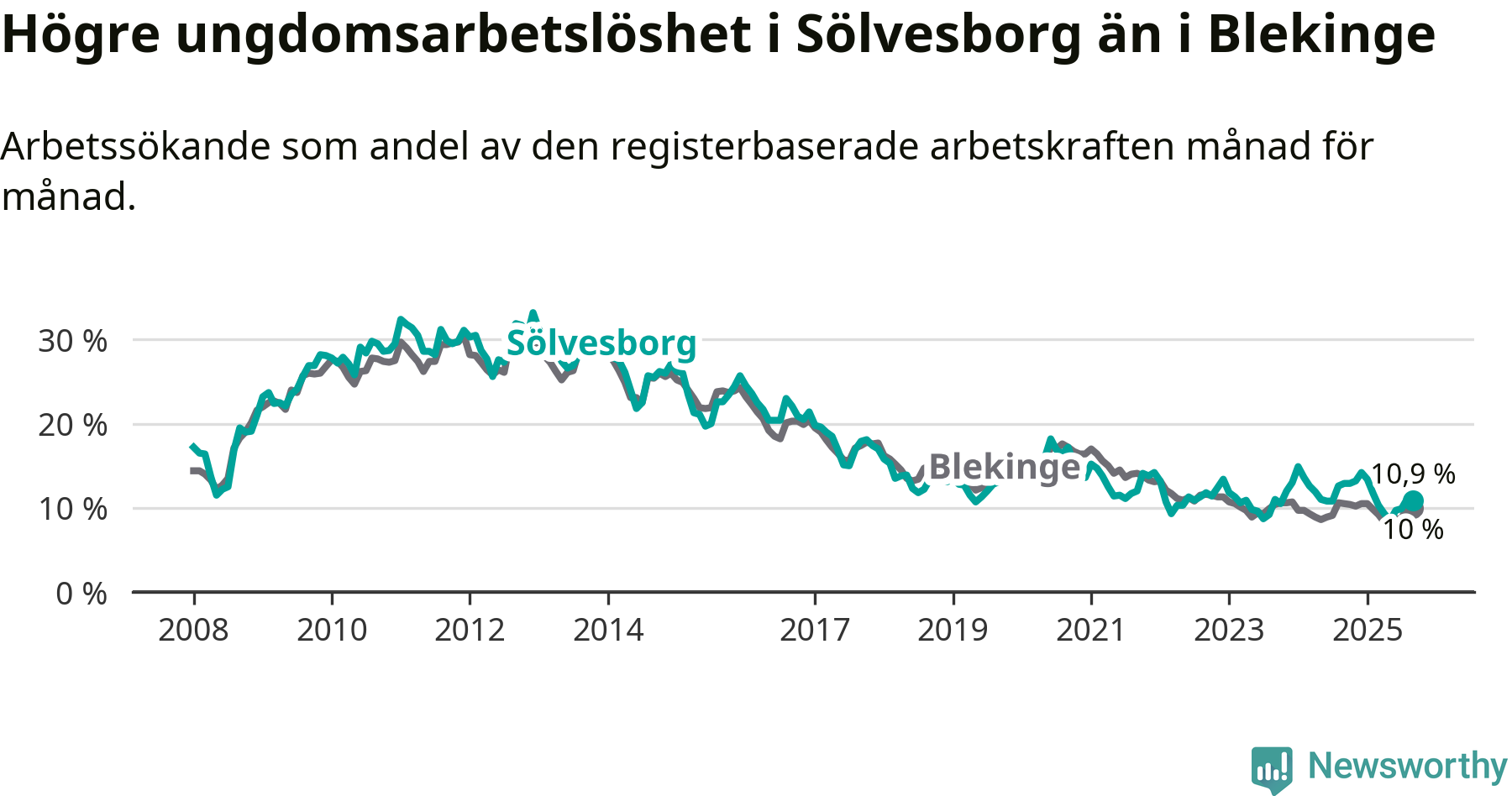 Medan Sölvesborg har lägre total arbetslöshet än Blekinge, ligger ungdomsarbetslösheten 0,9 procentenheter högre i Sölvesborg.