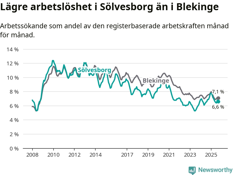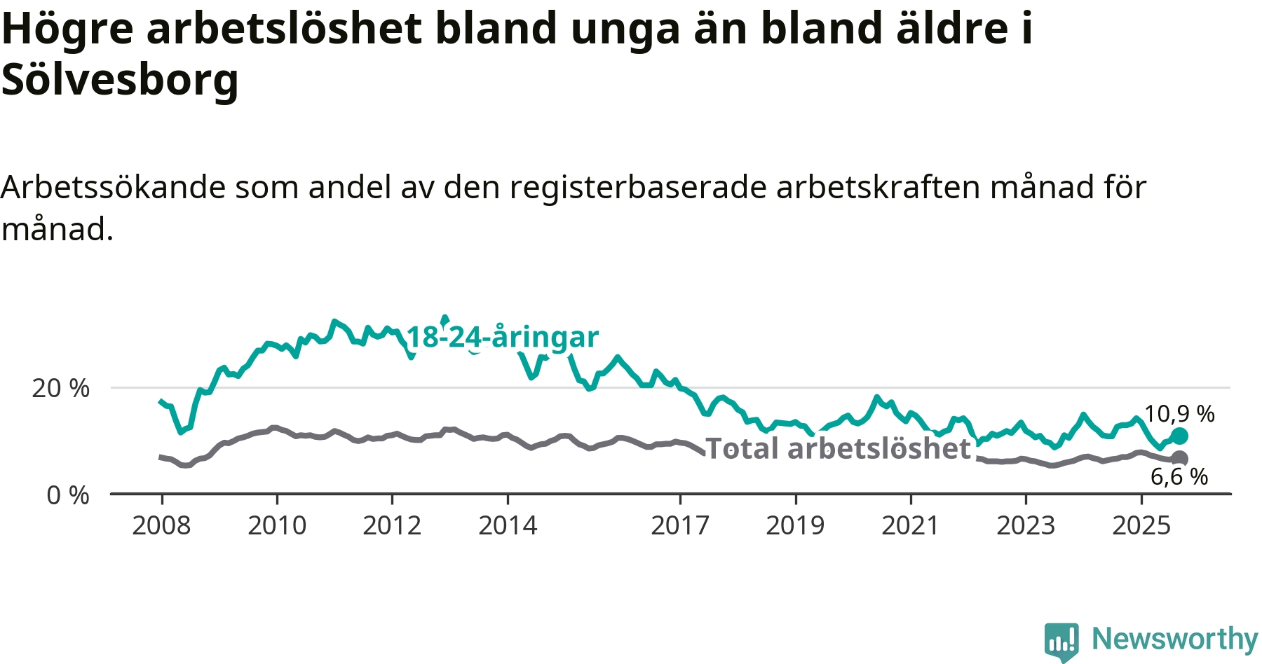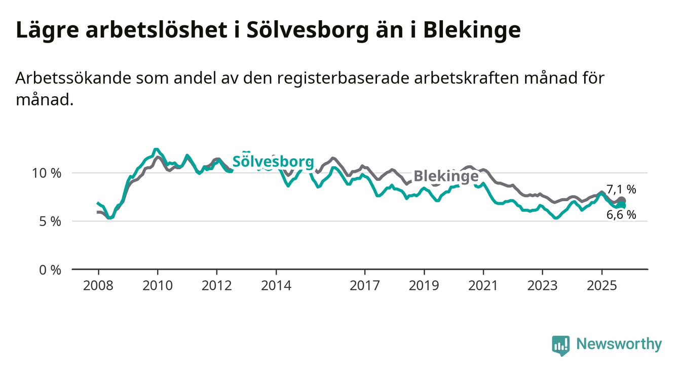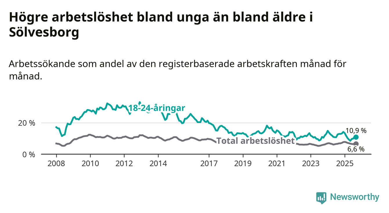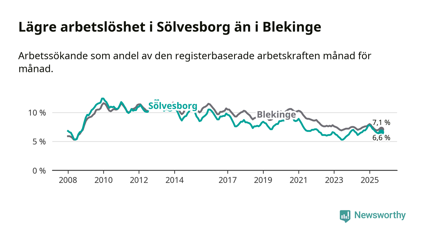 Medan Sölvesborg har lägre total arbetslöshet än Blekinge, ligger ungdomsarbetslösheten 0,9 procentenheter högre i Sölvesborg.