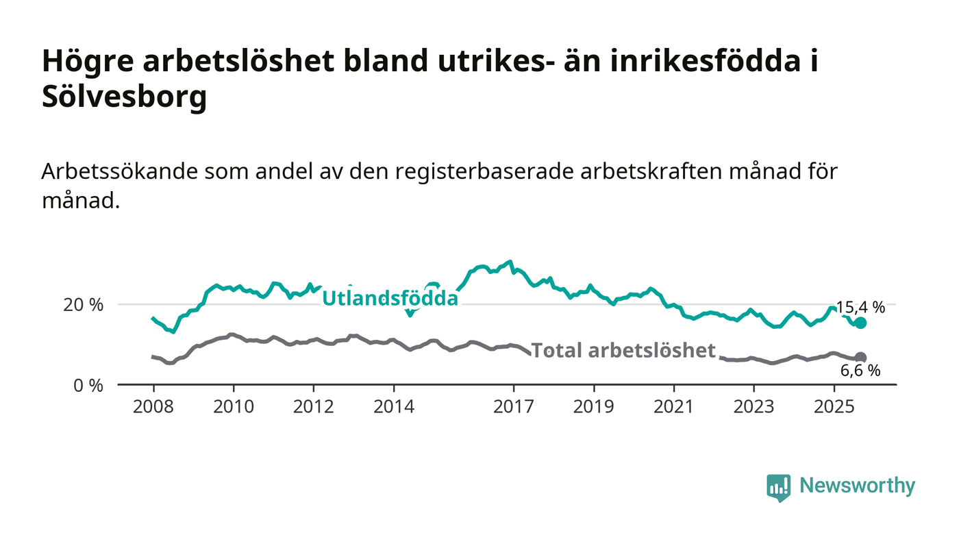 Arbetslösheten bland utlandsfödda var 15,4 procent i Sölvesborg under september månad, motsvarande 177 av 1 149 personer. Det är 0,5 procentenheter färre än vid samma tidpunkt i fjol (−9 om man räknar personer). Den senaste månadens nedgång innebär ett trendbrott. Under de ett föregående månaderna hade arbetslösheten bland utlandsfödda varit högre än motsvarande tidpunkt året innan.