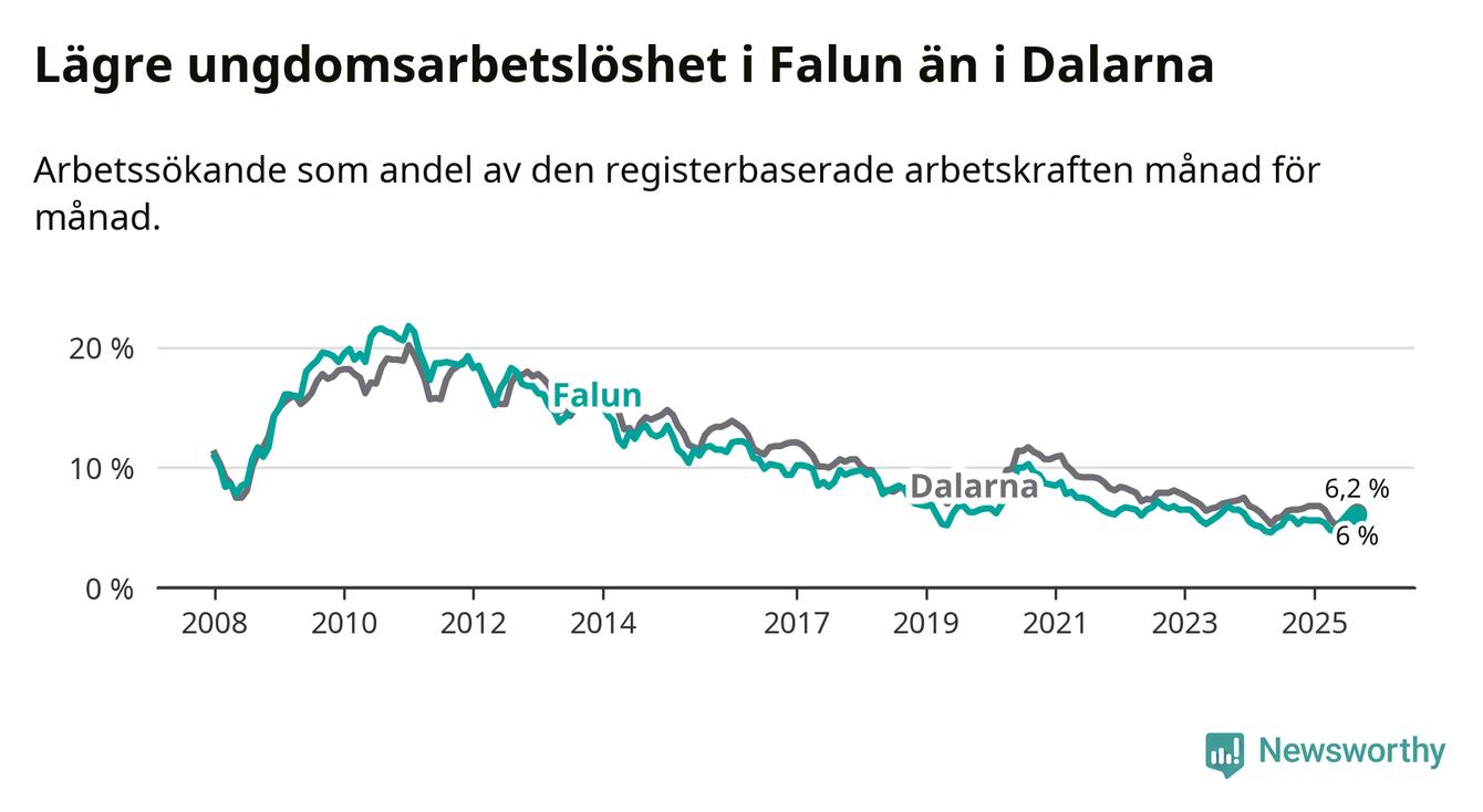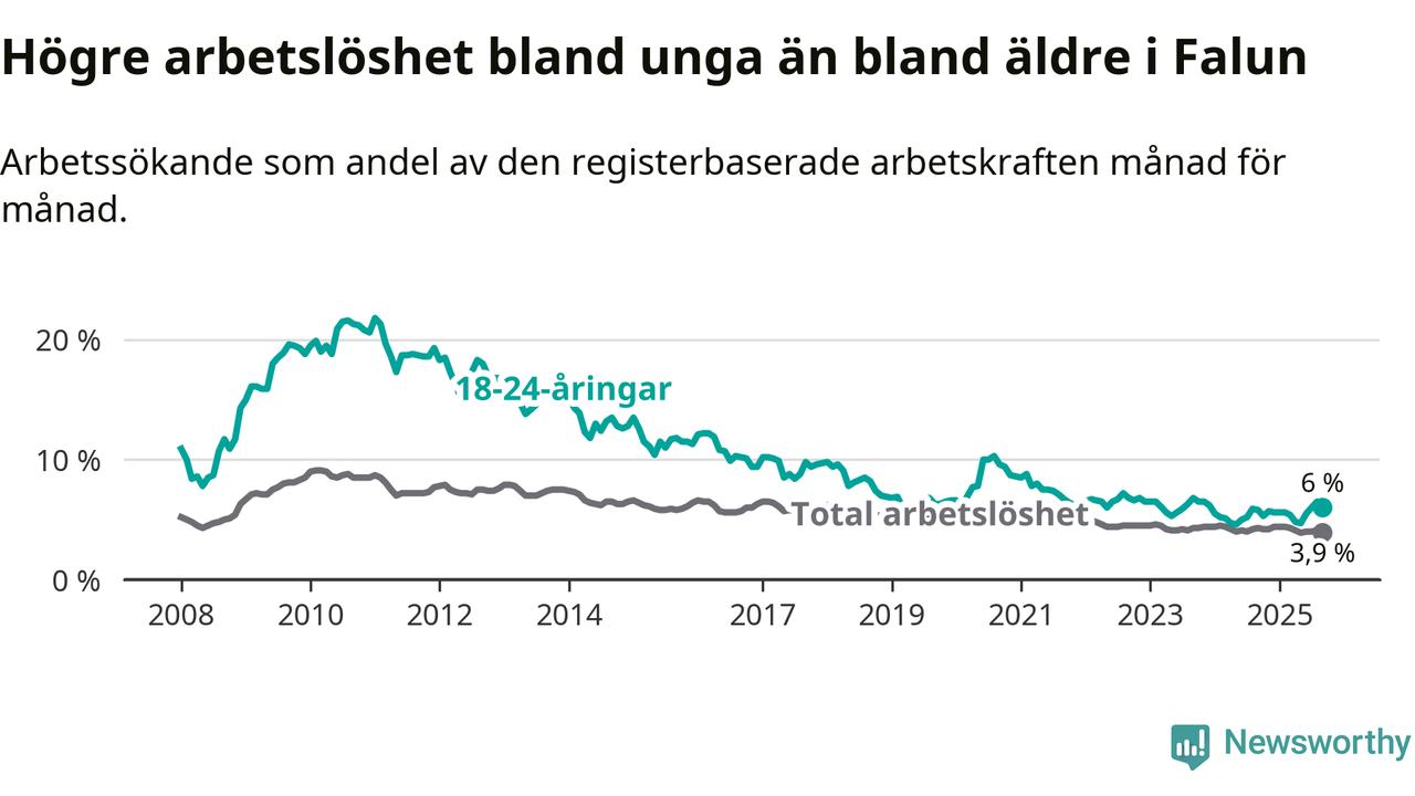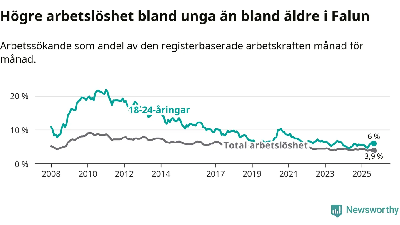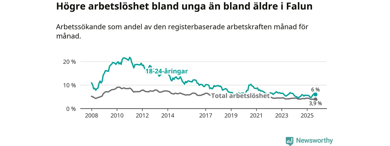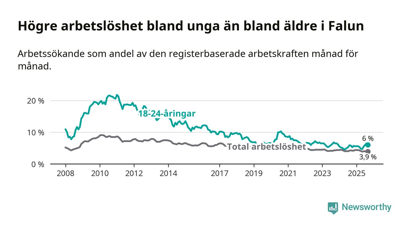 I och med den senaste månadens uppgång har de ungas arbetslöshet i Falun stigit nio månader i följd (upp från 5,6 procent i december 2024 till 6,0 procent nu).
