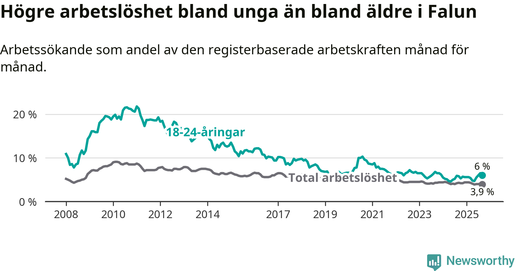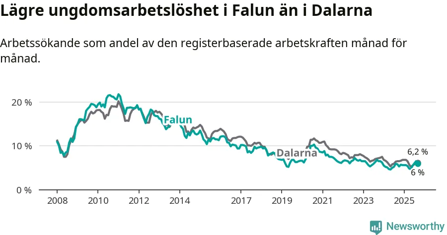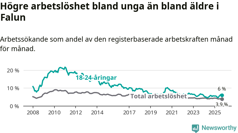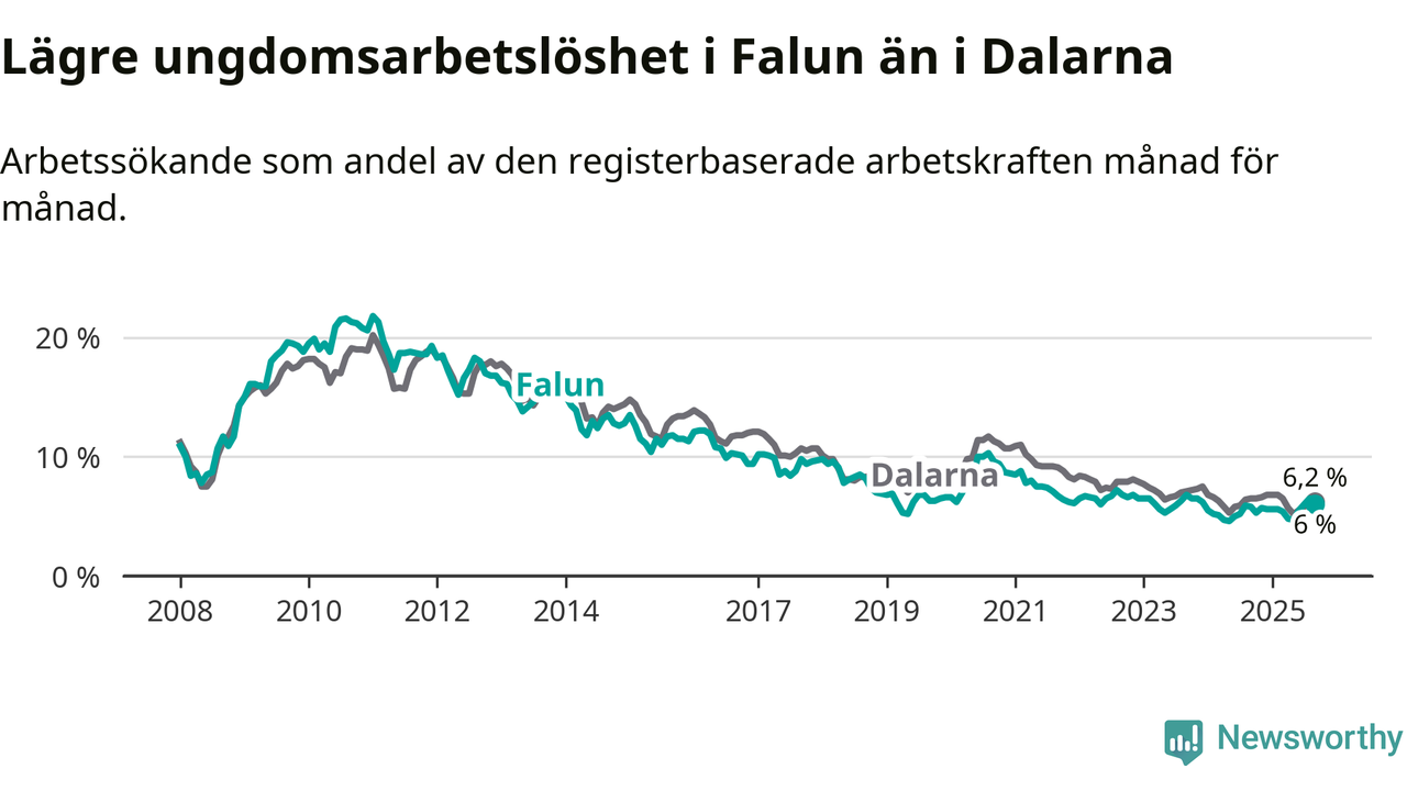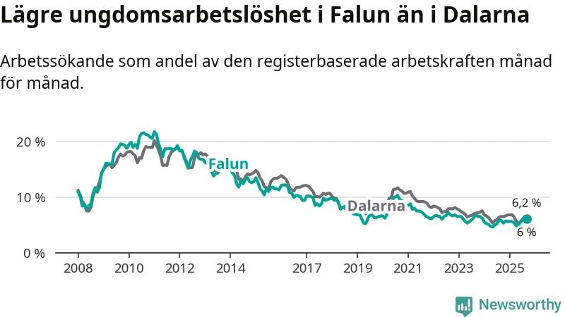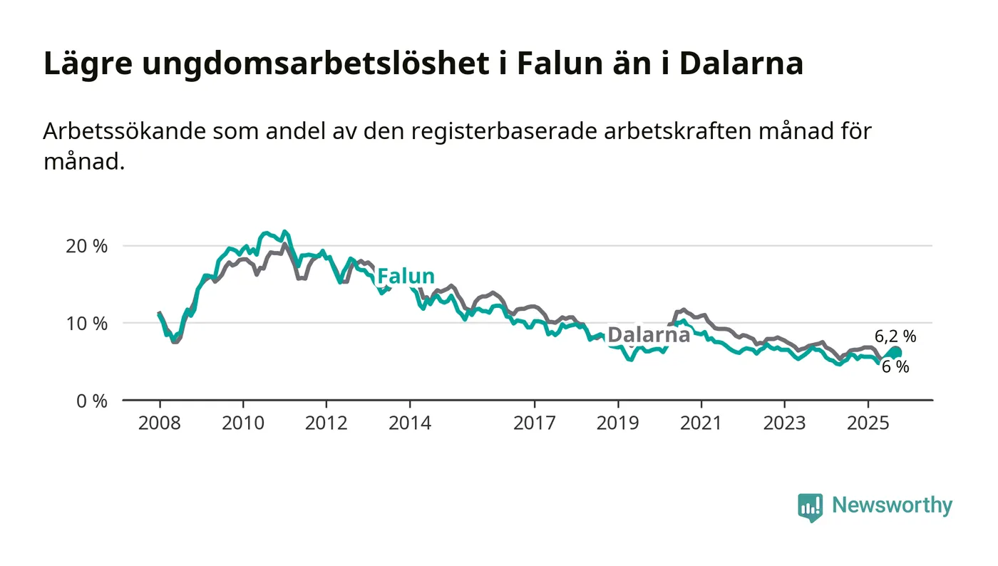 I och med den senaste månadens uppgång har de ungas arbetslöshet i Falun stigit nio månader i följd (upp från 5,6 procent i december 2024 till 6,0 procent nu).