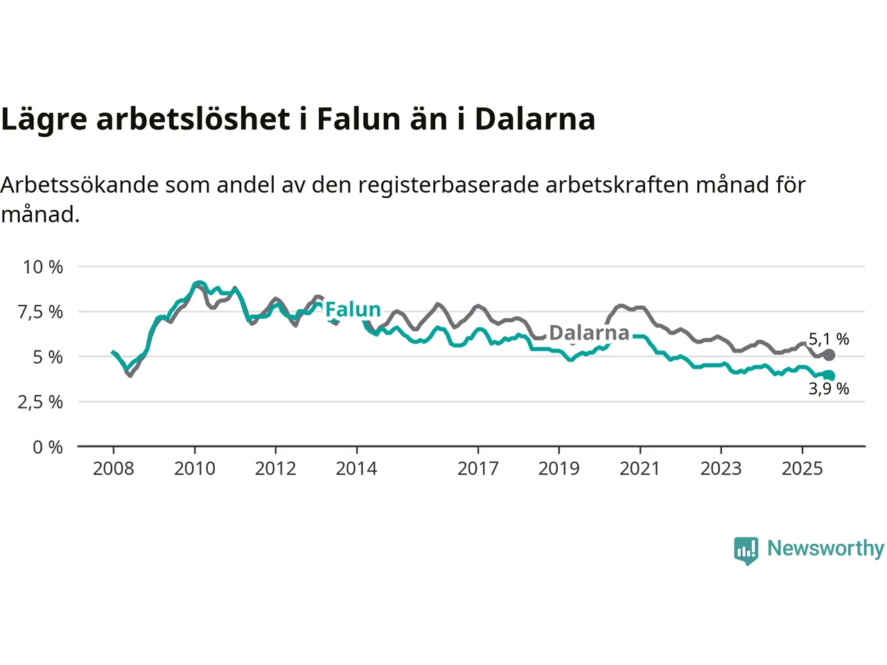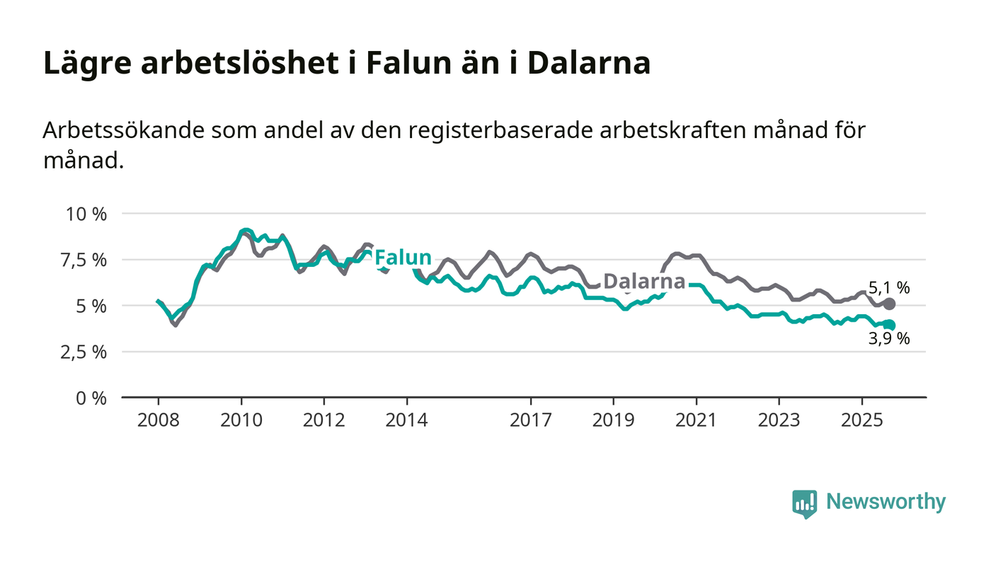 Falun hade redan tidigare lägre arbetslöshet än snittet i hela Dalarnas län och nu växer klyftan (3,9 procent i kommunen, jämfört med 5,1 procent i hela länet). Gagnef har den lägsta arbetslösheten i länet (3,1 procent), medan Avesta och Borlänge har den högsta (7,5 procent). För att Falun skulle komma ner i samma arbetslöshetsnivå som Gagnef skulle 235 personer behöva sysselsättas.