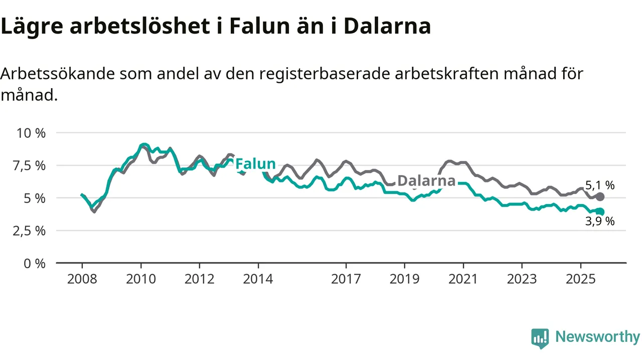 Under september månad rapporterade Falu kommun en total arbetslöshet på 3,9 procent. Det är en minskning jämfört med samma tidpunkt i fjol (−0,4 procentenheter). Även i Dalarnas län sjunker arbetslösheten .