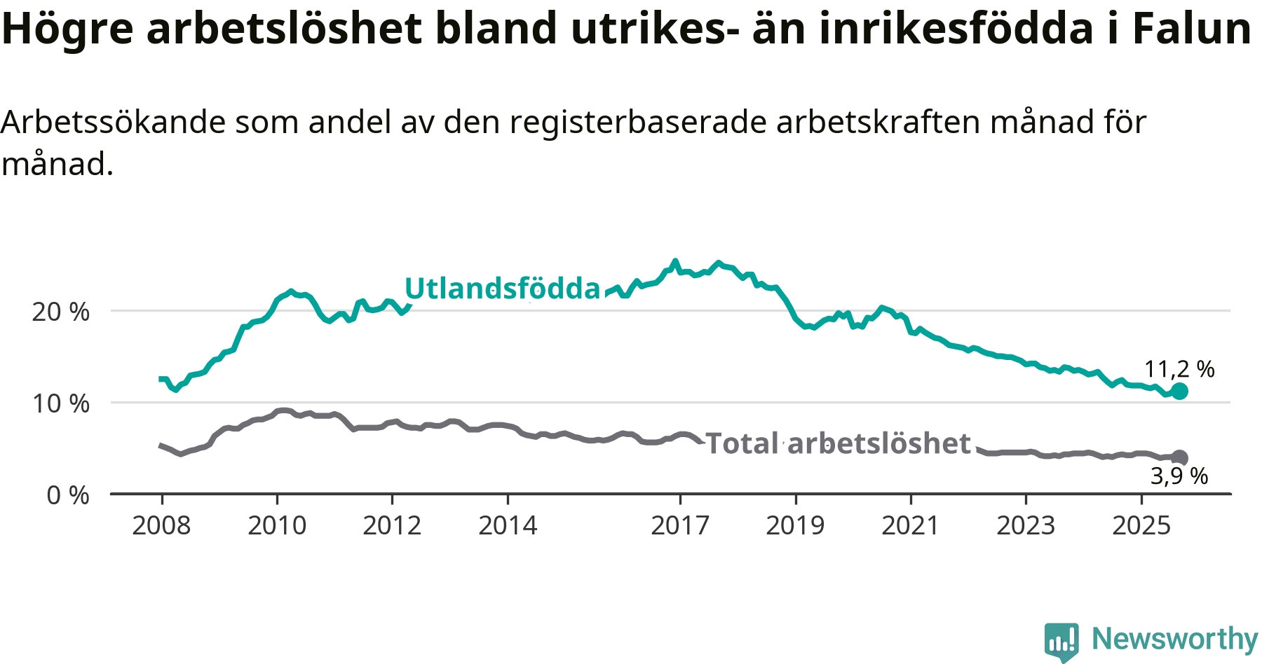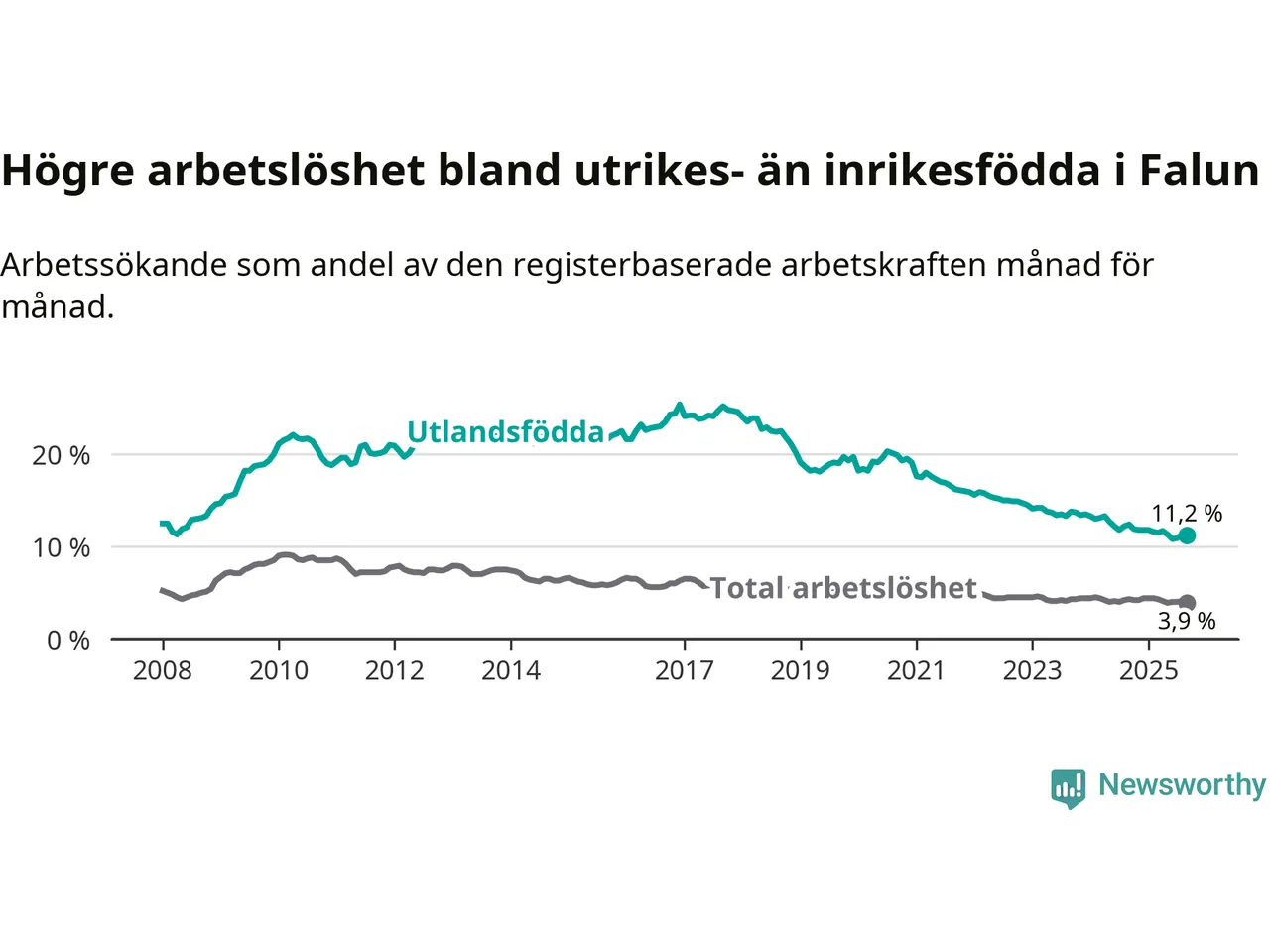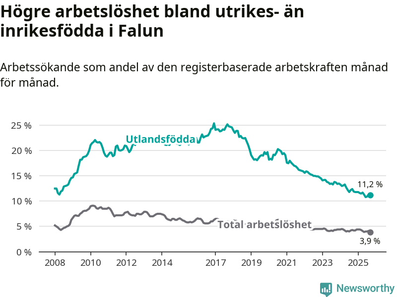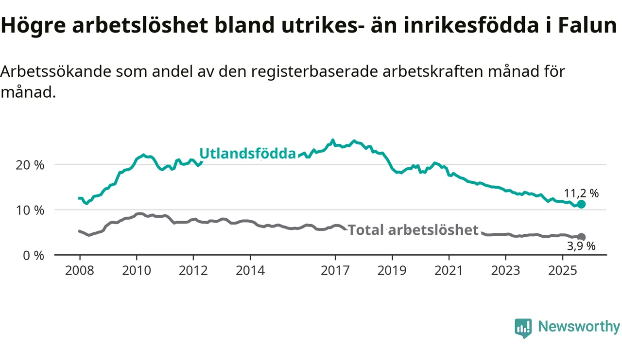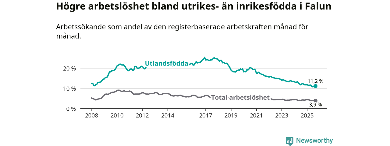 Skillnaden i arbetslöshet mellan utrikesfödda och hela befolkningen är 7,3 procentenheter i Falun. Det är en mindre skillnad än för ett år sedan (−0,8 procentenheter).