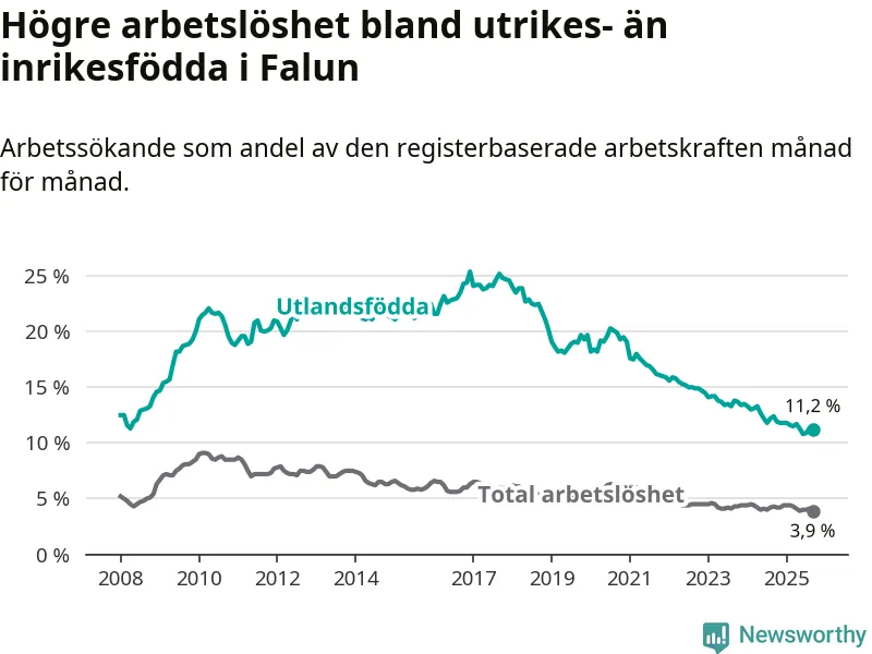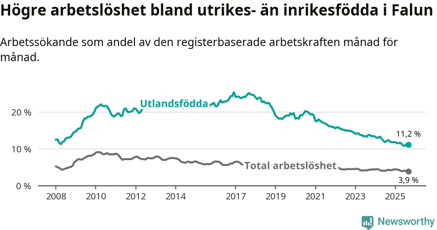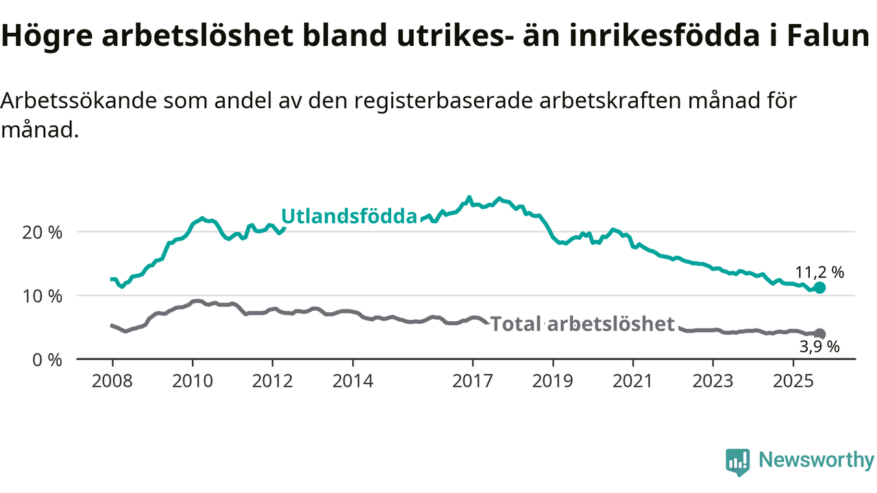 Arbetslösheten bland utlandsfödda var 11,2 procent i Falun under september månad, motsvarande 419 av 3 741 personer. Det är 1,2 procentenheter färre än vid samma tidpunkt i fjol (−51 om man räknar personer). Därmed har de utlandsföddas arbetslöshet varit lägre än vid samma tidpunkt i fjol i över fyra år i sträck. Sedan november 2020 har arbetslösheten bland utlandsfödda minskat från 19,5 till 11,2 procent.