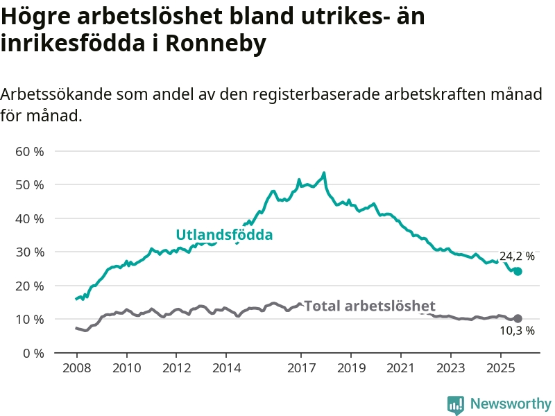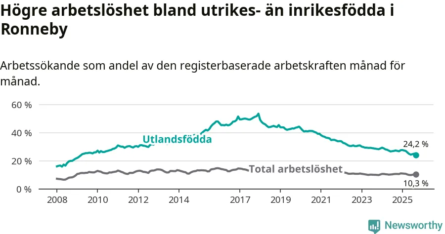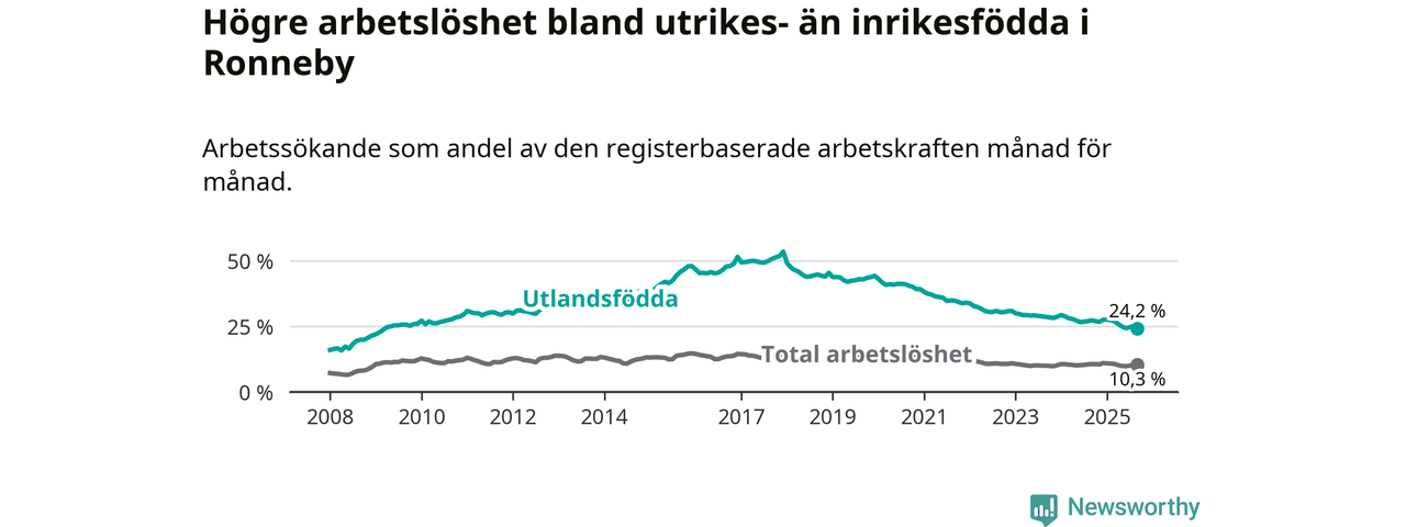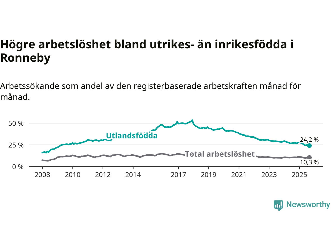 Skillnaden i arbetslöshet mellan utrikesfödda och hela befolkningen är 13,9 procentenheter i Ronneby. Det är en betydligt mindre skillnad än för ett år sedan (−2,8 procentenheter).