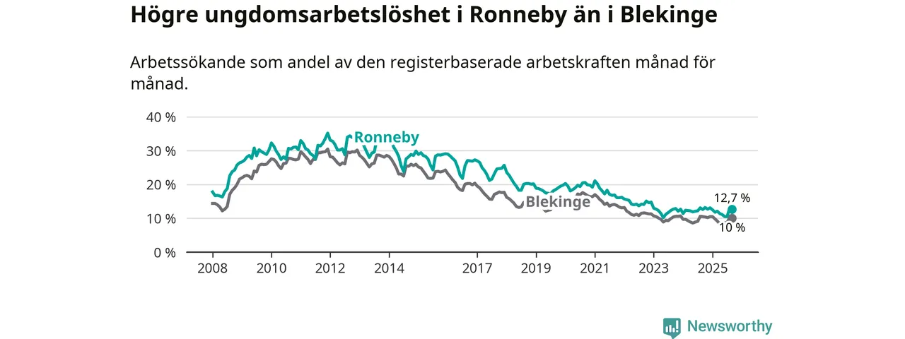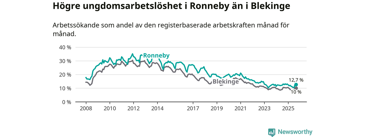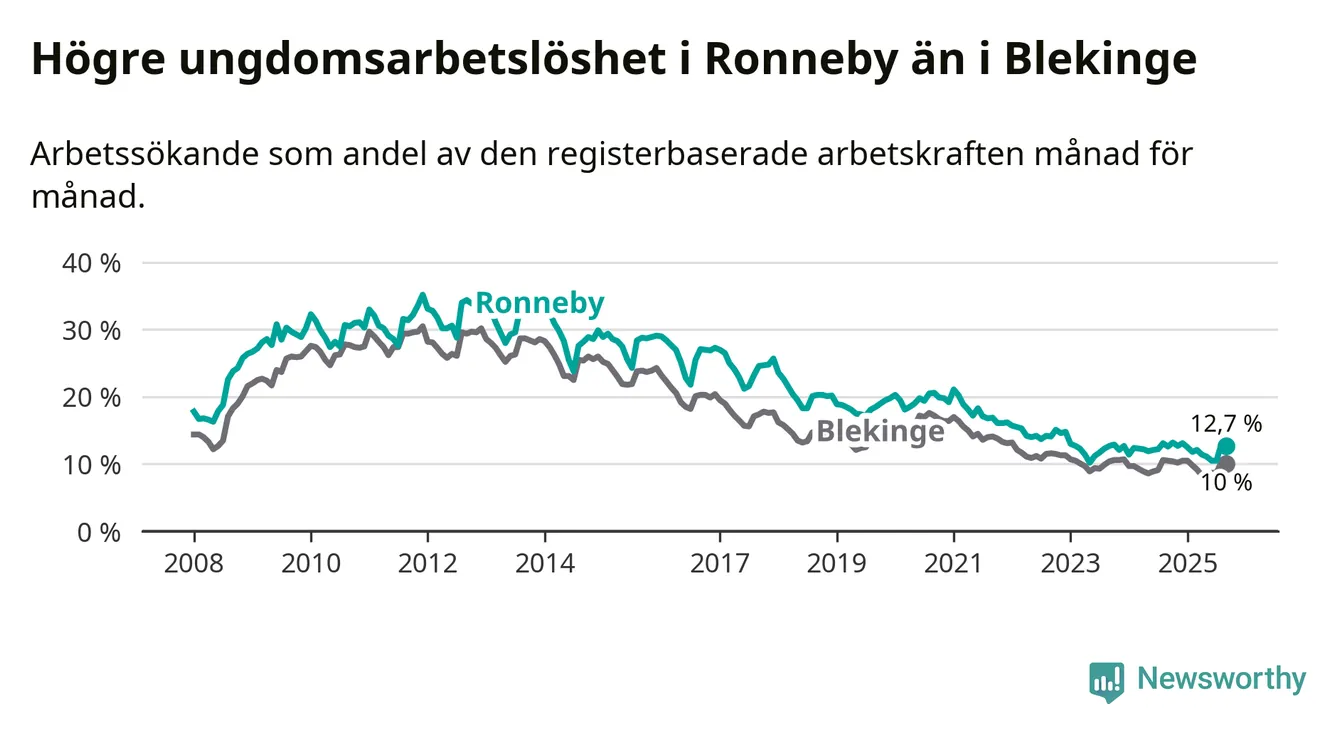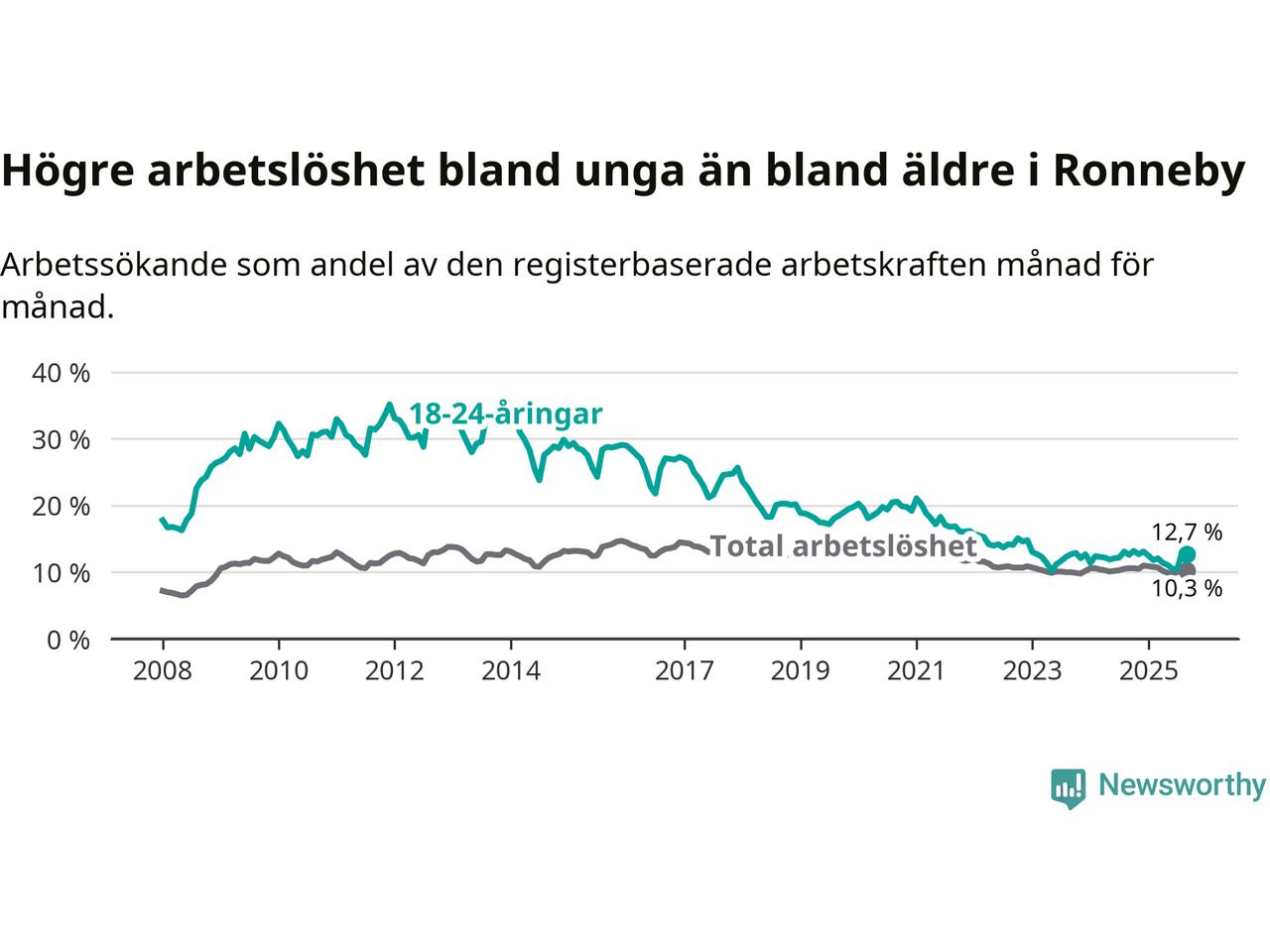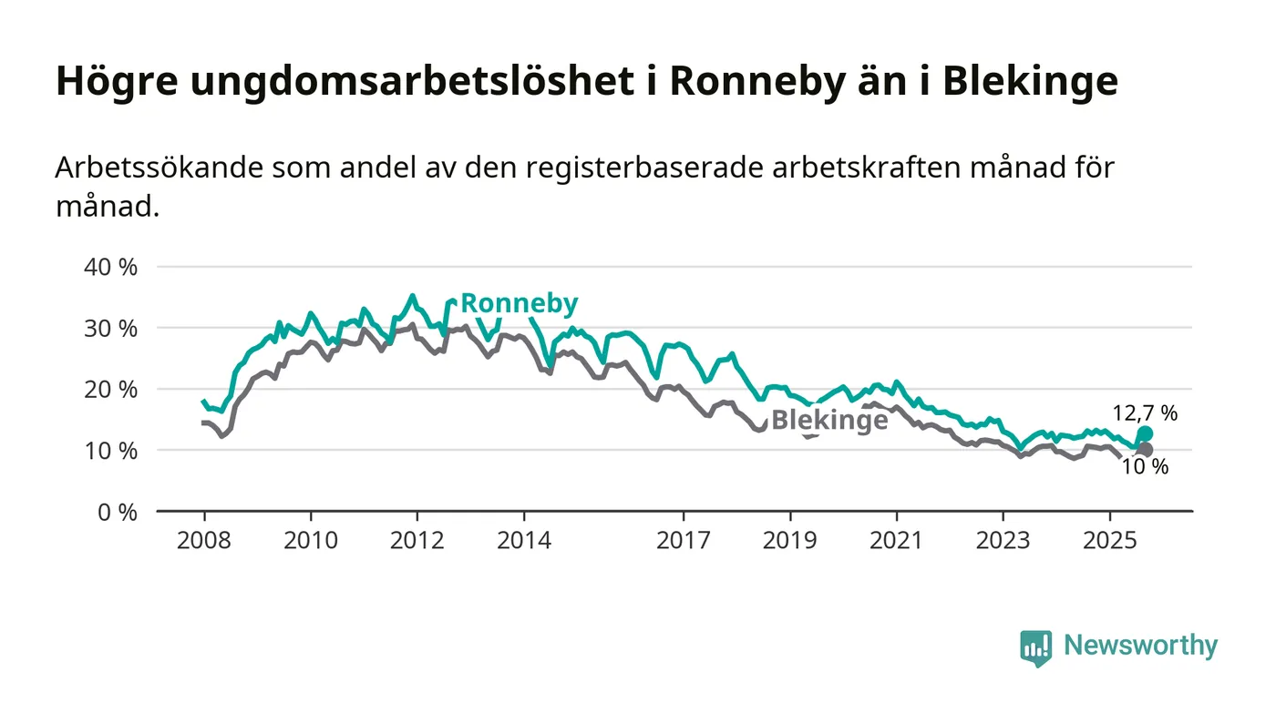 Precis som den totala arbetslösheten ligger ungdomsarbetslösheten i Ronneby högre än i Blekinge som helhet. Skillnaden mellan kommunen och länet är 2,7 procentenheter.