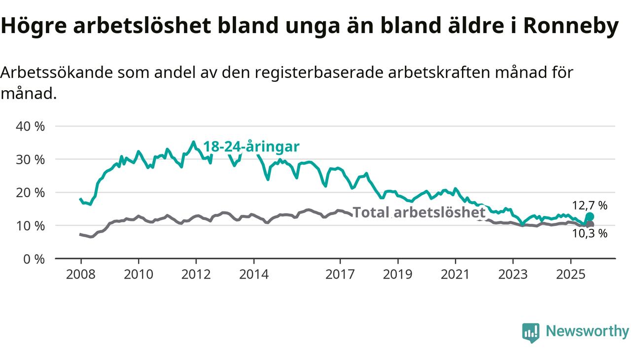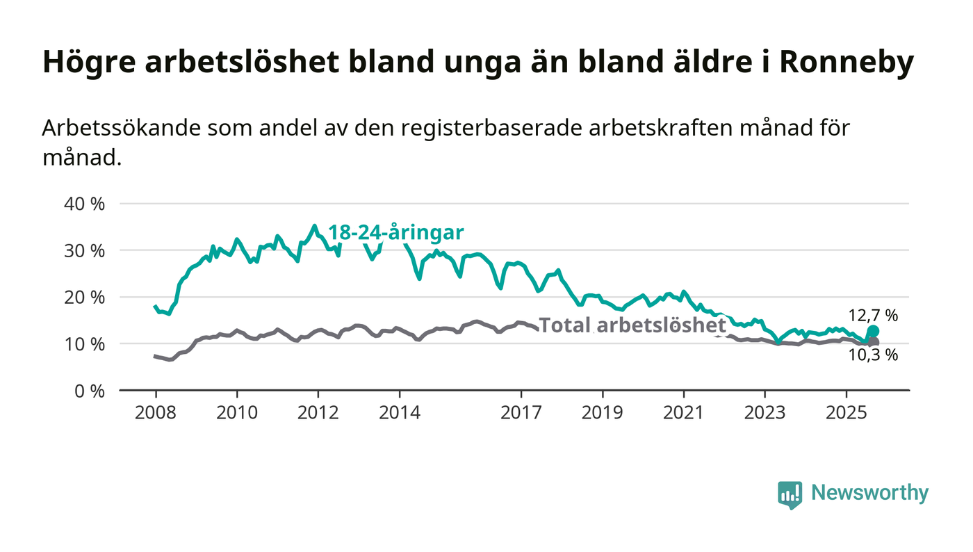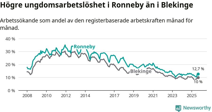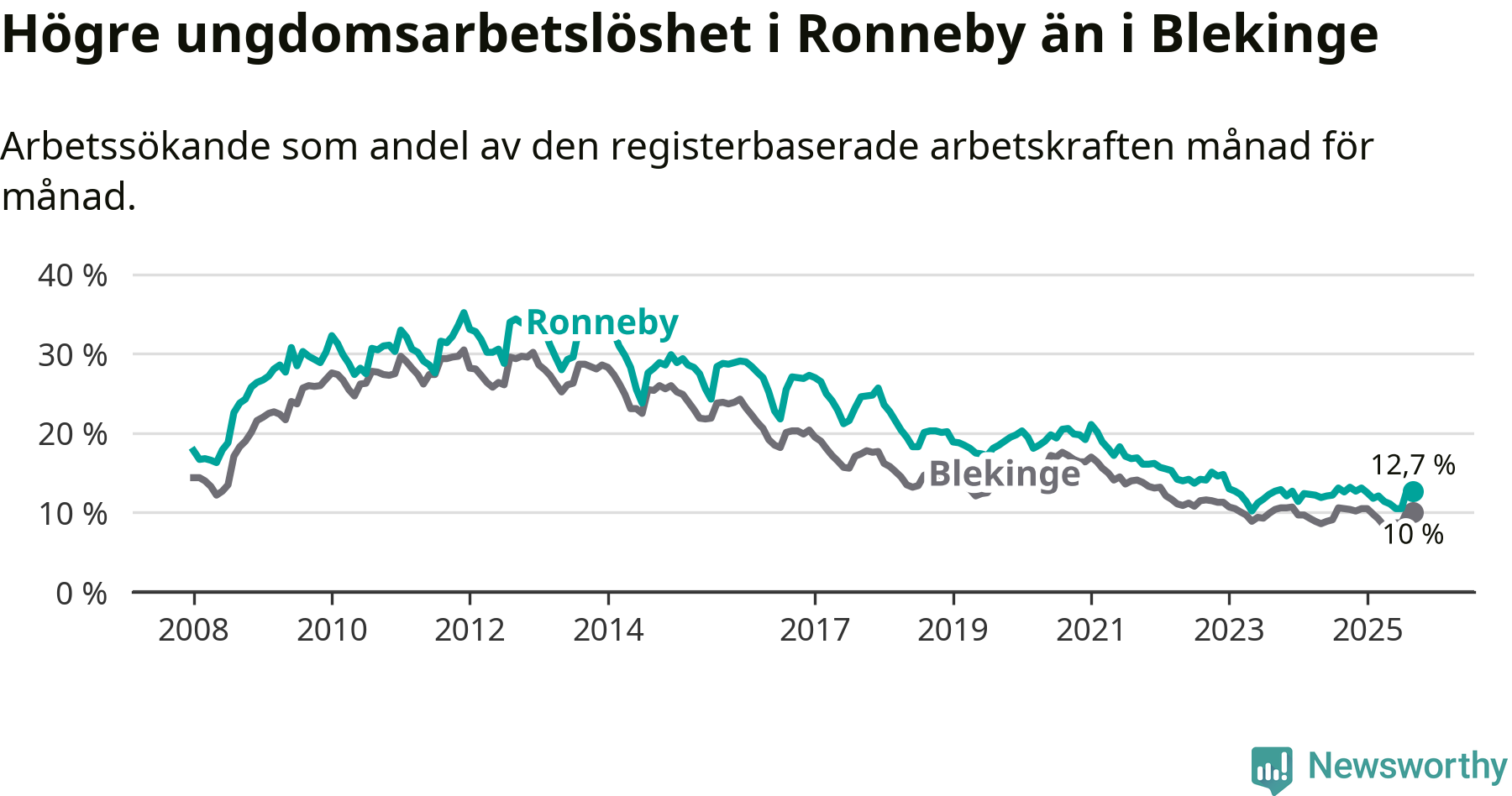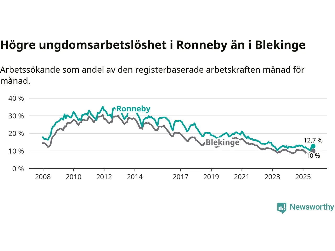 Precis som den totala arbetslösheten ligger ungdomsarbetslösheten i Ronneby högre än i Blekinge som helhet. Skillnaden mellan kommunen och länet är 2,7 procentenheter.