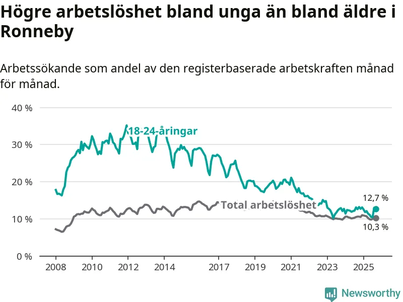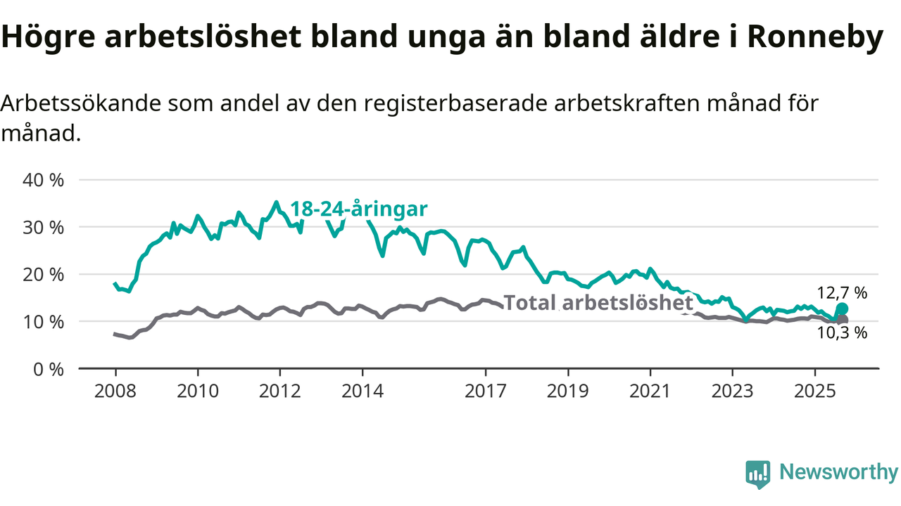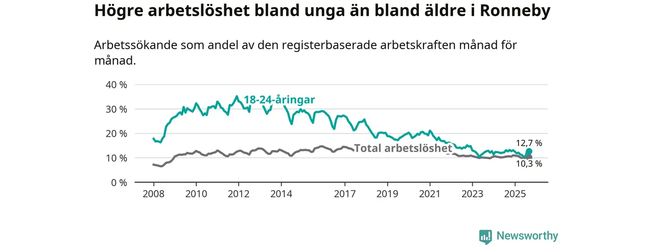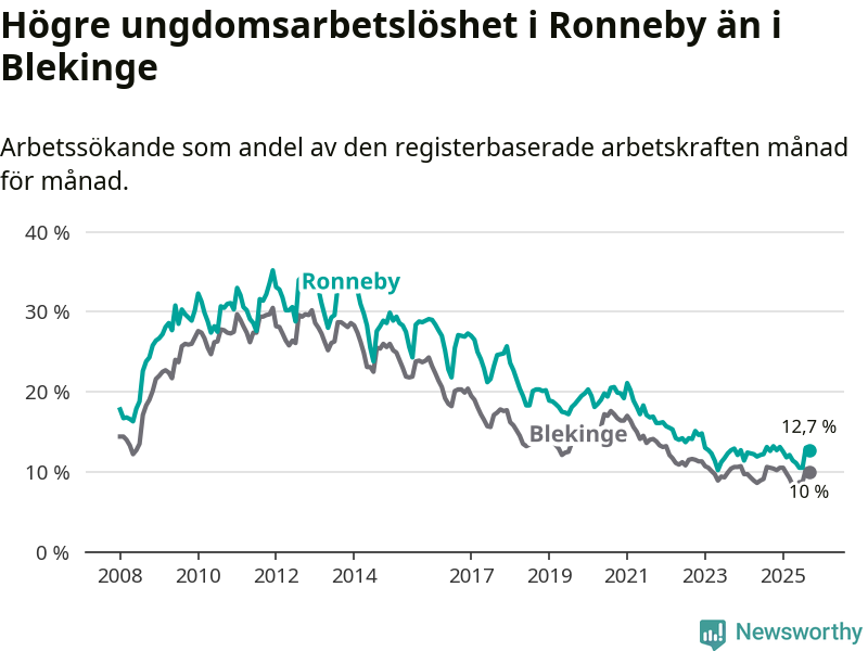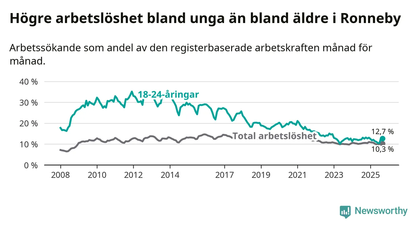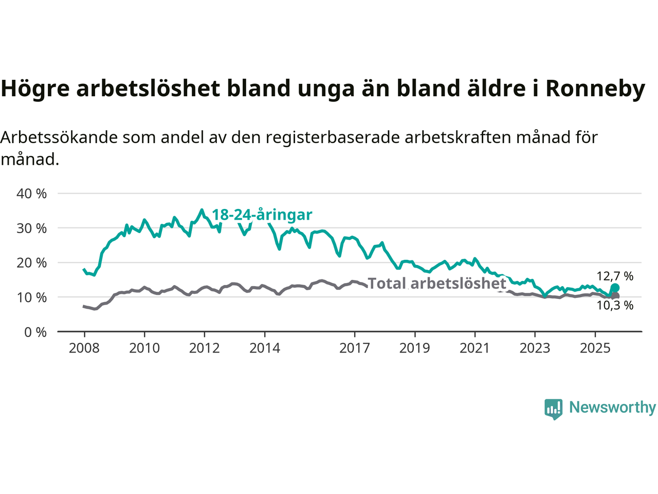 Precis som den totala arbetslösheten ligger ungdomsarbetslösheten i Ronneby högre än i Blekinge som helhet. Skillnaden mellan kommunen och länet är 2,7 procentenheter.