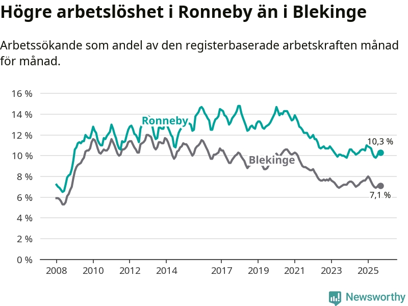 Under september månad rapporterade Ronneby kommun en total arbetslöshet på 10,3 procent. Det är en minskning jämfört med samma tidpunkt i fjol (−0,3 procentenheter). Även i Blekinge län sjunker arbetslösheten .