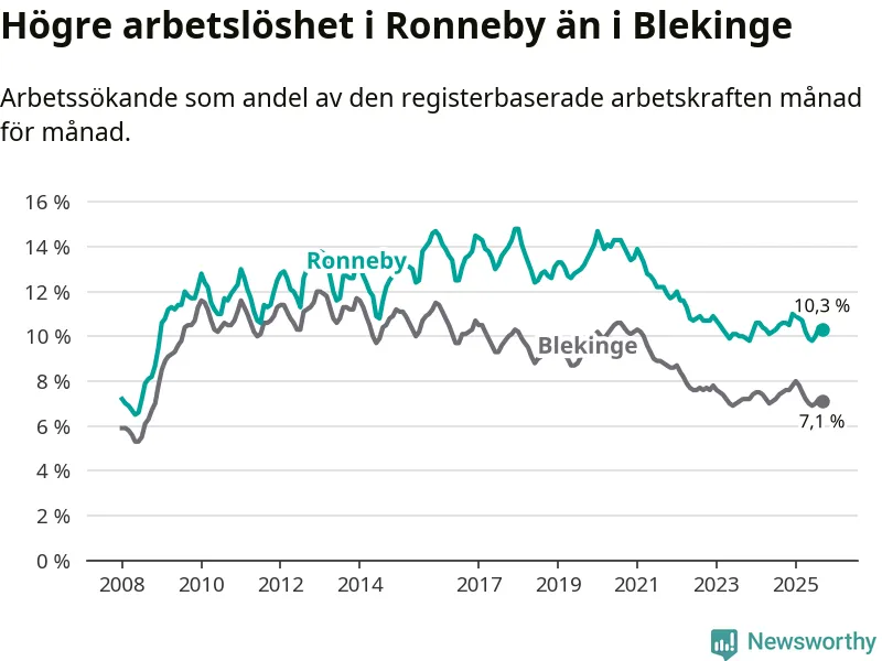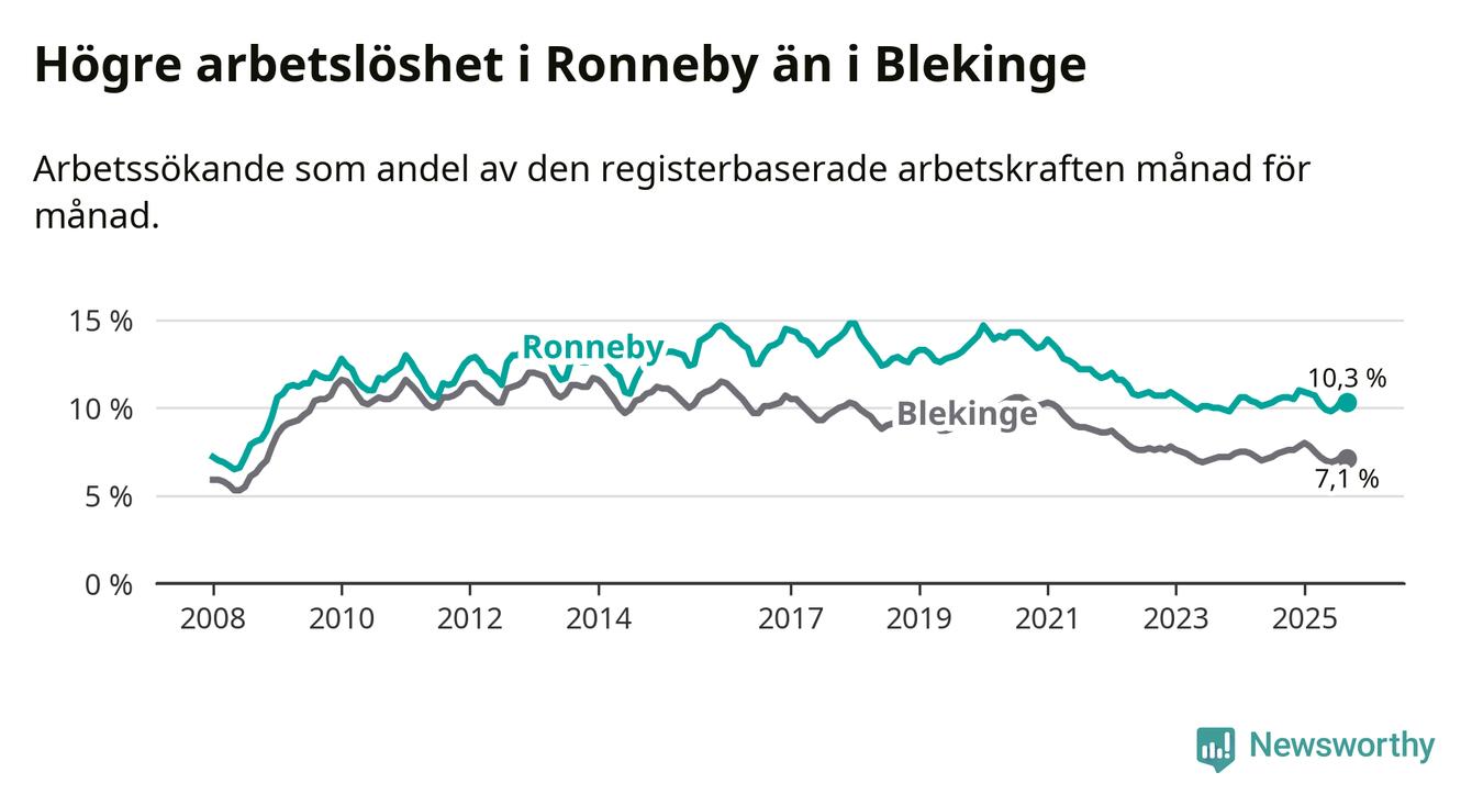 Även om arbetslösheten i Ronneby alltså minskar, så ligger den fortfarande över snittet i hela Blekinge län (10,3 procent i kommunen, jämfört med 7,1 procent i hela länet). Ronneby har därmed även den högsta arbetslöshetsnivån i länet. Karlskrona har den lägsta (5,4 procent). För att Ronneby skulle komma ner i samma arbetslöshetsnivå som Karlskrona skulle 645 personer behöva sysselsättas.