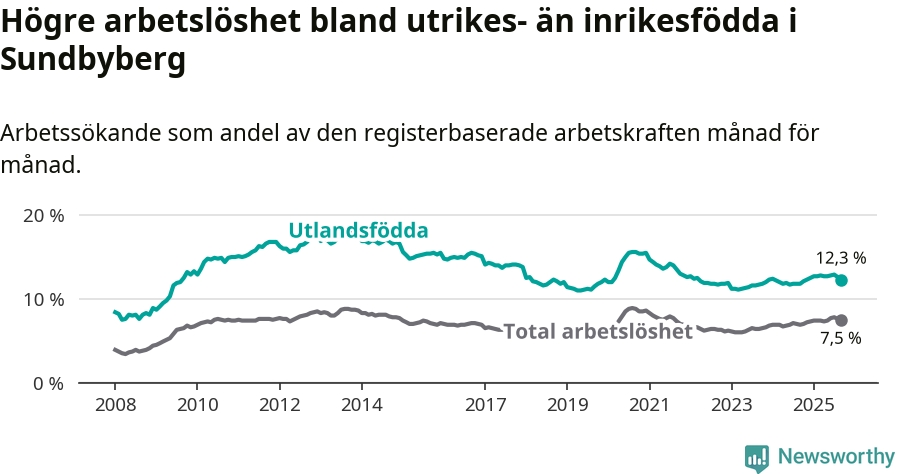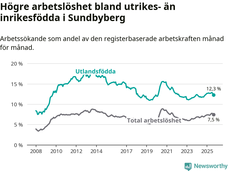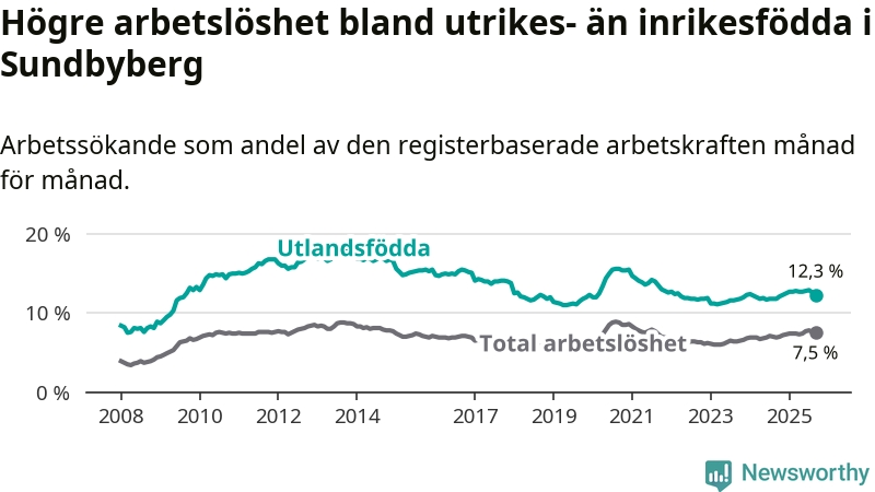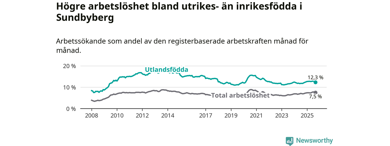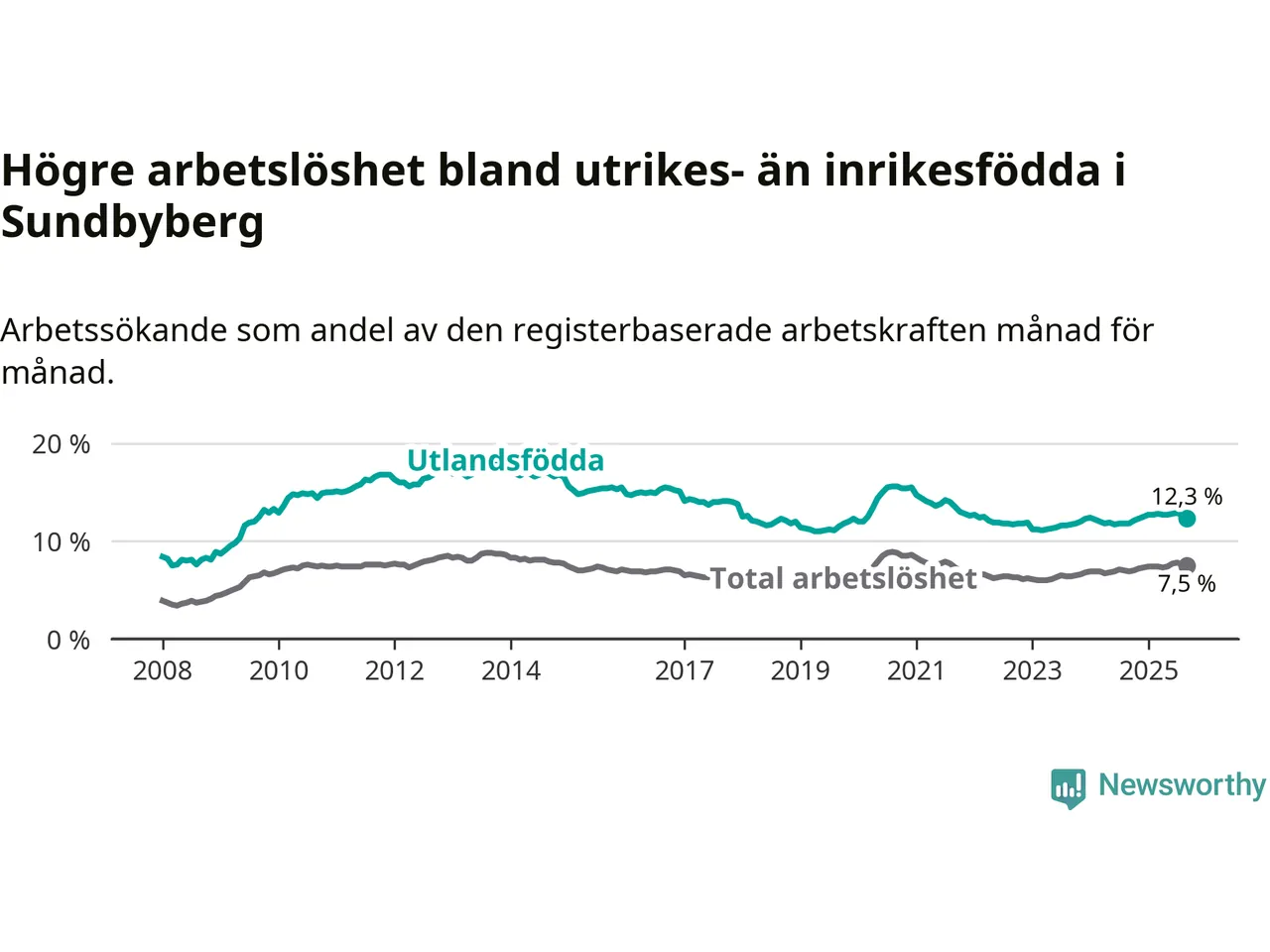 Arbetslösheten bland utlandsfödda var 12,3 procent i Sundbyberg under september månad, motsvarande 1 560 av 12 683 personer. Det är 0,5 procentenheter fler än vid samma tidpunkt i fjol (+103 om man räknar personer). Därmed är de utlandsföddas arbetslöshet högre än vid samma tidpunkt i fjol för 23:e månaden i följd.