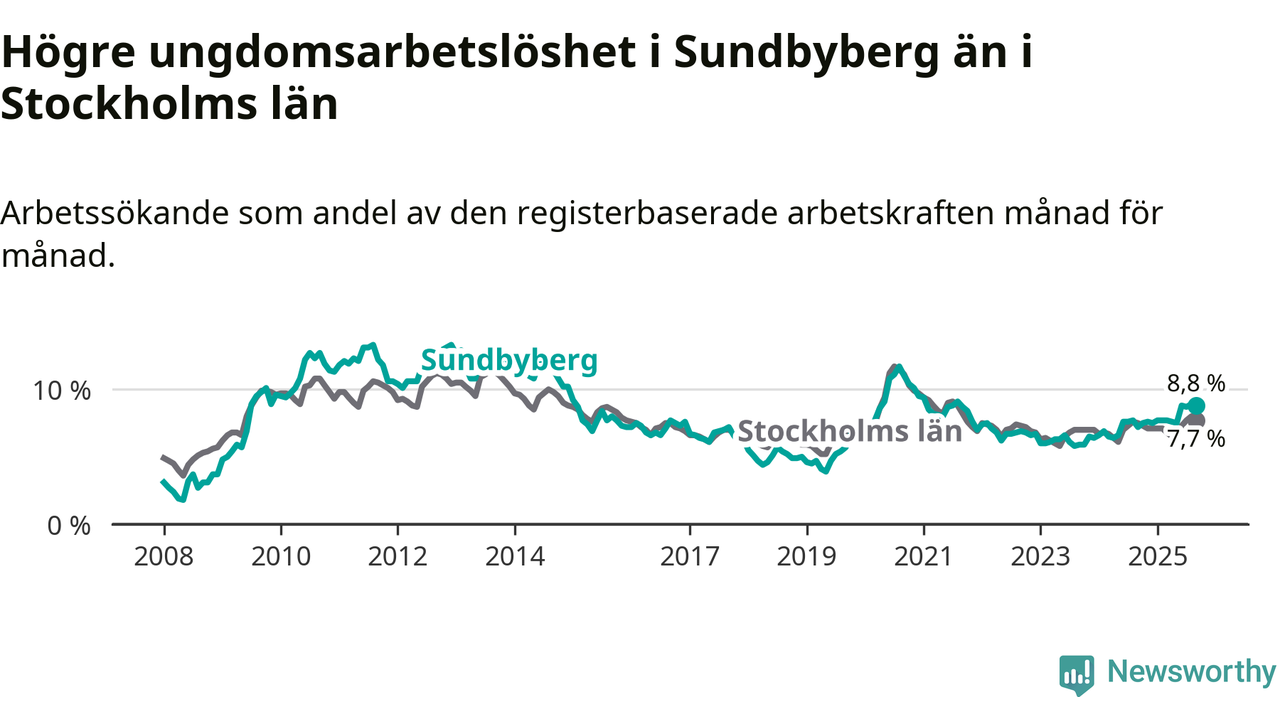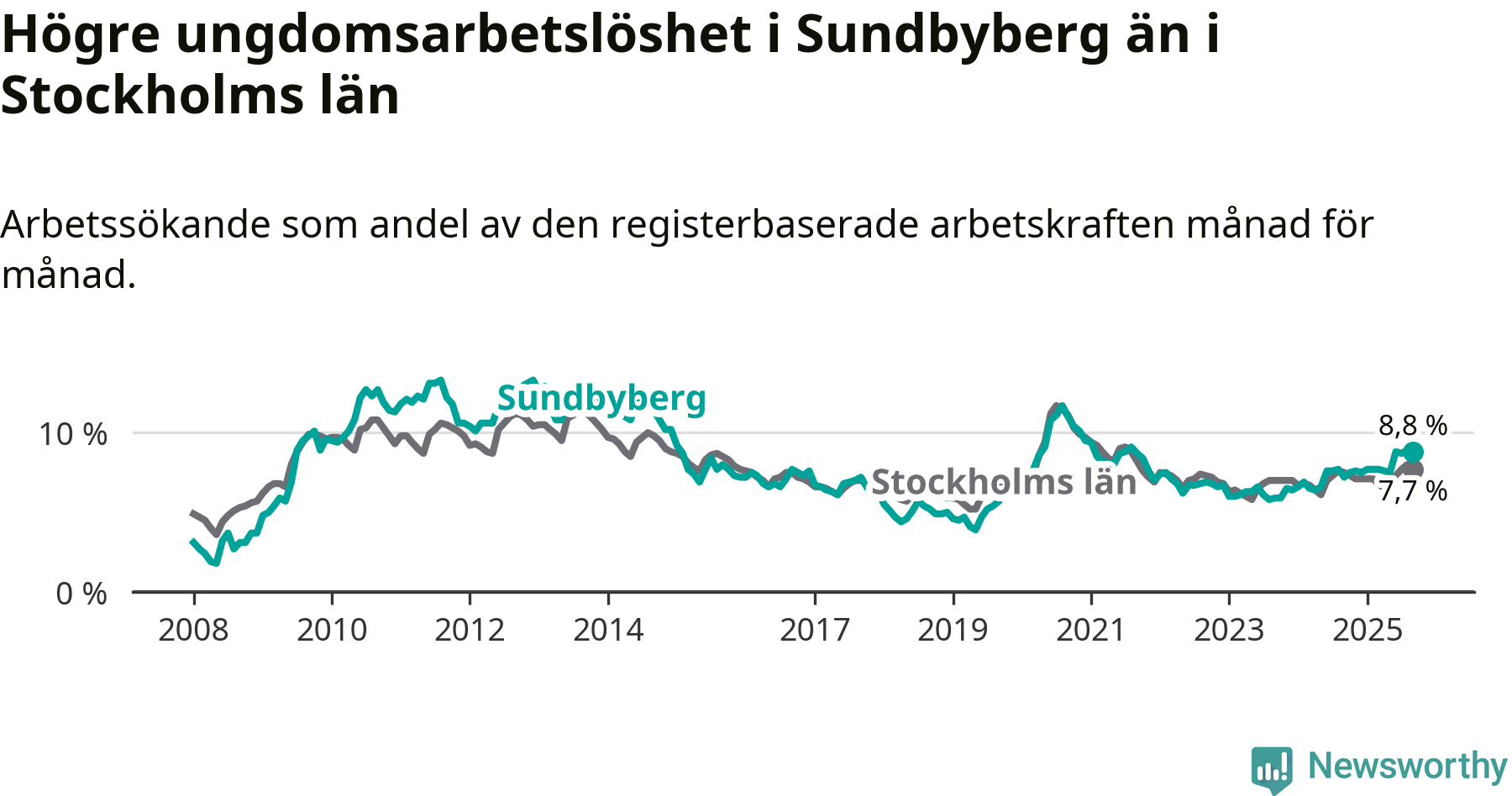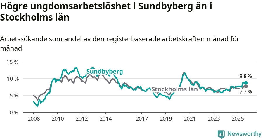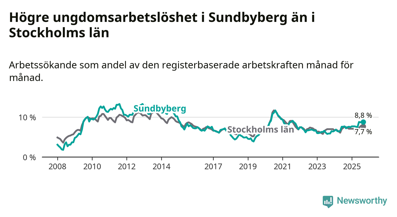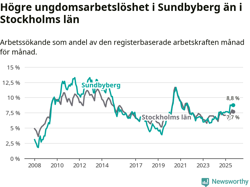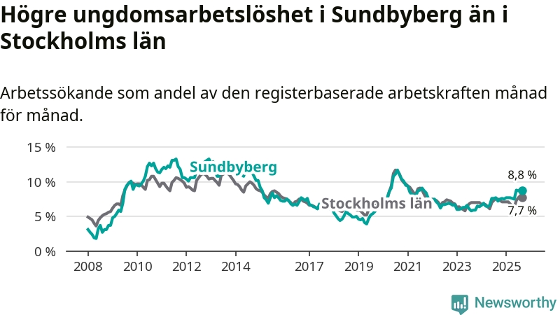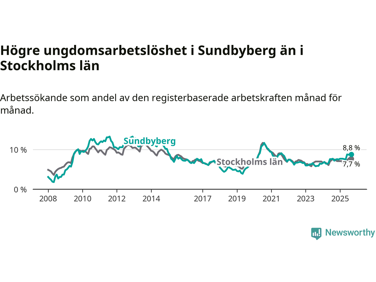 Precis som den totala arbetslösheten ligger ungdomsarbetslösheten i Sundbyberg högre än i Stockholms län som helhet. Skillnaden mellan kommunen och länet är 1,1 procentenheter.