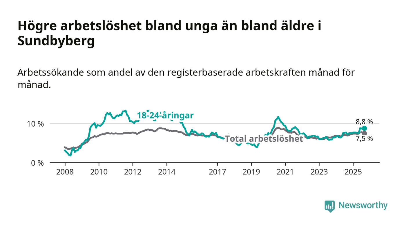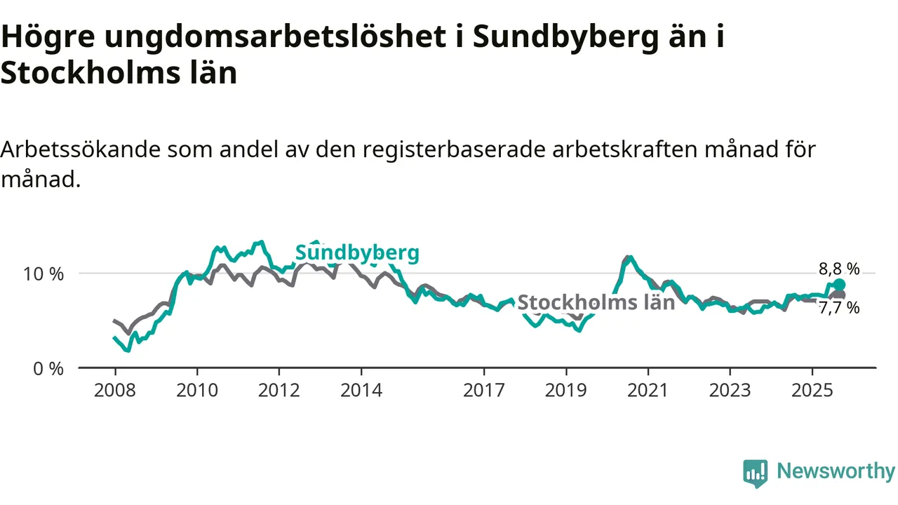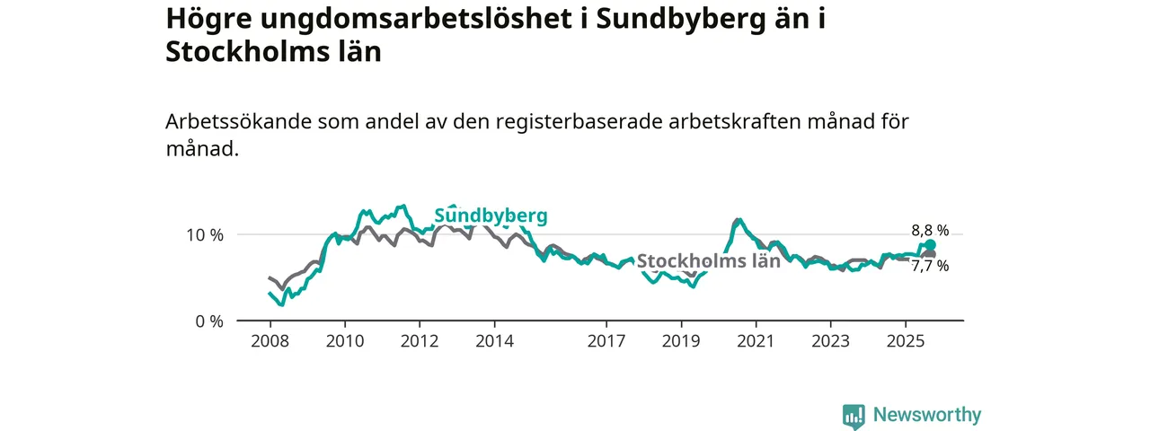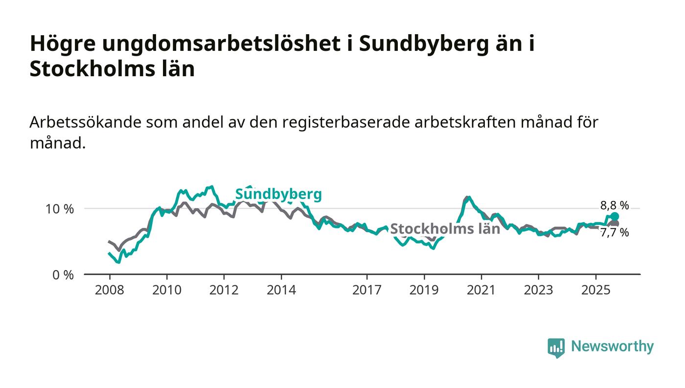 I och med den senaste månadens uppgång har de ungas arbetslöshet i Sundbyberg stigit 21 månader i följd (upp från 6,4 procent i december 2023 till 8,8 procent nu).
