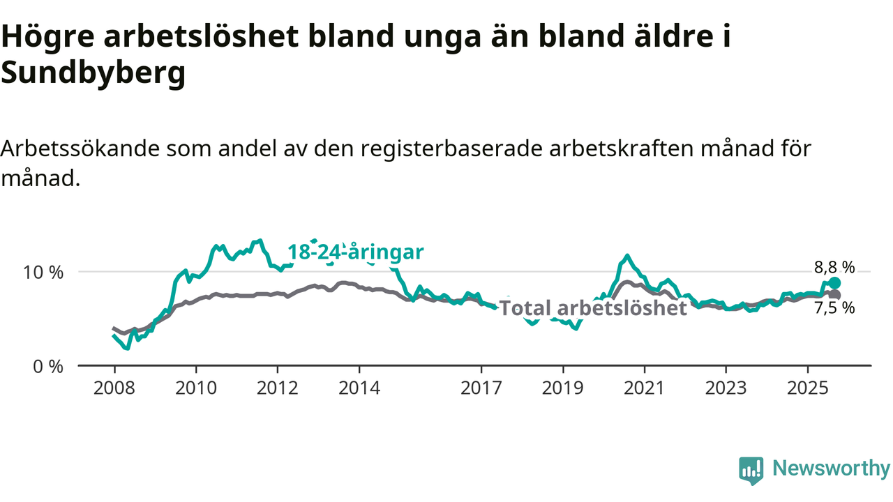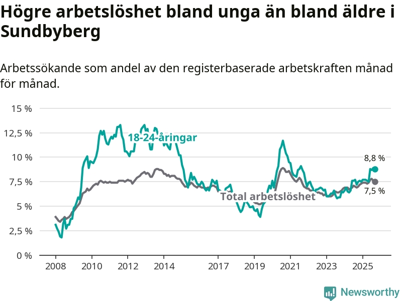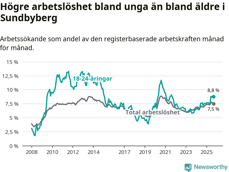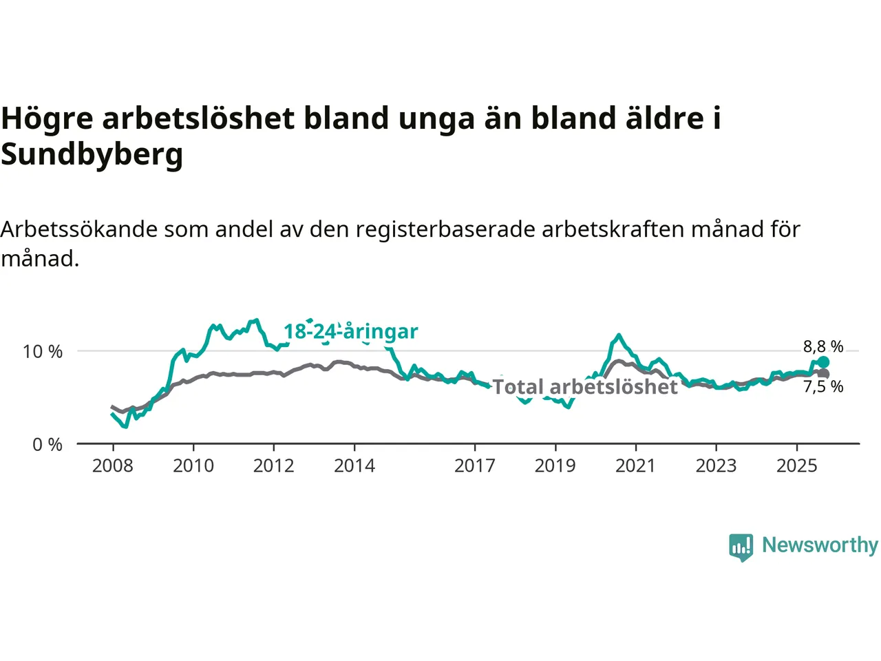 I och med den senaste månadens uppgång har de ungas arbetslöshet i Sundbyberg stigit 21 månader i följd (upp från 6,4 procent i december 2023 till 8,8 procent nu).