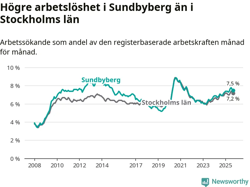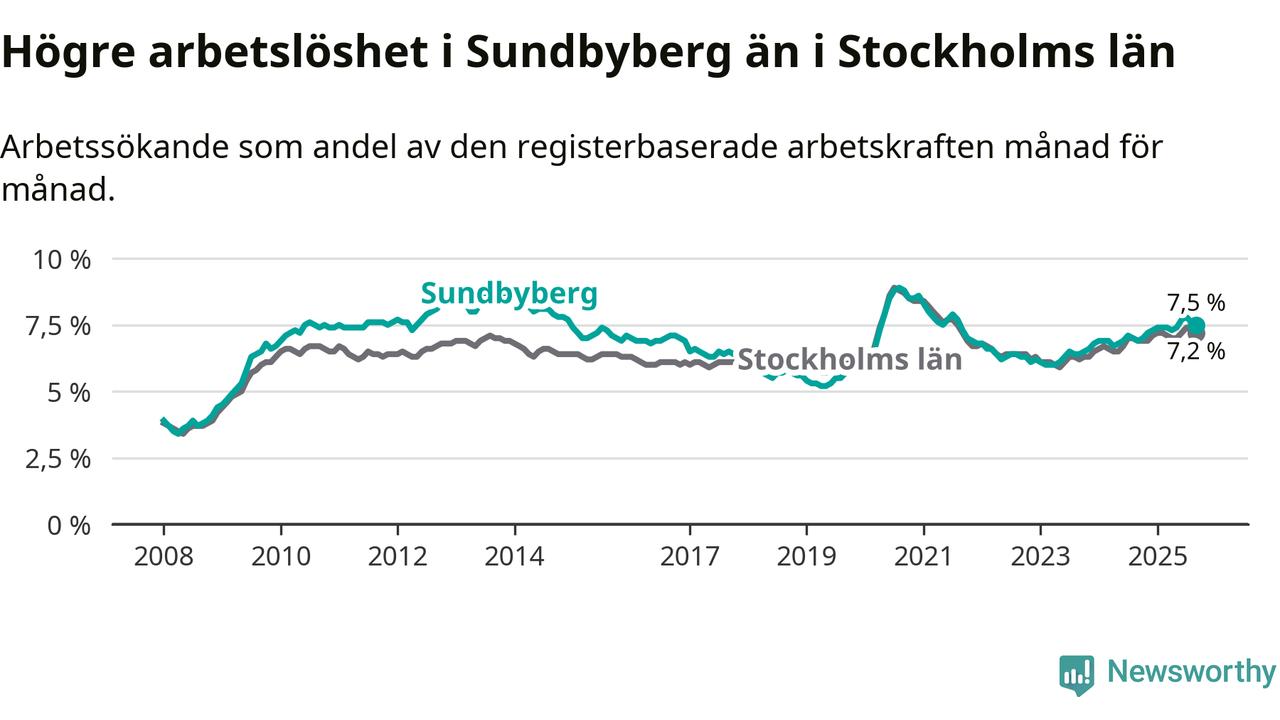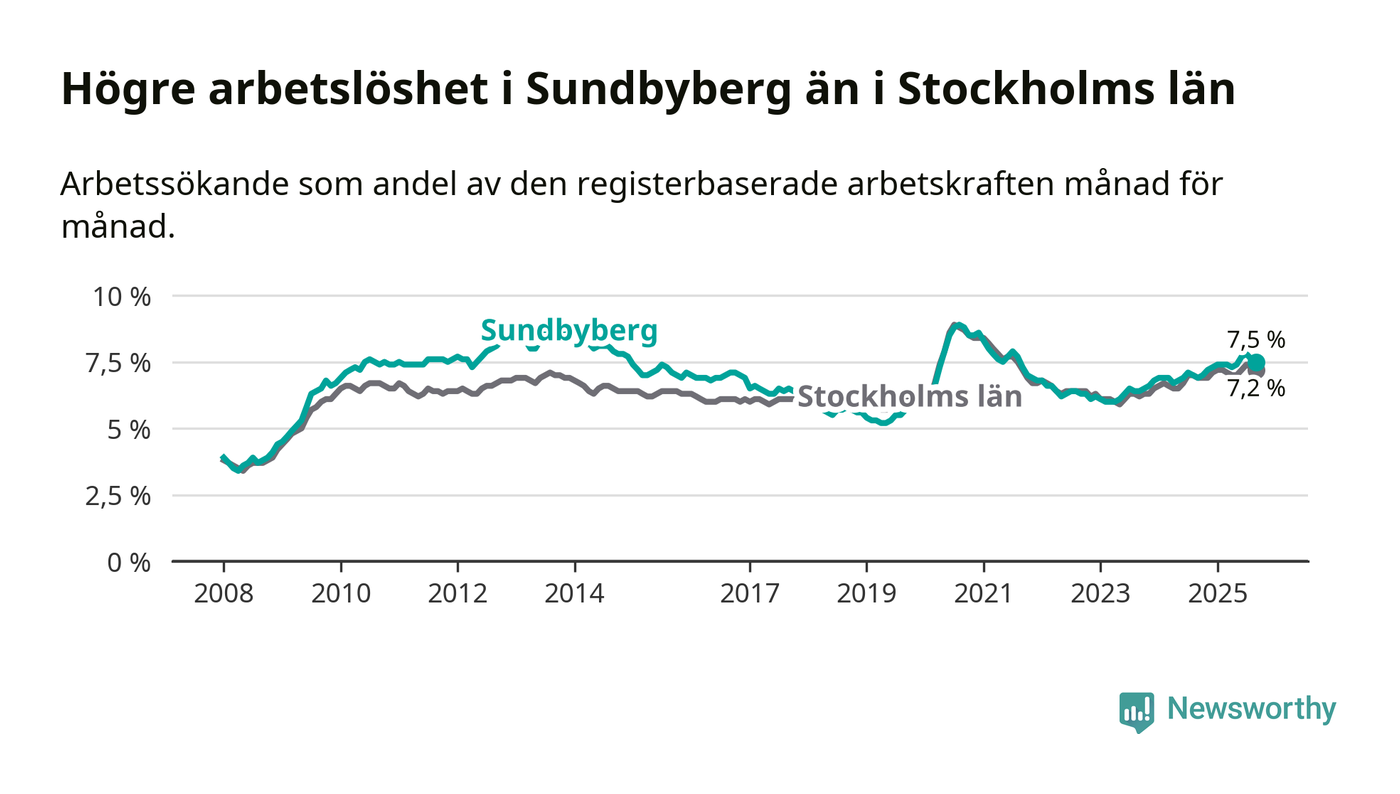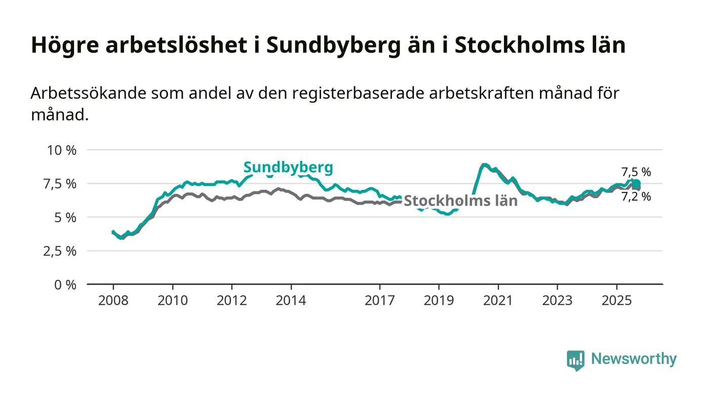 Sundbyberg hade redan tidigare högre arbetslöshet än snittet i hela Stockholms län och nu växer klyftan (7,5 procent i kommunen, jämfört med 7,2 procent i hela länet). Vaxholm och Värmdö har den lägsta arbetslösheten i länet (3,9 procent), medan Södertälje har den högsta (11,1 procent). För att Sundbyberg skulle komma ner i samma arbetslöshetsnivå som Vaxholm och Värmdö skulle 1 174 personer behöva sysselsättas.