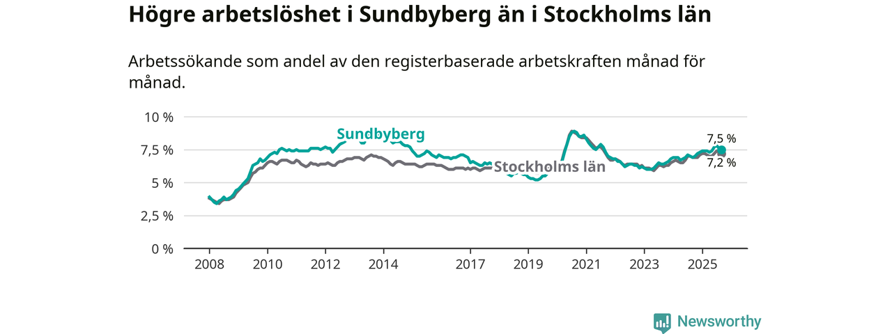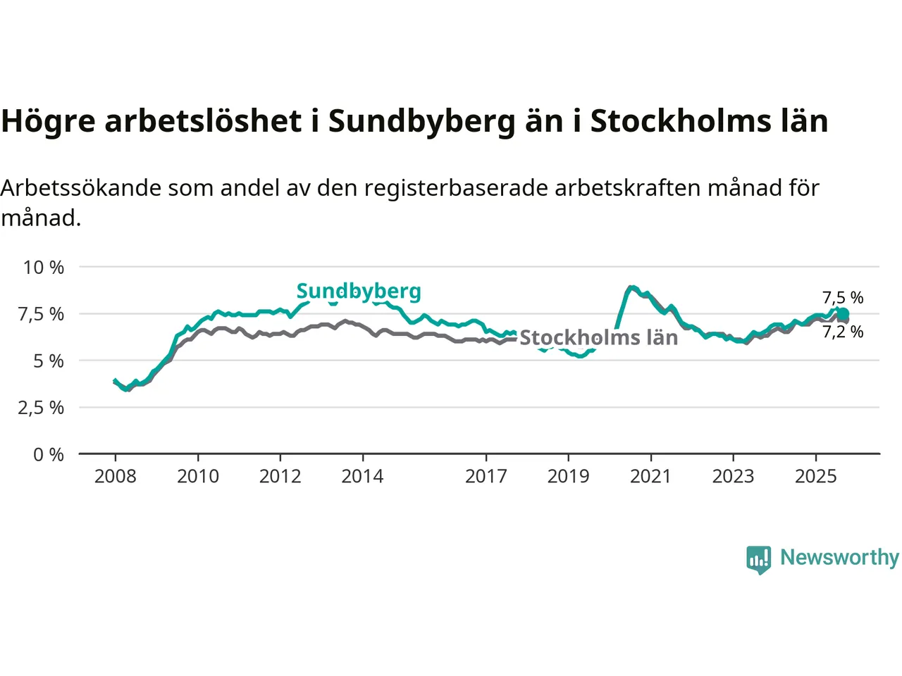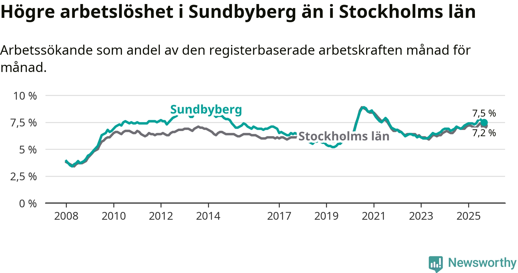 Det är 25:e månaden i följd som arbetslösheten i Sundbyberg är högre än den var under samma tidpunkt året innan. Sedan augusti 2023 har arbetslösheten gått upp från 6,4 till 7,5 procent.