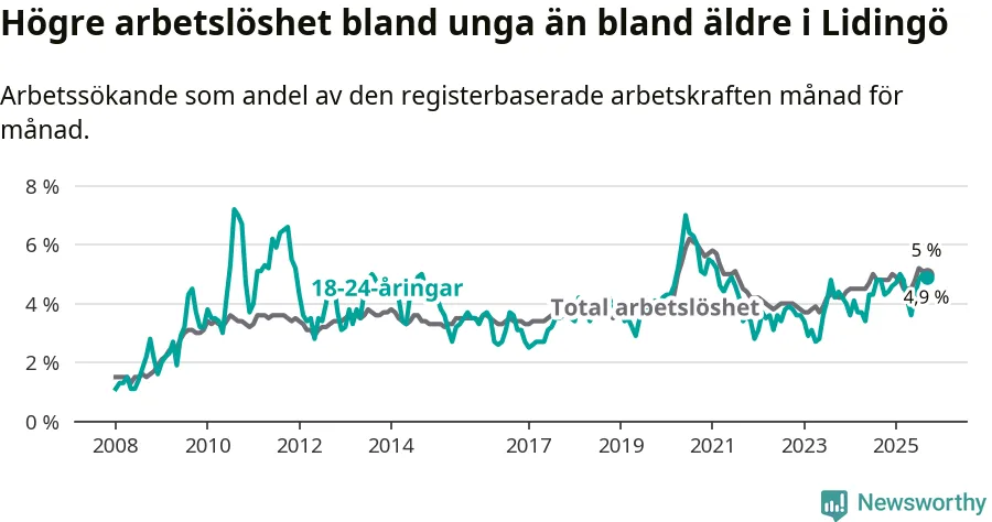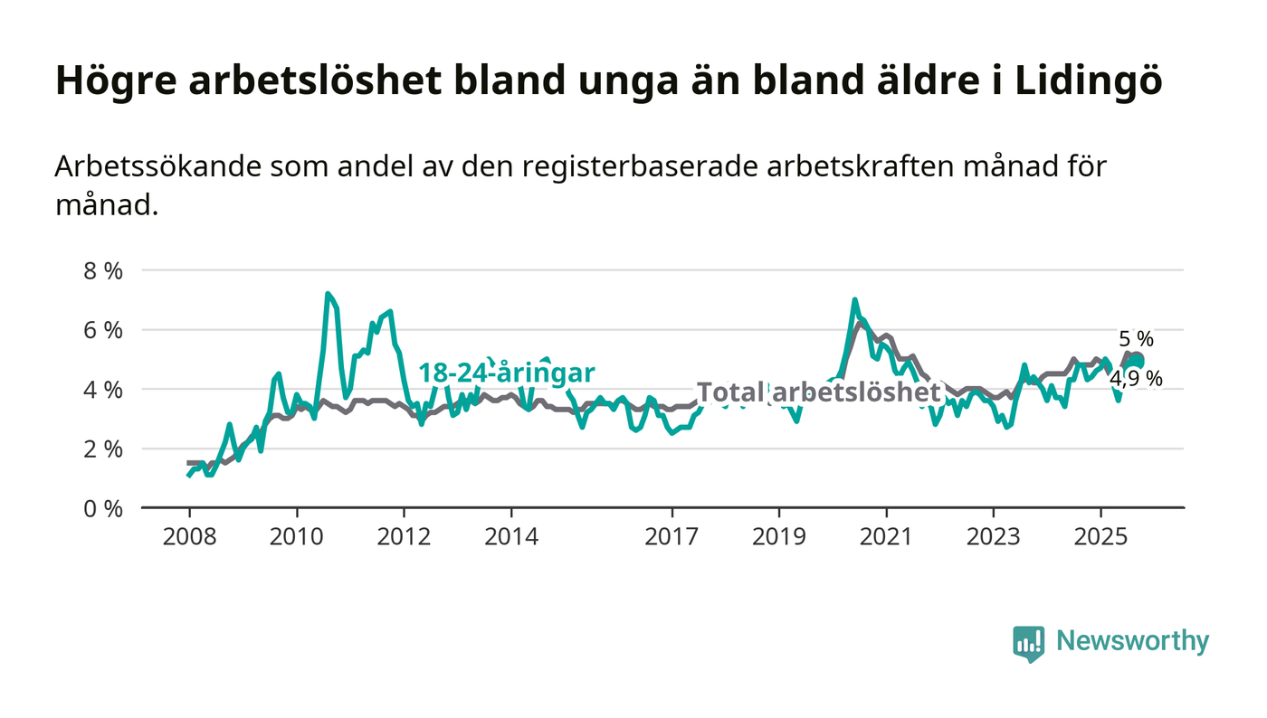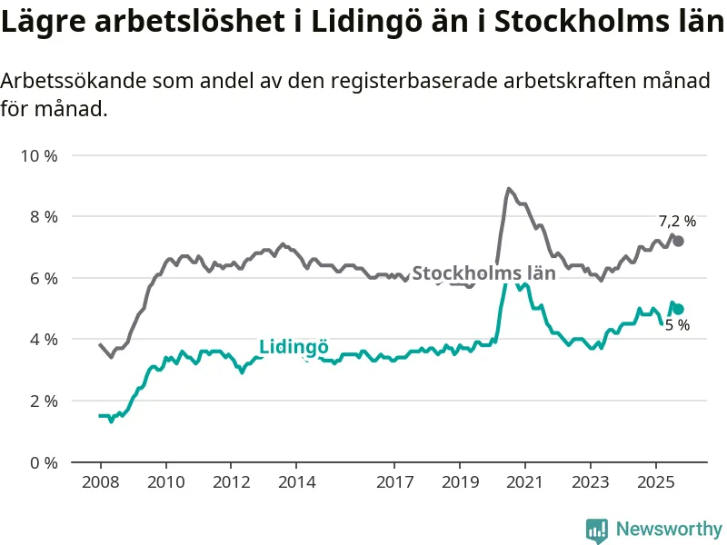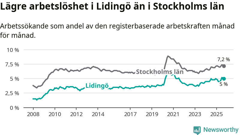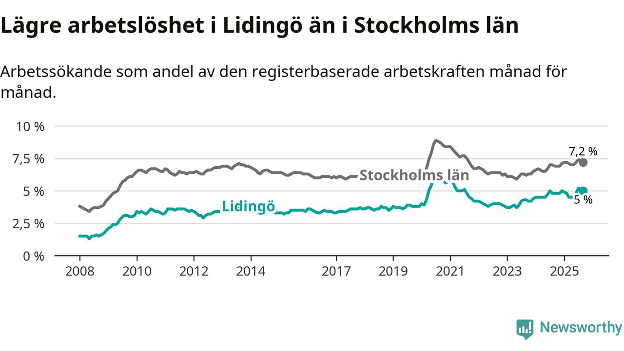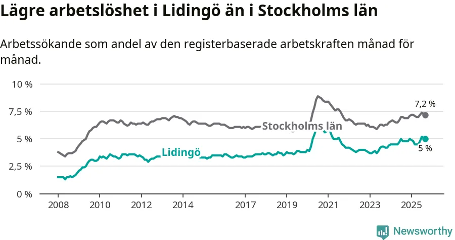 Under september månad rapporterade Lidingö kommun en total arbetslöshet på 5,0 procent. Det är en ökning jämfört med samma tidpunkt i fjol (+0,2 procentenheter). Även i Stockholms län stiger arbetslösheten .