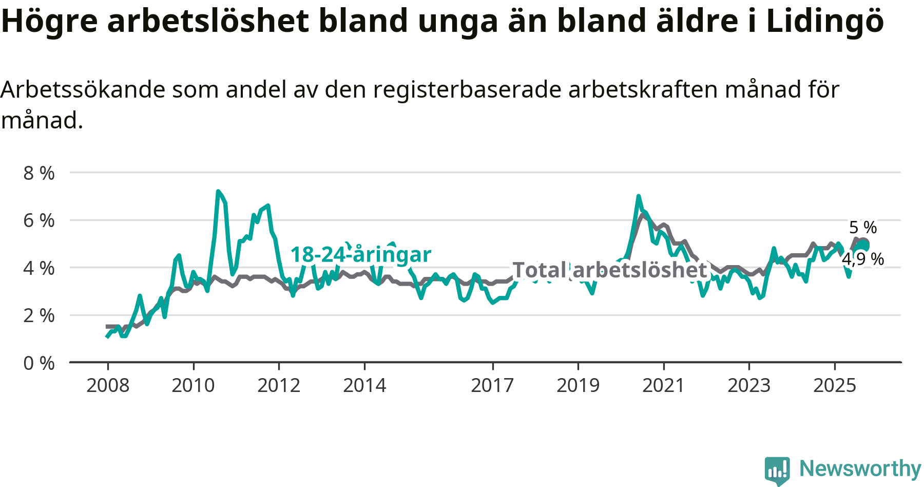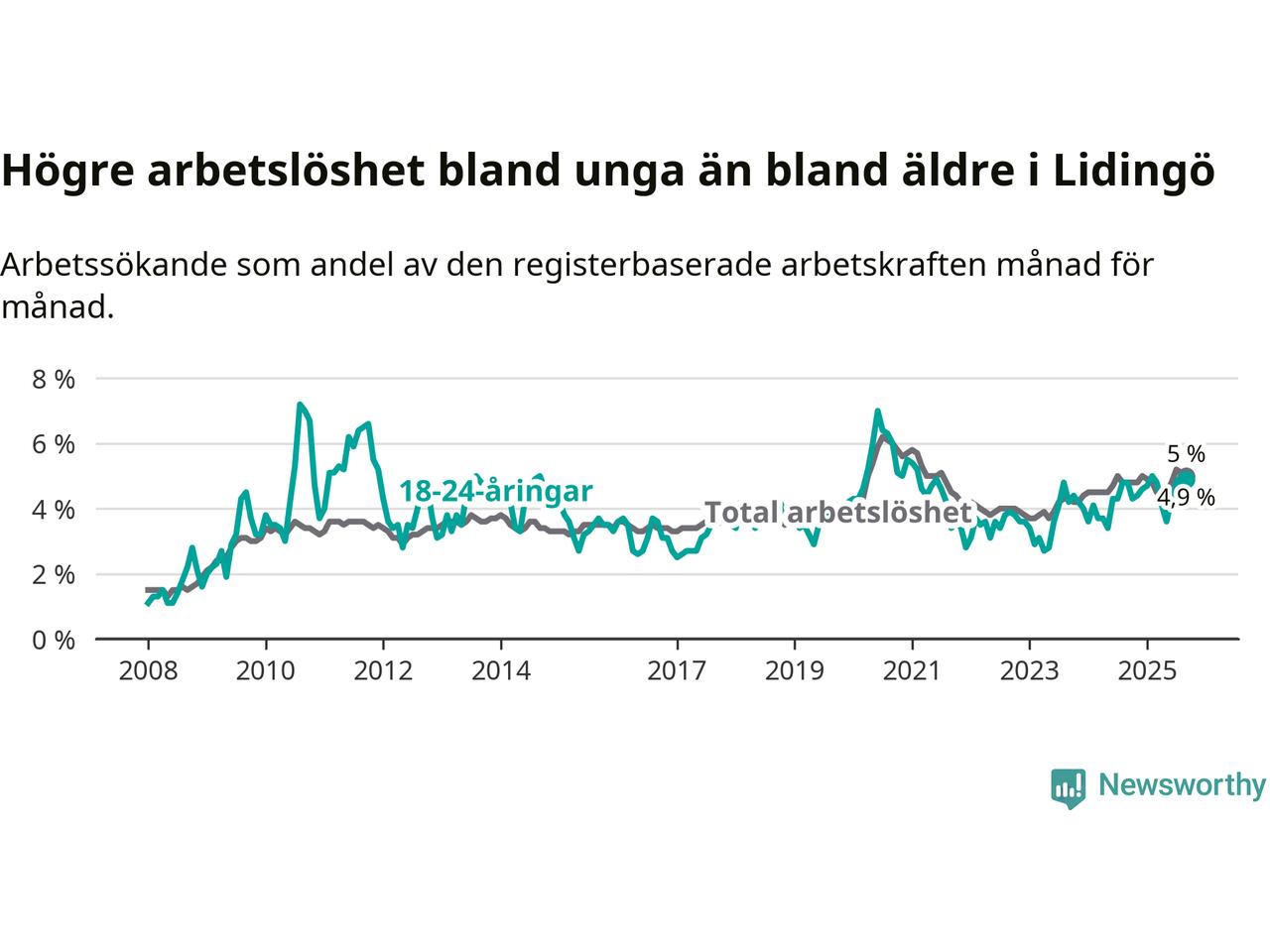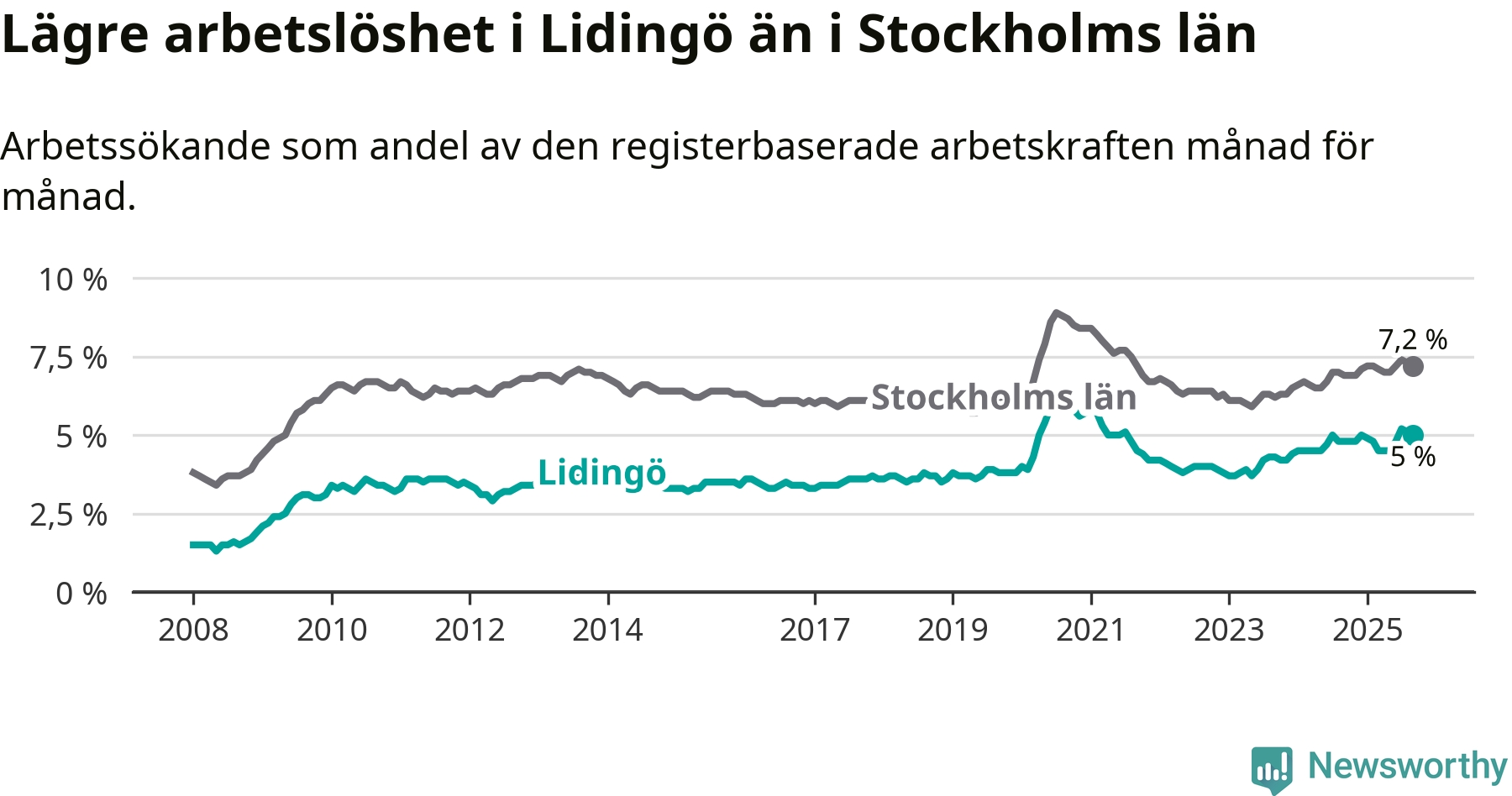 Under september månad rapporterade Lidingö kommun en total arbetslöshet på 5,0 procent. Det är en ökning jämfört med samma tidpunkt i fjol (+0,2 procentenheter). Även i Stockholms län stiger arbetslösheten .