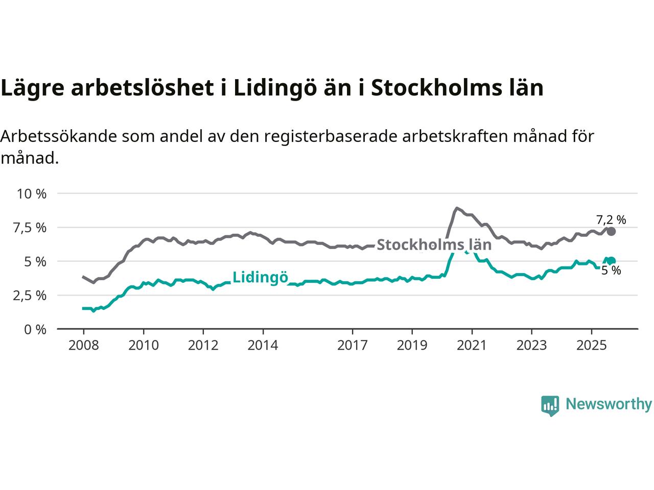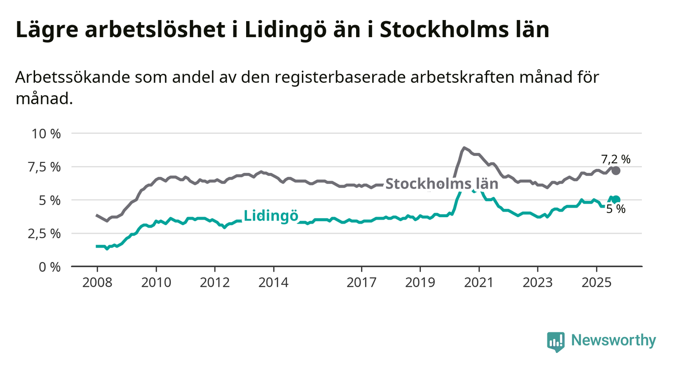 Även om arbetslösheten på Lidingö alltså ökar, så ligger den fortfarande under snittet i hela Stockholms län (5,0 procent i kommunen, jämfört med 7,2 procent i hela länet). Vaxholm och Värmdö har den lägsta arbetslösheten i länet (3,9 procent), medan Södertälje har den högsta (11,1 procent). För att Lidingö skulle komma ner i samma arbetslöshetsnivå som Vaxholm och Värmdö skulle 246 personer behöva sysselsättas.