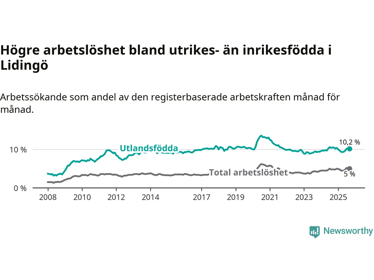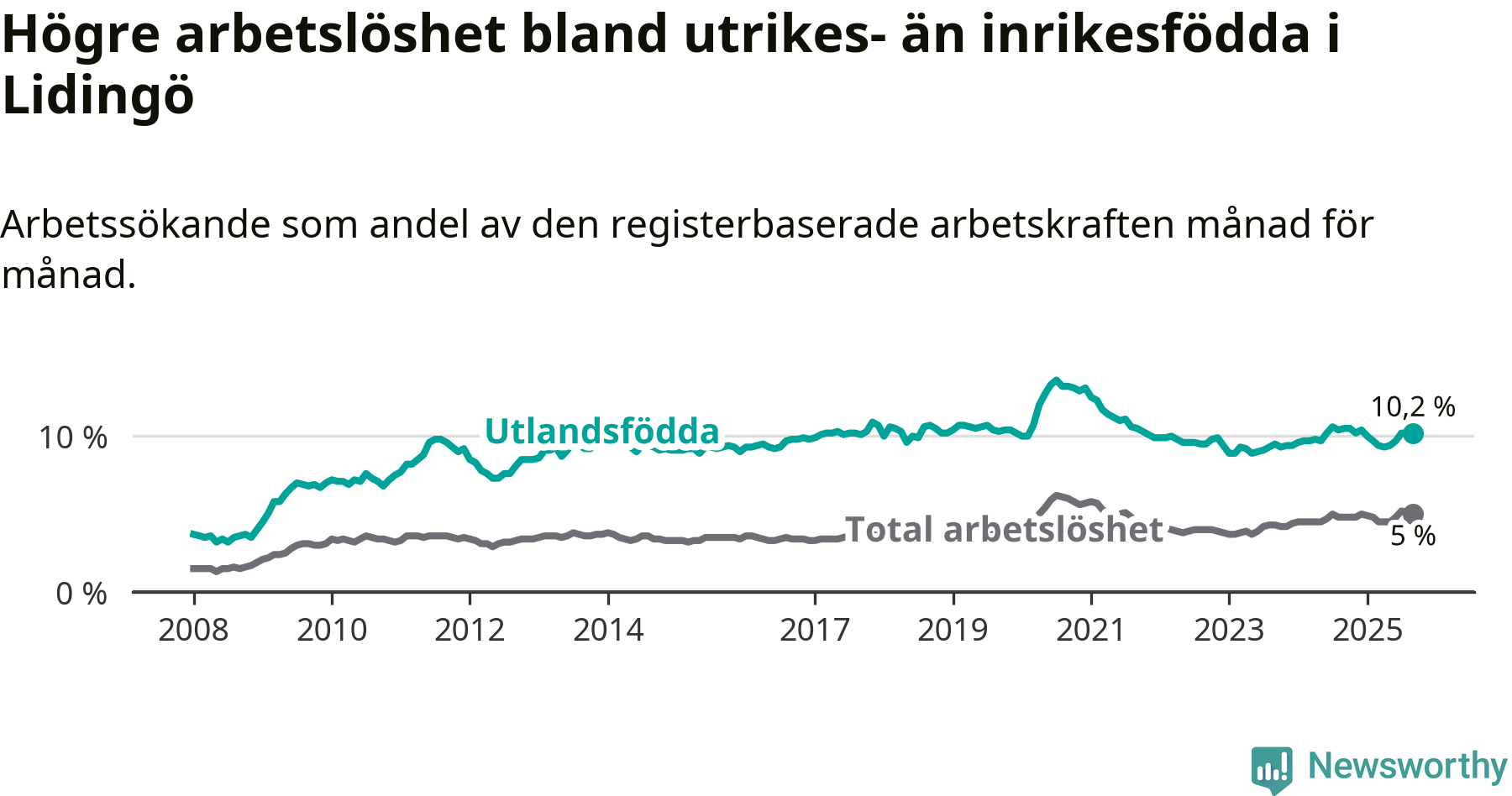 Arbetslösheten bland utlandsfödda var 10,2 procent på Lidingö under september månad, motsvarande 506 av 4 961 personer. Det är 0,3 procentenheter färre än vid samma tidpunkt i fjol (−7 om man räknar personer). Därmed är de utlandsföddas arbetslöshet lägre än vid samma tidpunkt i fjol för sjunde månaden i följd.