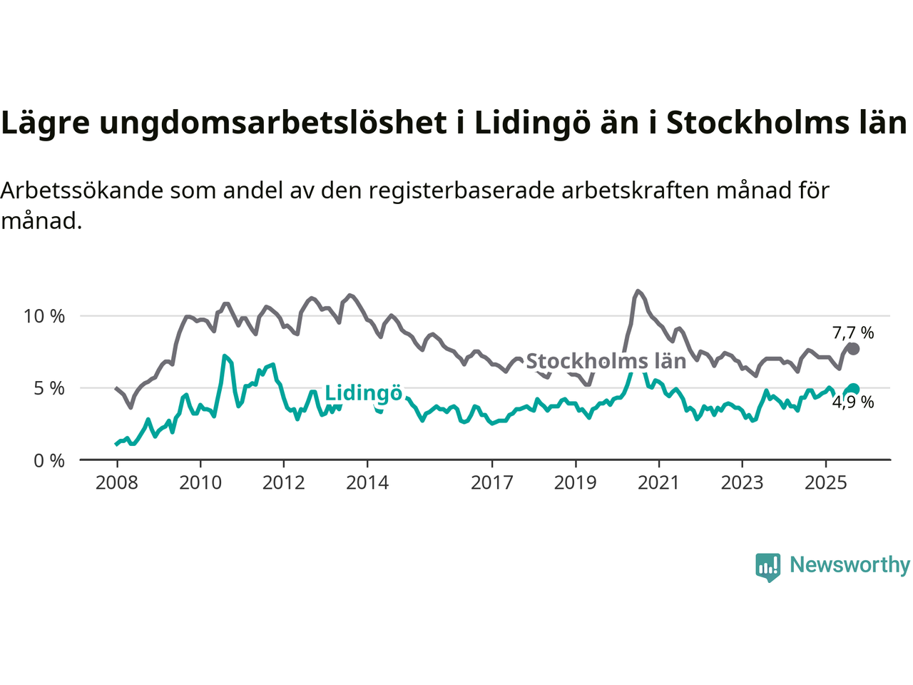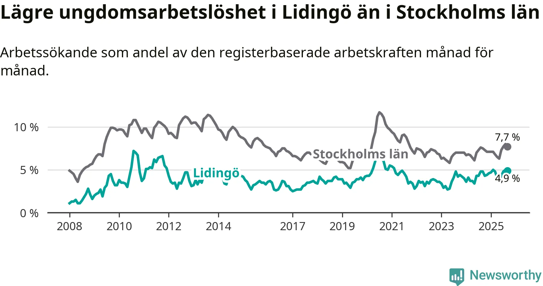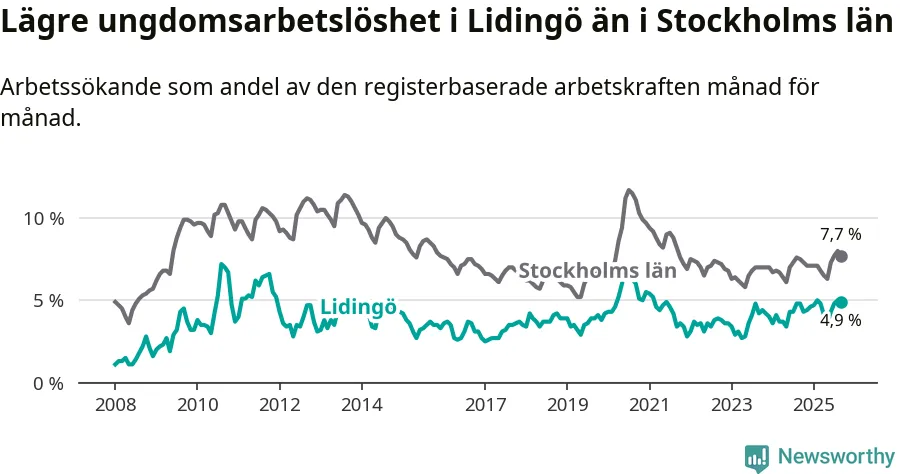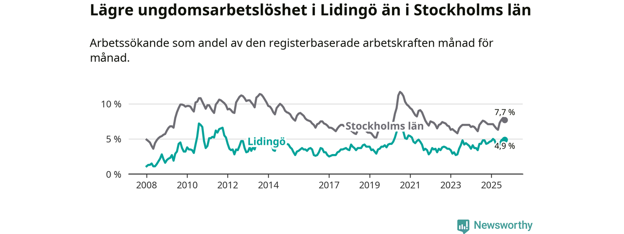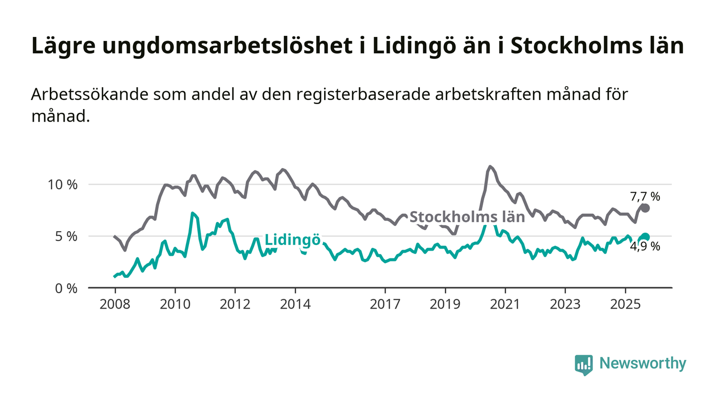 Precis som den totala arbetslösheten ligger ungdomsarbetslösheten på Lidingö lägre än i Stockholms län som helhet. Skillnaden mellan kommunen och länet är 2,8 procentenheter.