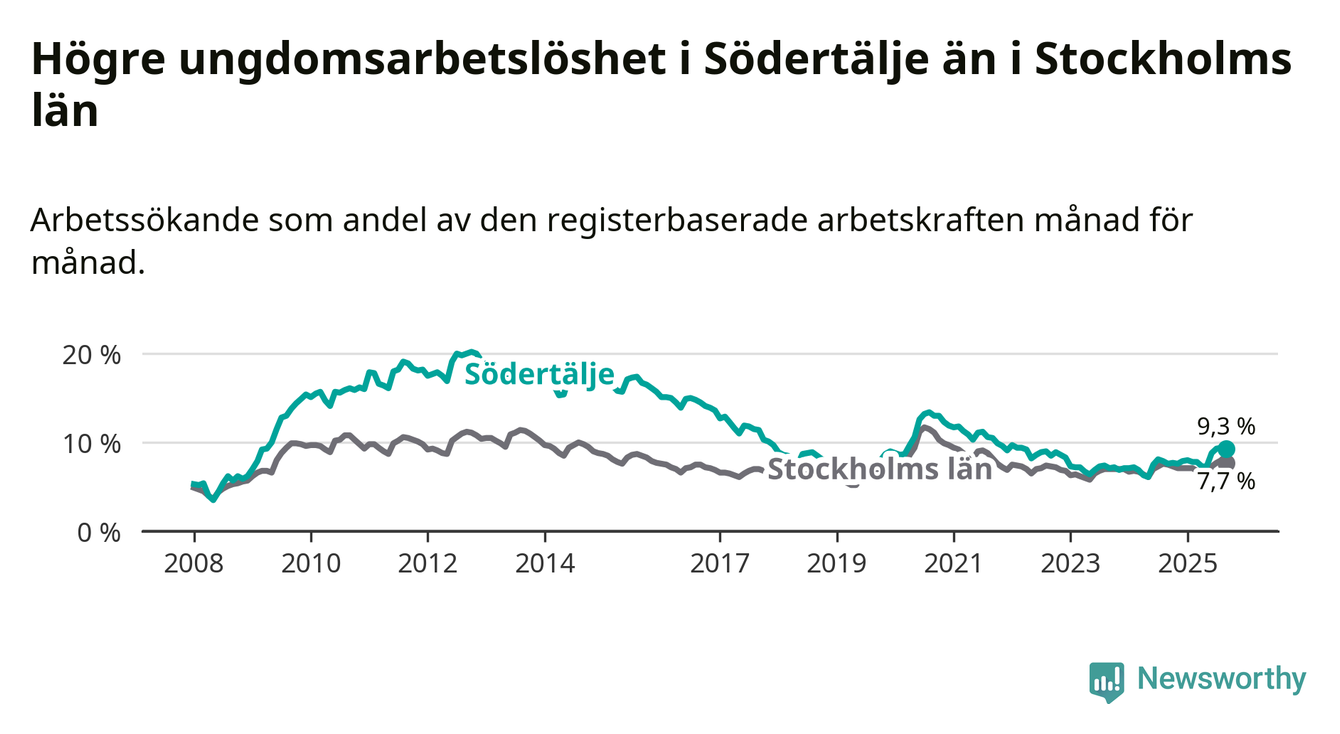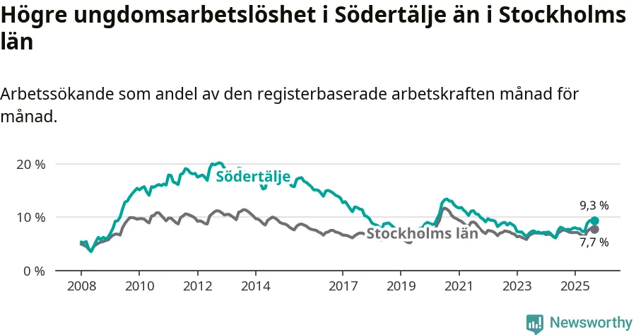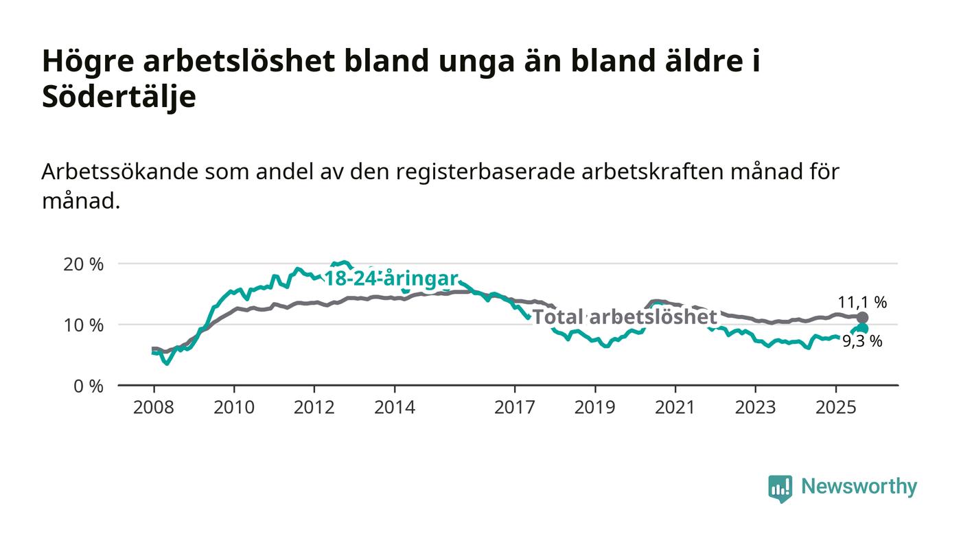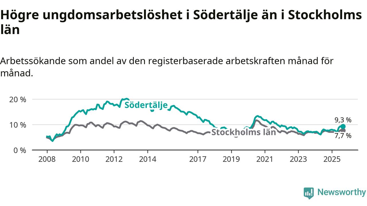 Den senaste månadsstatistiken från Arbetsförmedlingen visar på en uppgång i ungdoms­arbetslöshet i Södertälje kommun med 1,7 procentenheter. Arbetslösheten bland personer i åldern 18–24 år låg i september på 9,3 procent.