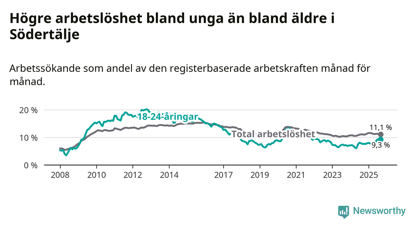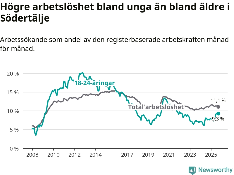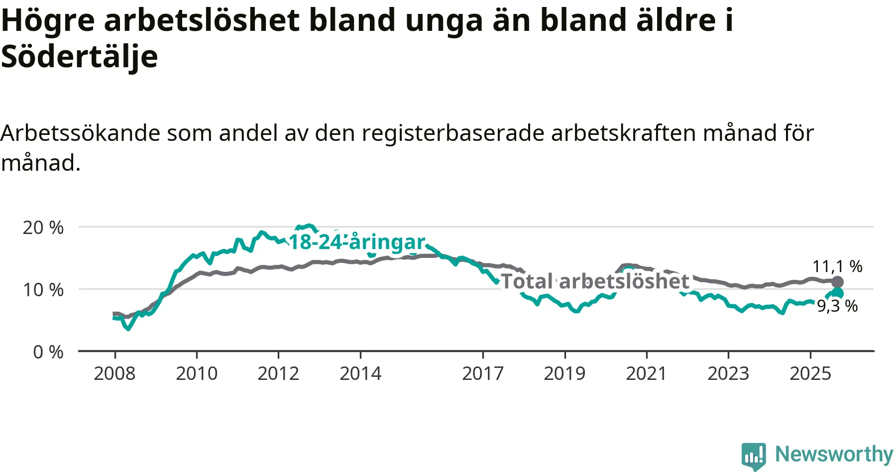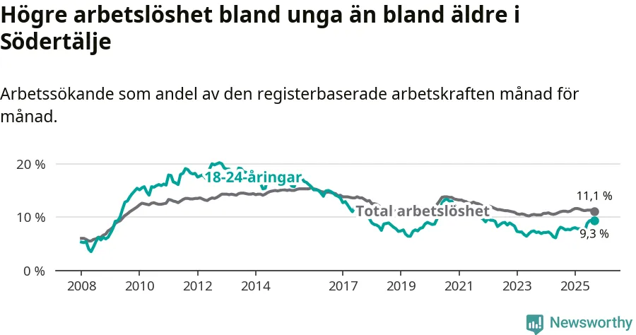 Den senaste månadsstatistiken från Arbetsförmedlingen visar på en uppgång i ungdoms­arbetslöshet i Södertälje kommun med 1,7 procentenheter. Arbetslösheten bland personer i åldern 18–24 år låg i september på 9,3 procent.