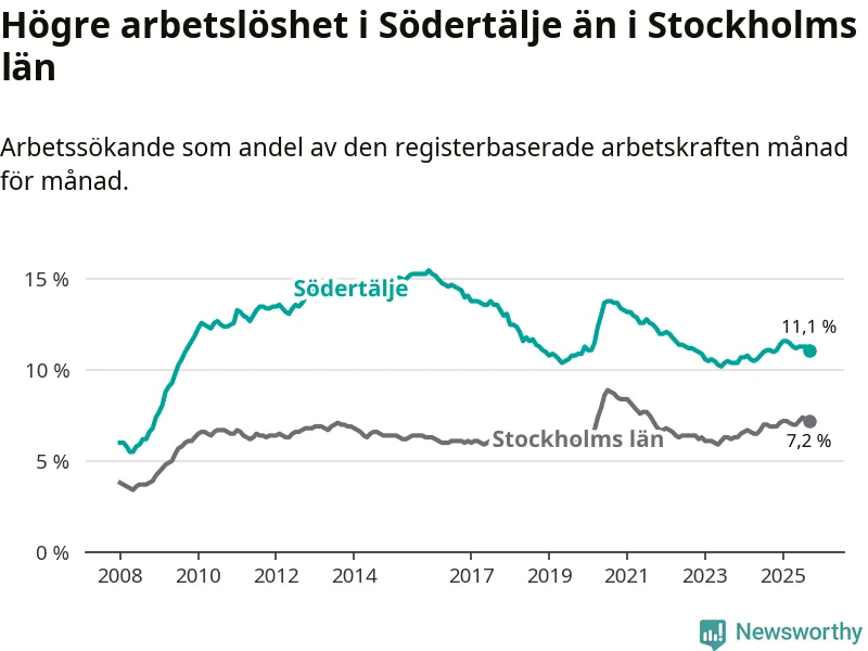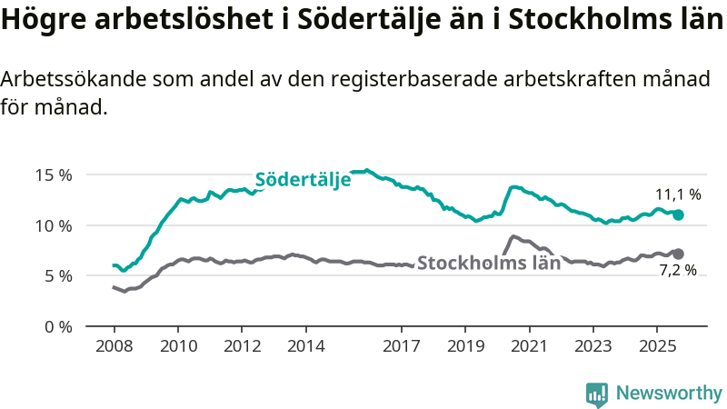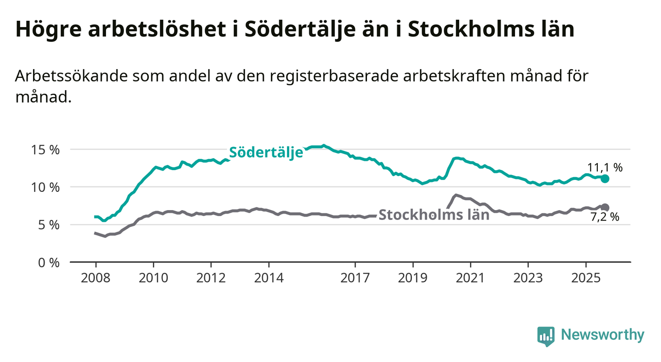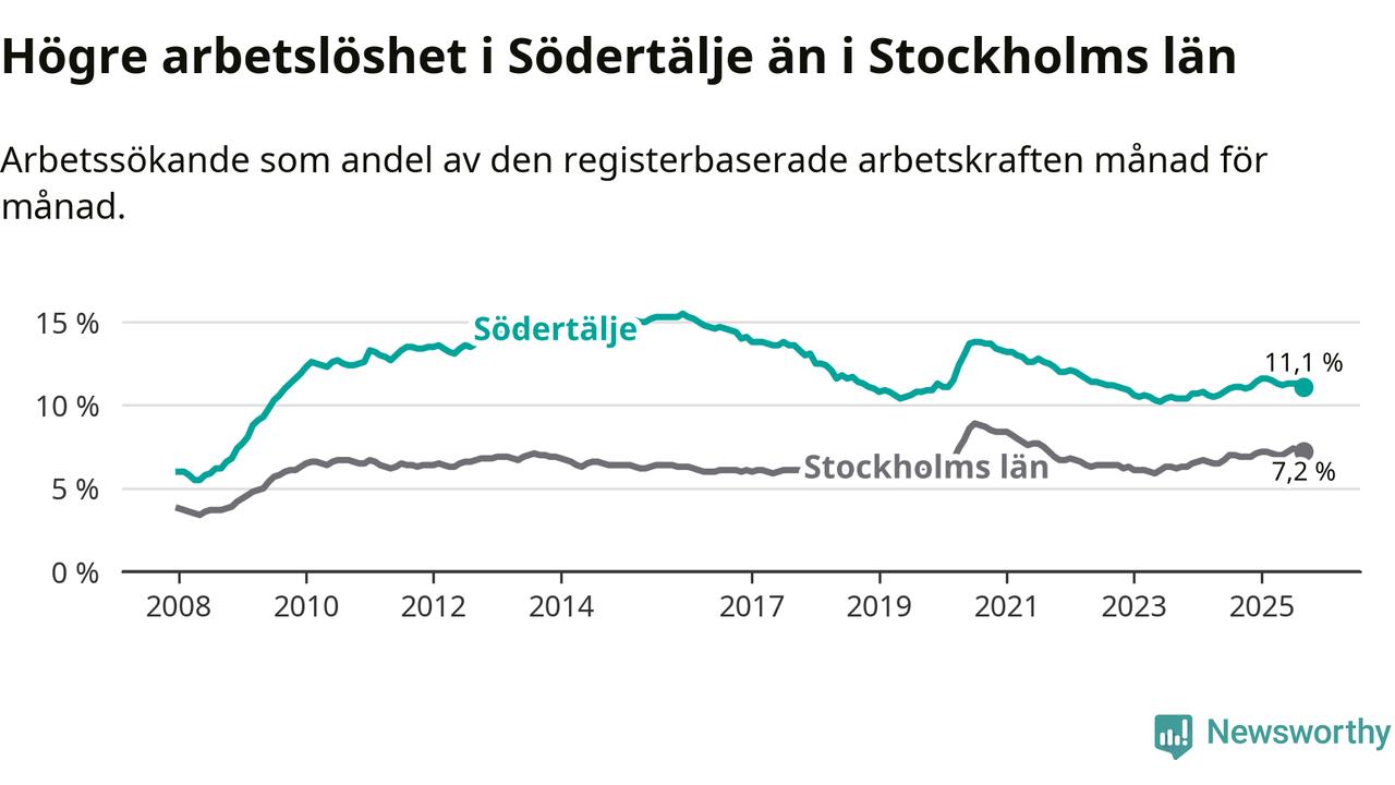 Arbetslösheten i Södertälje ligger över nivån i hela Stockholms län (11,1 procent i kommunen, jämfört med 7,2 procent i hela länet). Södertälje har därmed även den högsta arbetslöshetsnivån i länet. Vaxholm och Värmdö har den lägsta (3,9 procent). För att Södertälje skulle komma ner i samma arbetslöshetsnivå som Vaxholm och Värmdö skulle 3 824 personer behöva sysselsättas.
