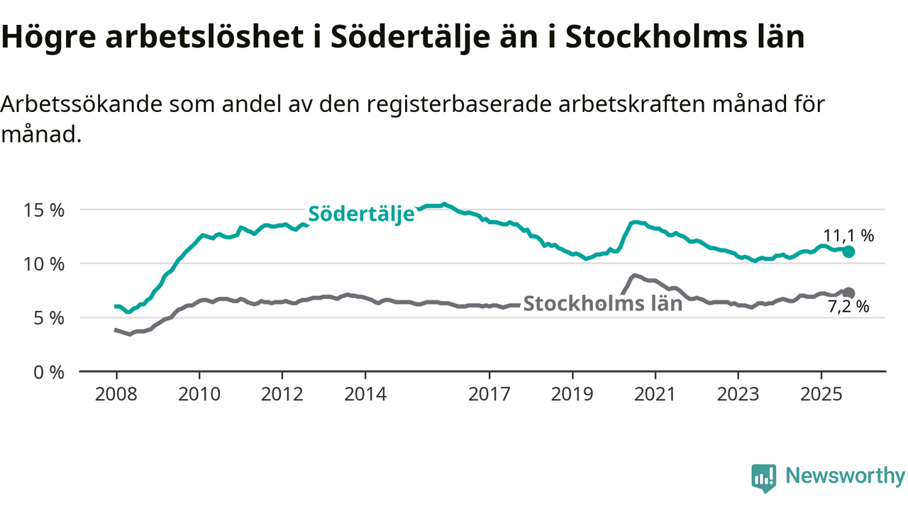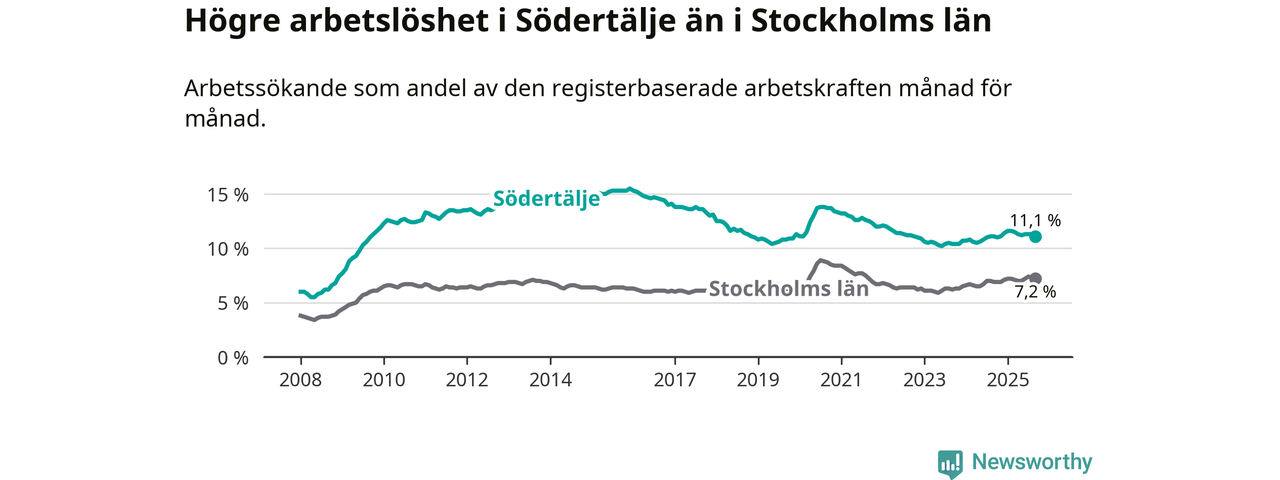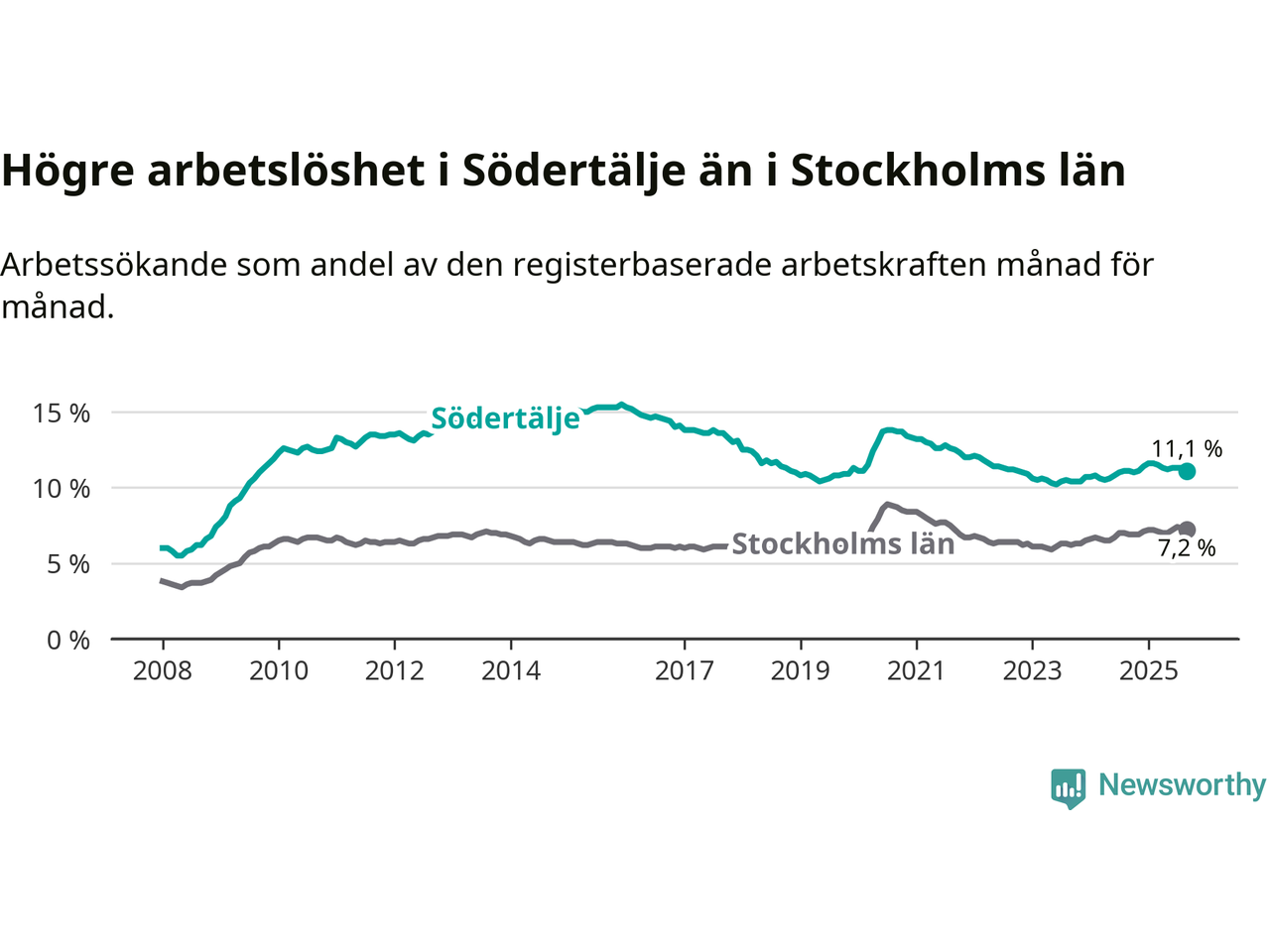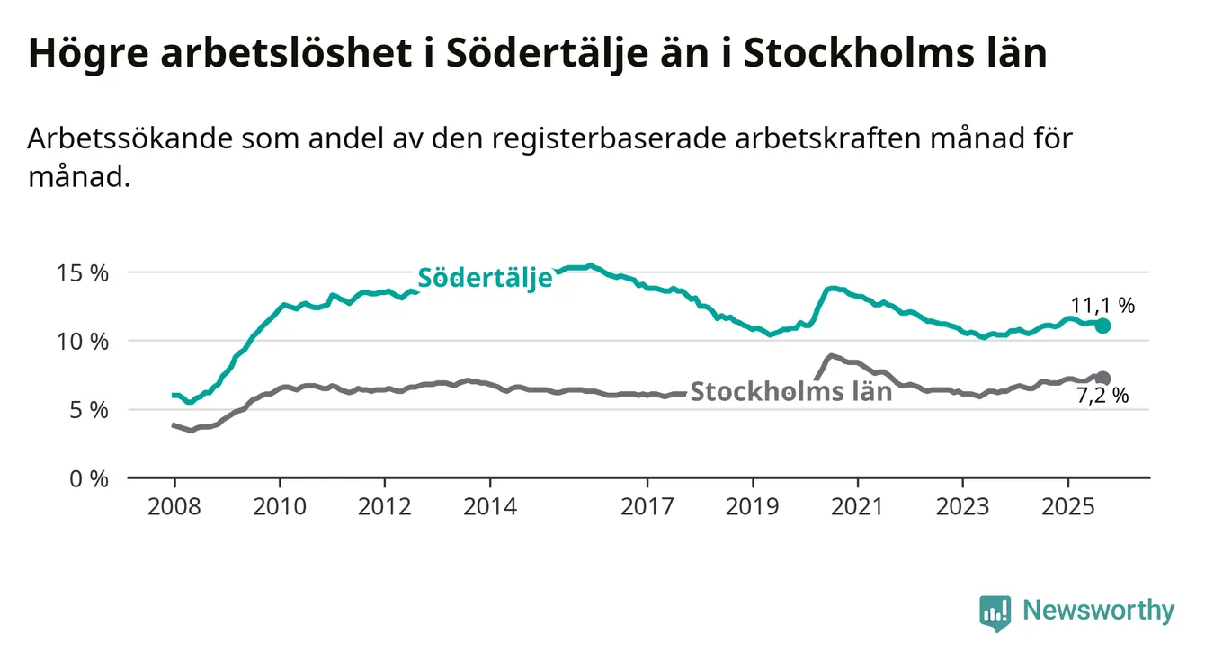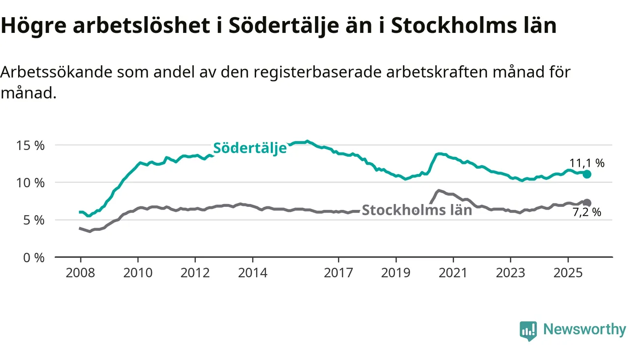 Södertälje går därmed mot strömmen i förhållande till andra kommuner i Stockholms län. I de flesta andra kommuner i länet går arbetslösheten uppåt. Störst är ökningen i Ekerö och Upplands Väsby, där arbetslösheten stiger med 0,7 procentenheter. I tabellen längre ner ser du utvecklingen i samtliga kommuner i länet.