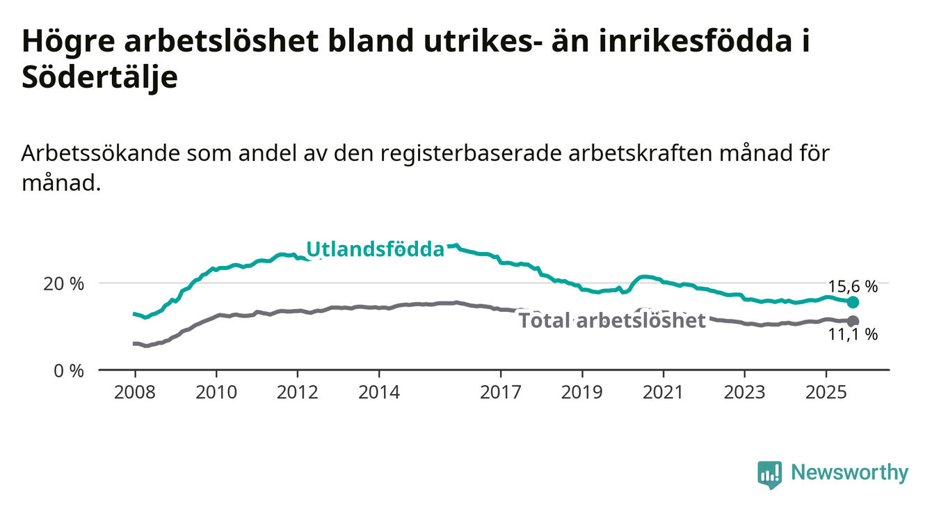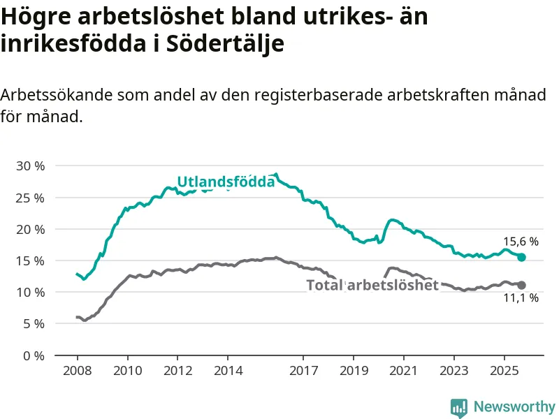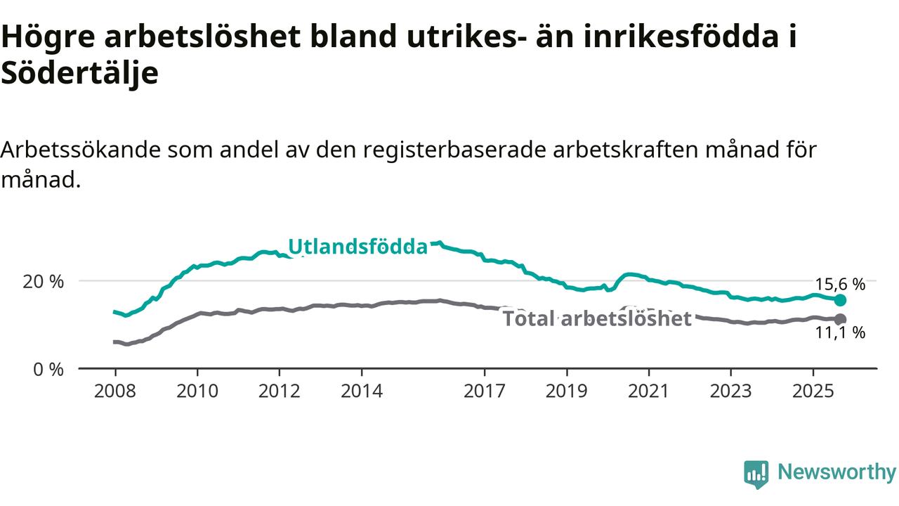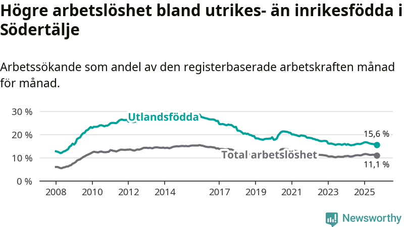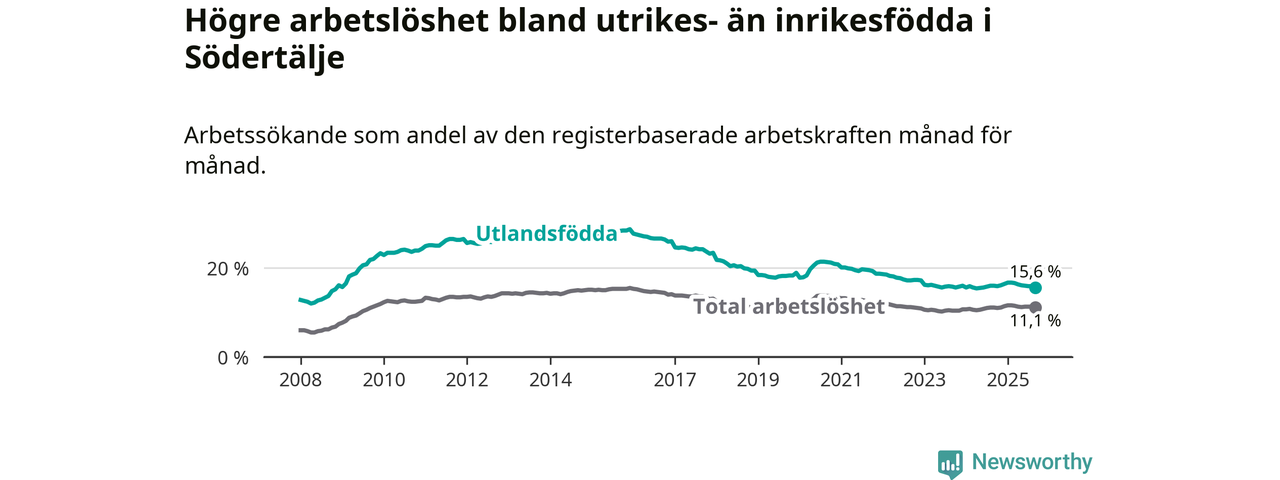 Arbetslösheten bland utlandsfödda var 15,6 procent i Södertälje under september månad, motsvarande 4 445 av 28 494 personer. Det är 0,4 procentenheter färre än vid samma tidpunkt i fjol (−78 om man räknar personer).