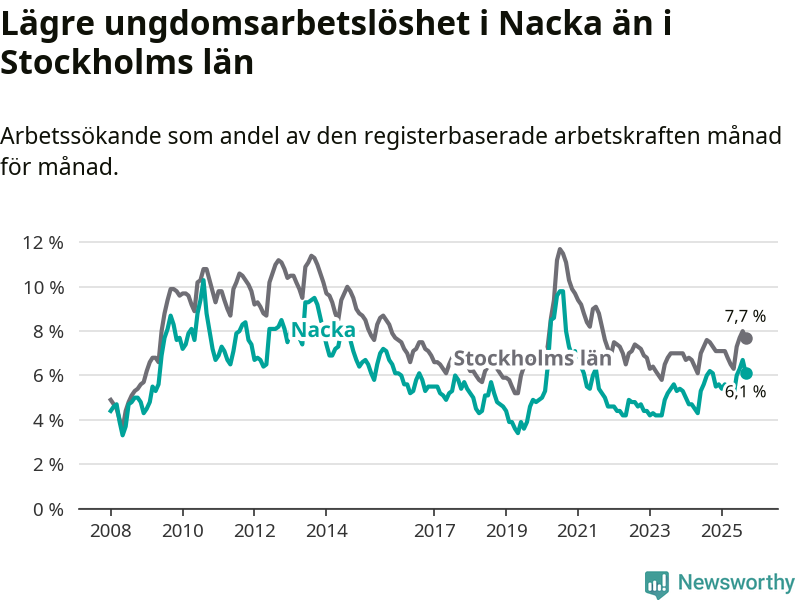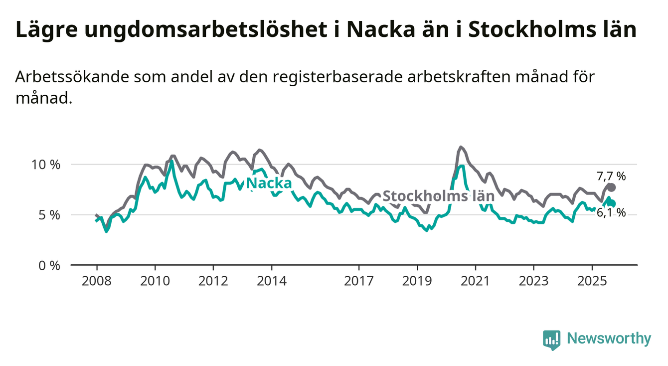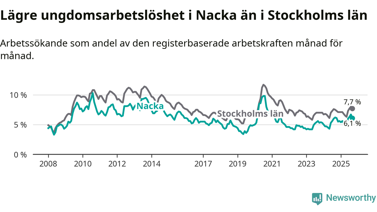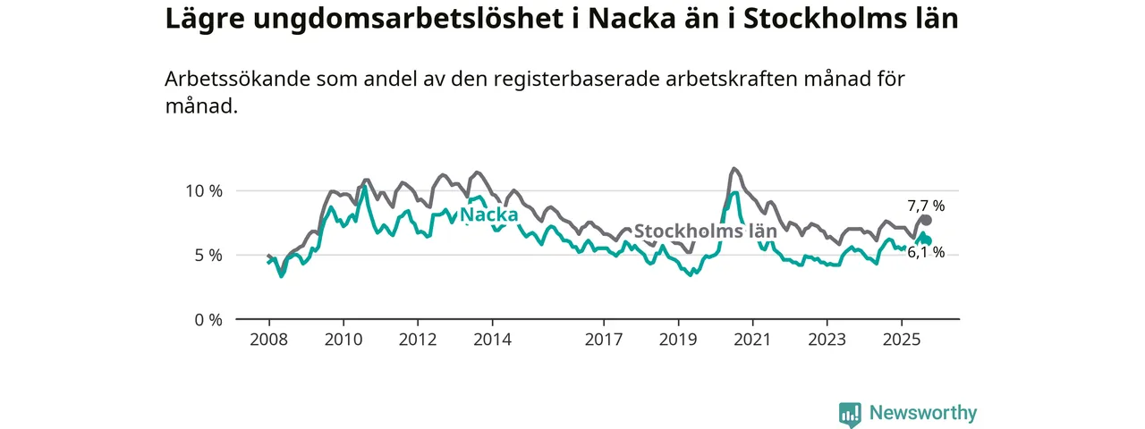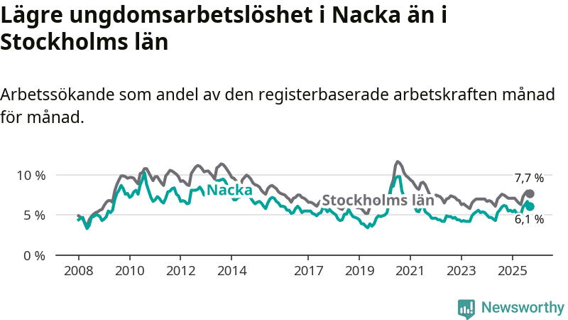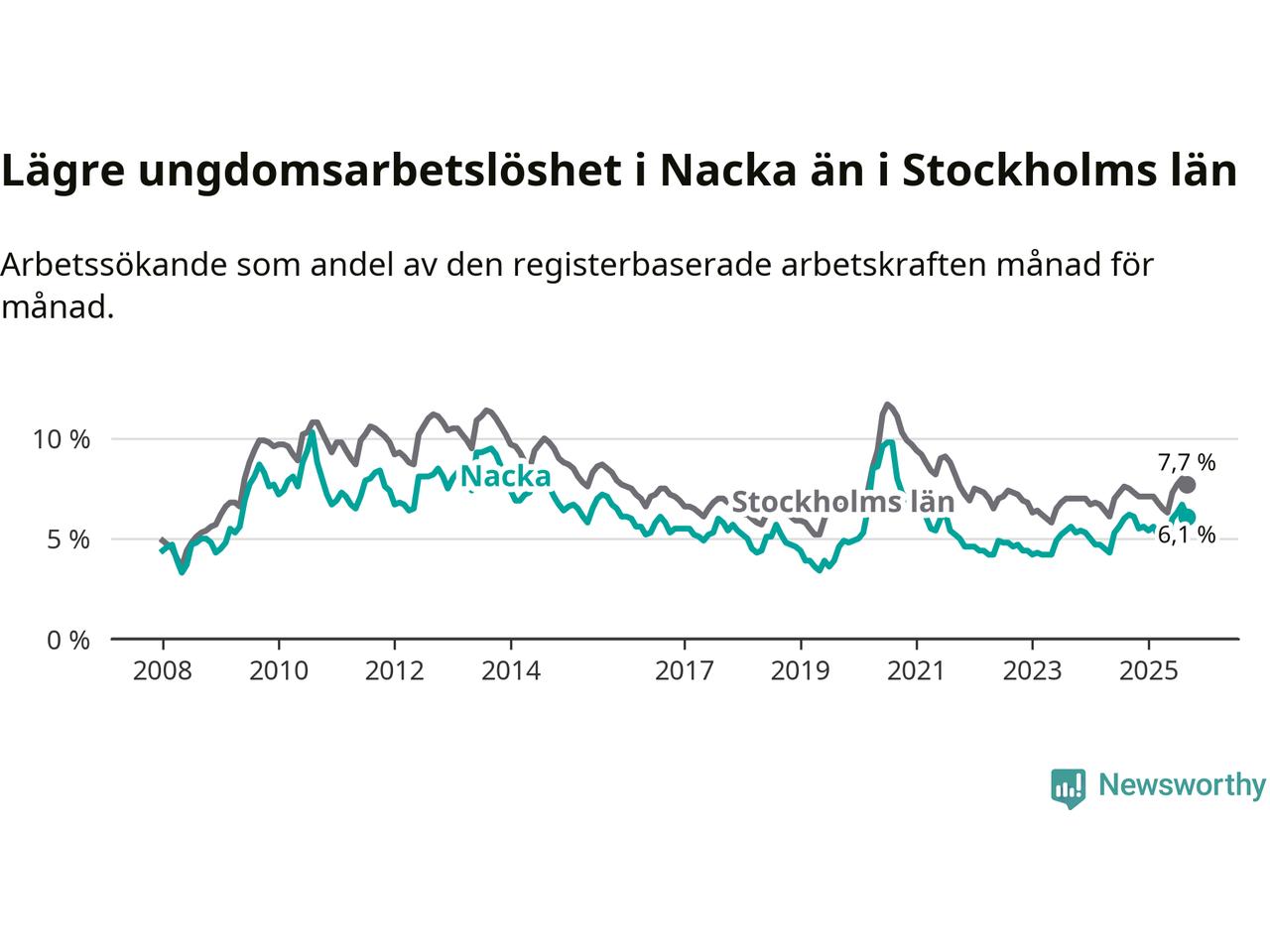 Precis som den totala arbetslösheten ligger ungdomsarbetslösheten i Nacka lägre än i Stockholms län som helhet. Skillnaden mellan kommunen och länet är 1,6 procentenheter.