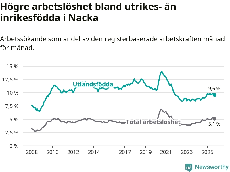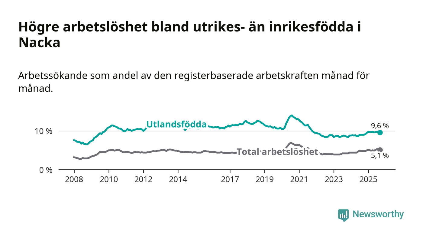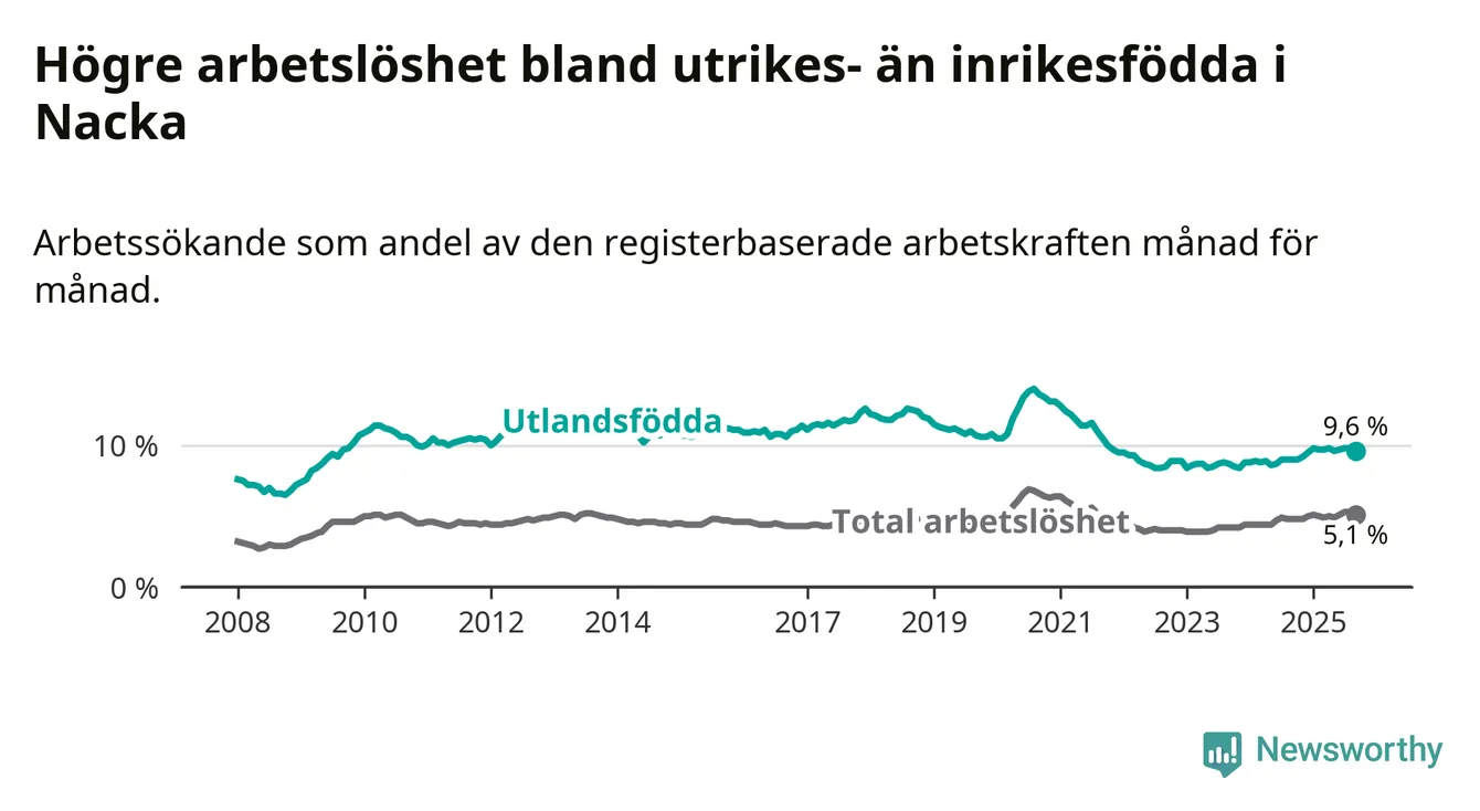 Arbetslösheten bland utlandsfödda var 9,6 procent i Nacka under september månad, motsvarande 1 296 av 13 500 personer. Det är 0,6 procentenheter fler än vid samma tidpunkt i fjol (+103 om man räknar personer). Därmed är de utlandsföddas arbetslöshet högre än vid samma tidpunkt i fjol för 21:a månaden i följd.