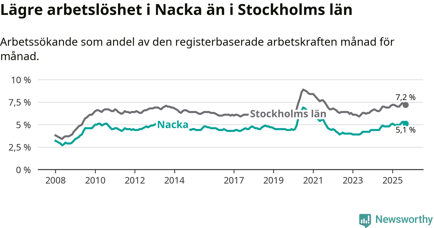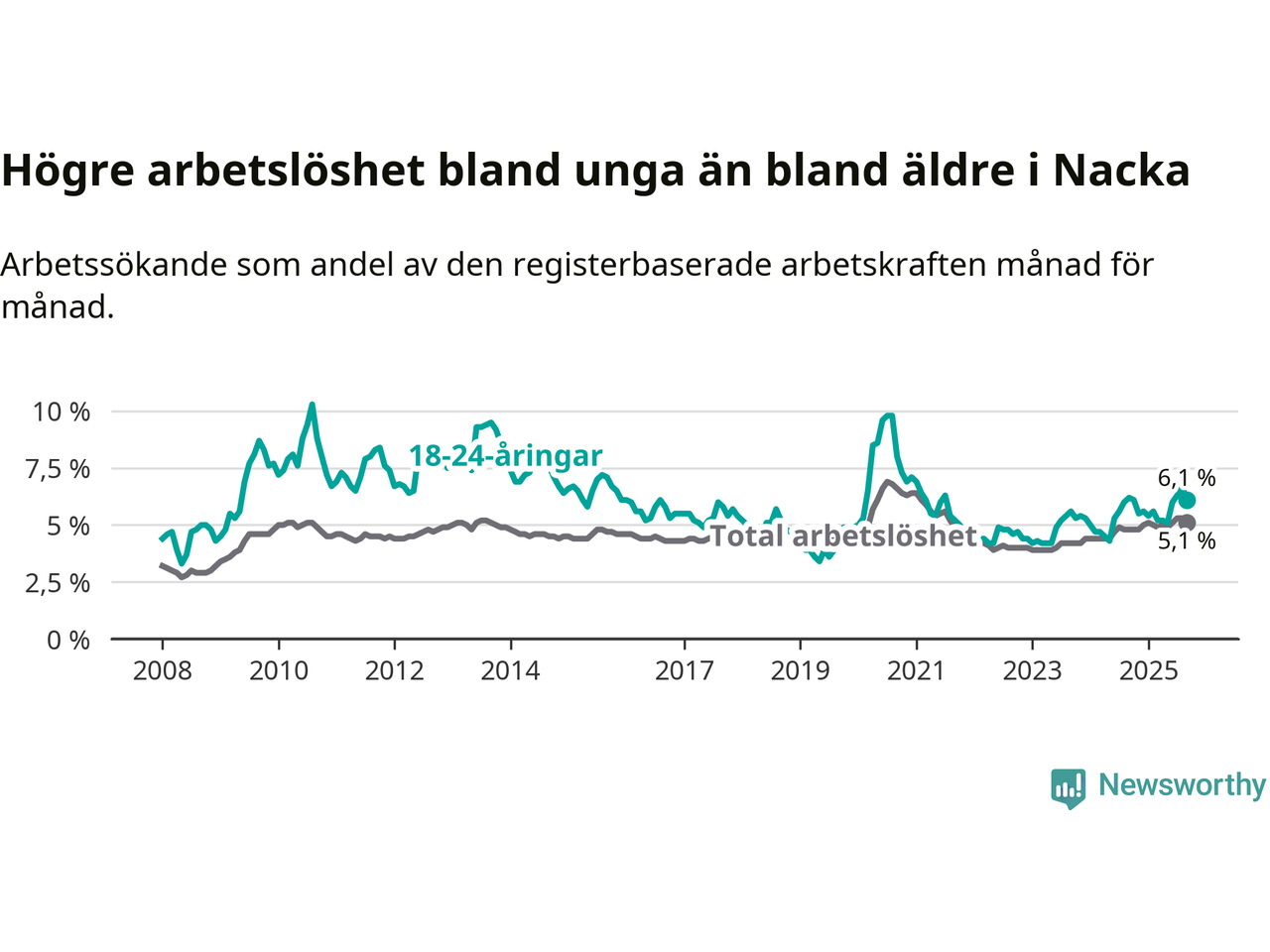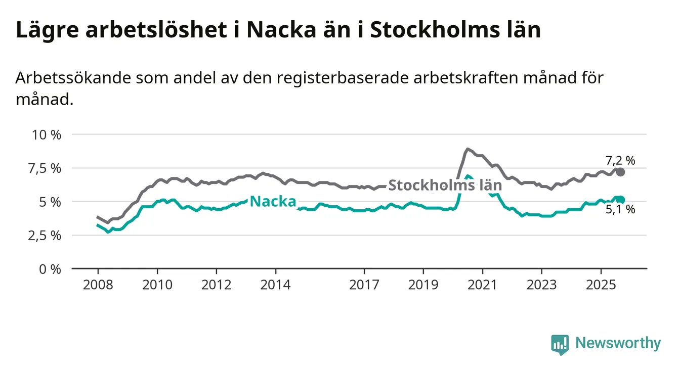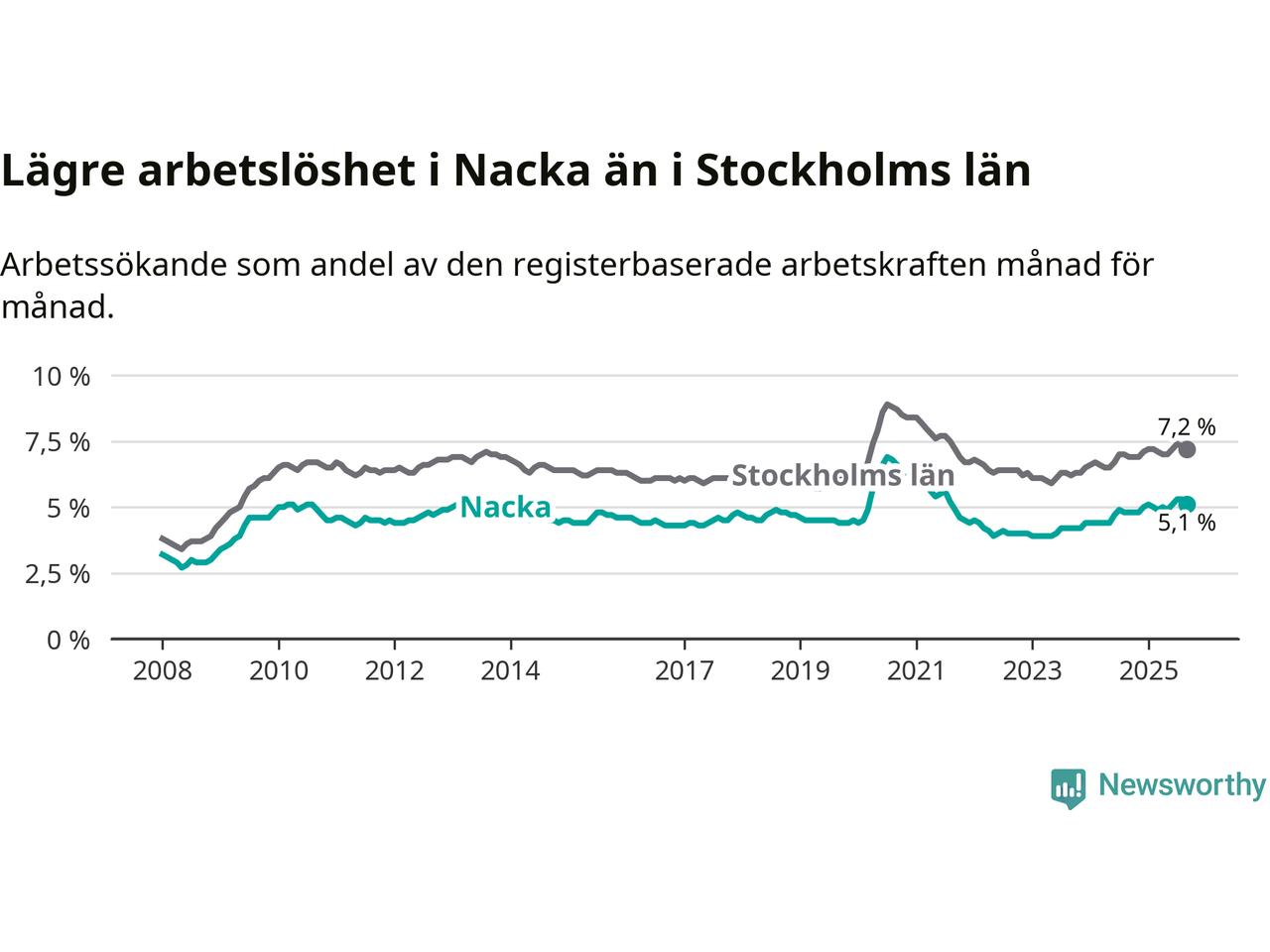 Det är 27:e månaden i följd som arbetslösheten i Nacka är högre än den var under samma tidpunkt året innan. Sedan juni 2023 har arbetslösheten gått upp från 4,0 till 5,1 procent.