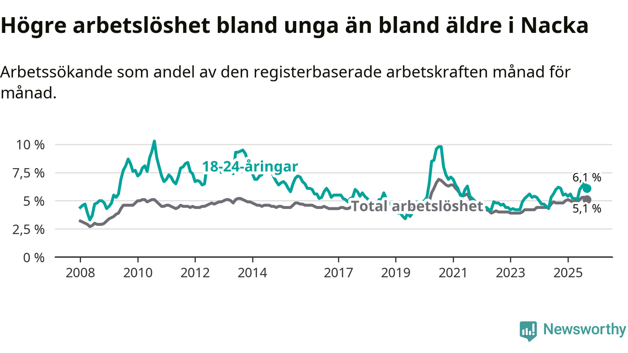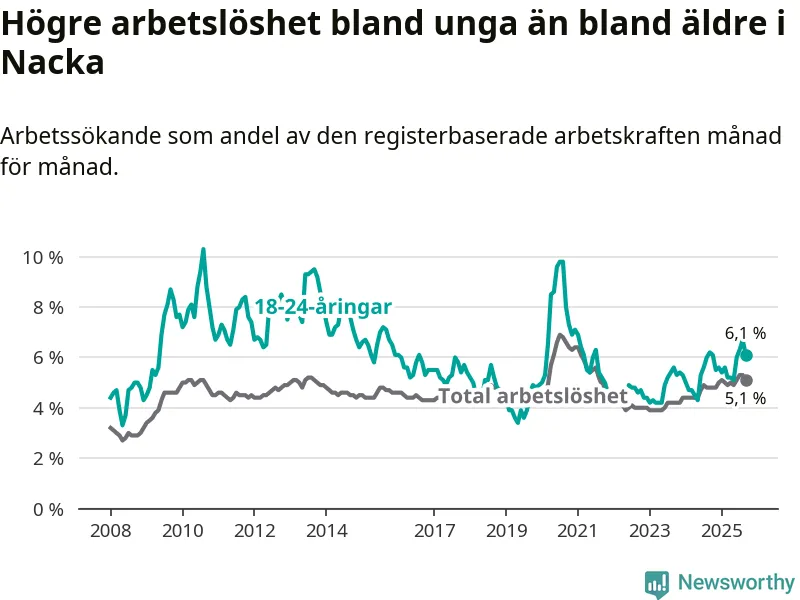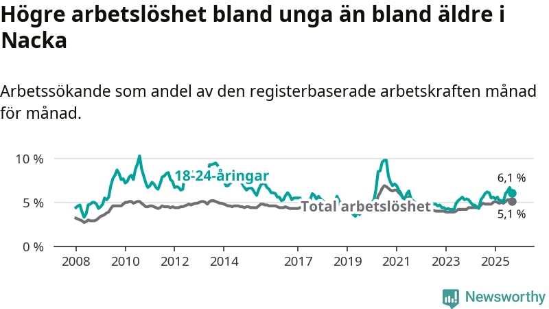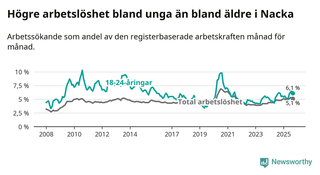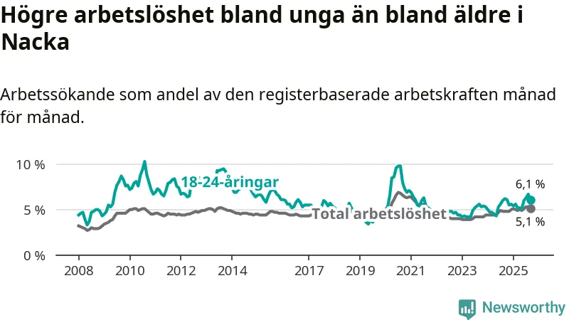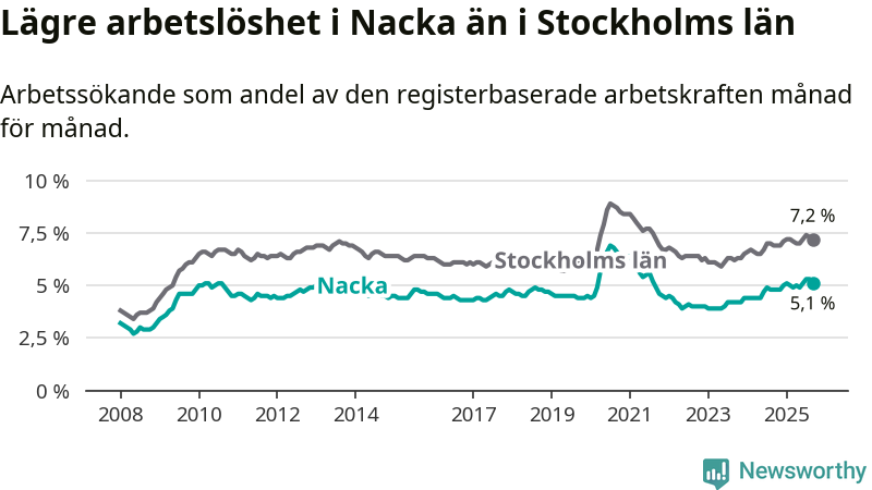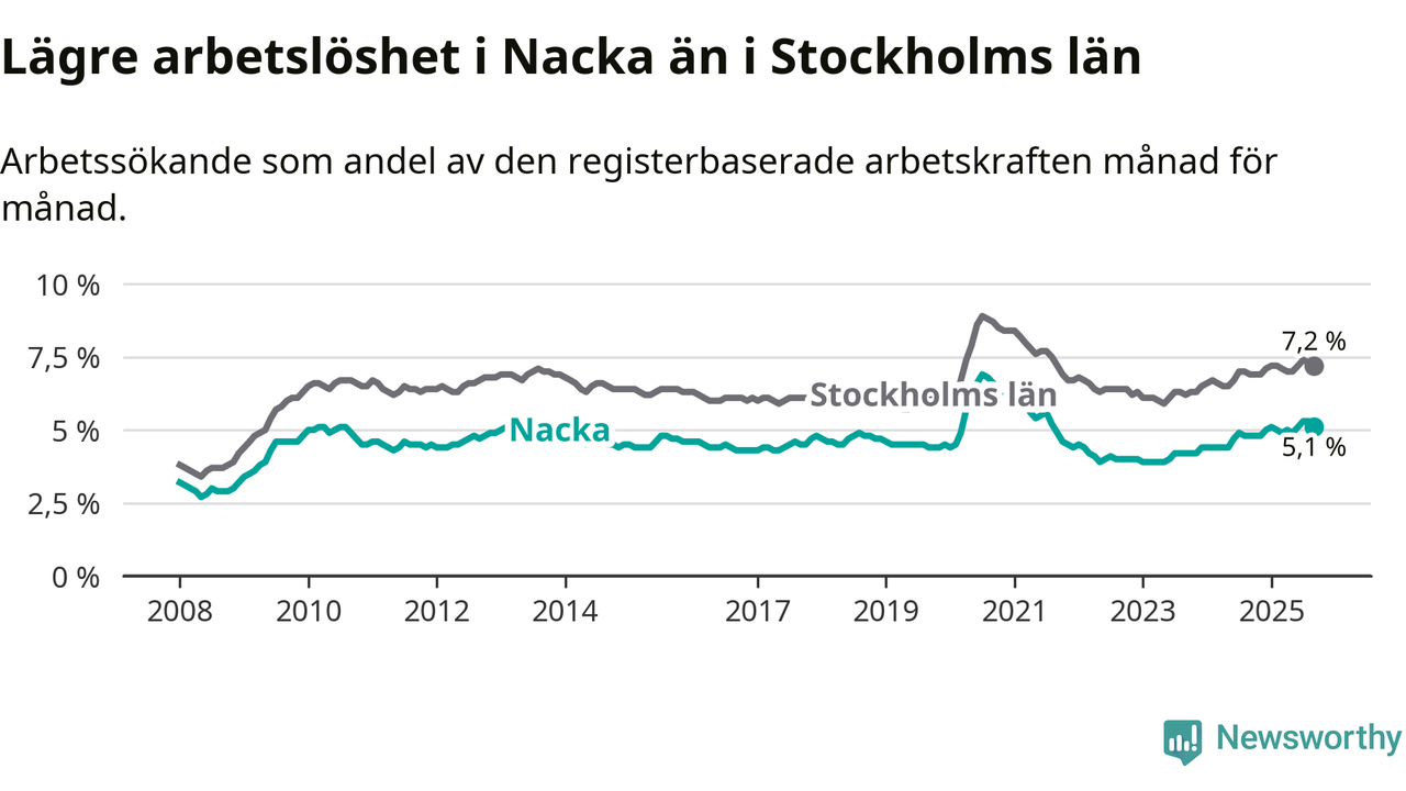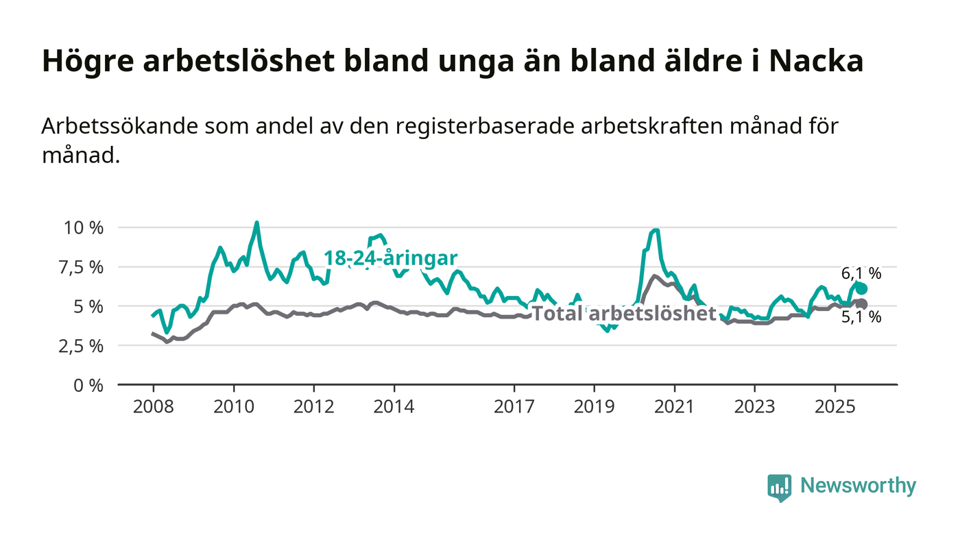 Det är 27:e månaden i följd som arbetslösheten i Nacka är högre än den var under samma tidpunkt året innan. Sedan juni 2023 har arbetslösheten gått upp från 4,0 till 5,1 procent.