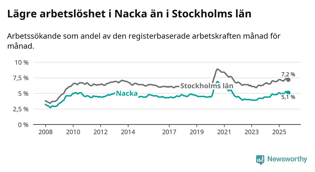 Även om arbetslösheten i Nacka alltså ökar, så ligger den fortfarande under snittet i hela Stockholms län (5,1 procent i kommunen, jämfört med 7,2 procent i hela länet). Vaxholm och Värmdö har den lägsta arbetslösheten i länet (3,9 procent), medan Södertälje har den högsta (11,1 procent). För att Nacka skulle komma ner i samma arbetslöshetsnivå som Vaxholm och Värmdö skulle 678 personer behöva sysselsättas.