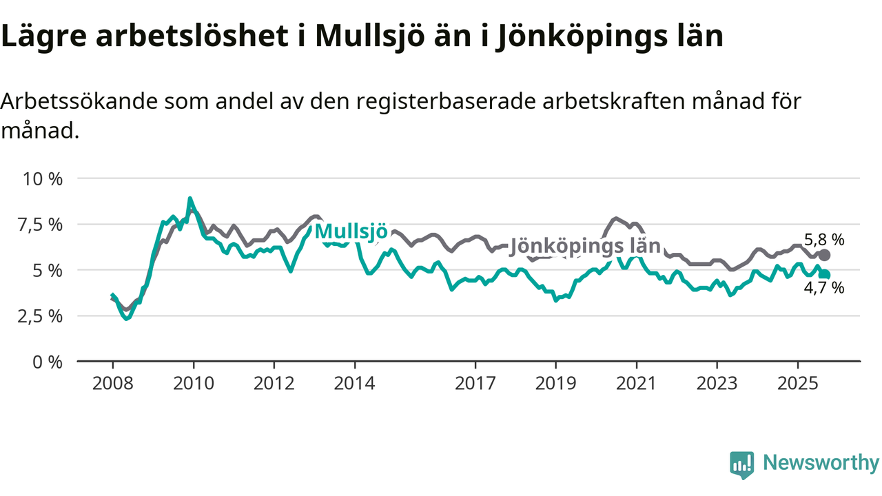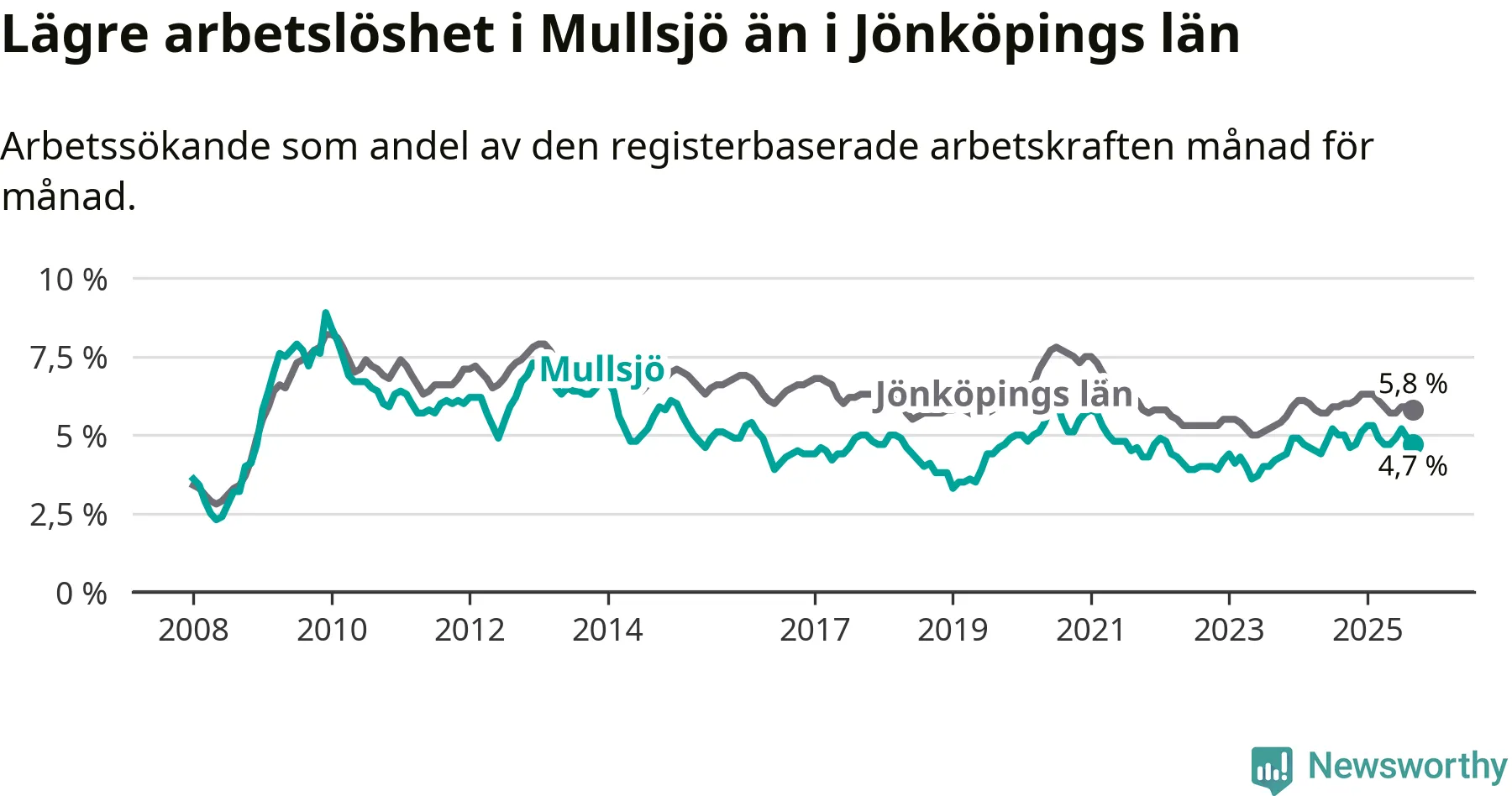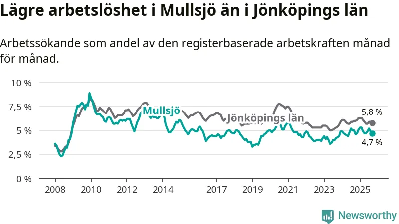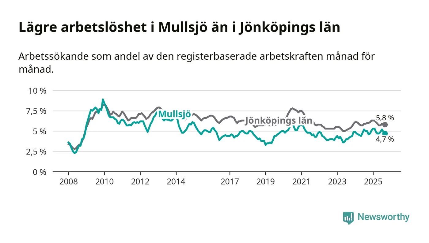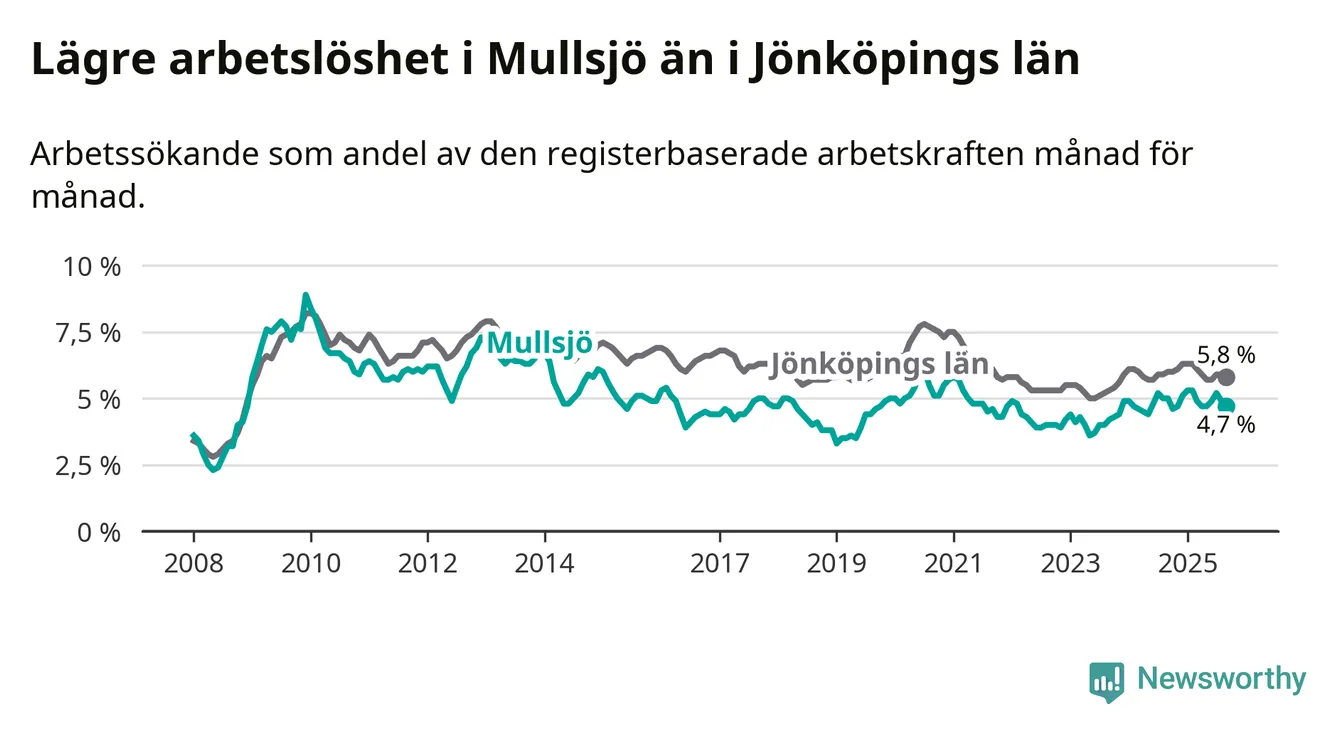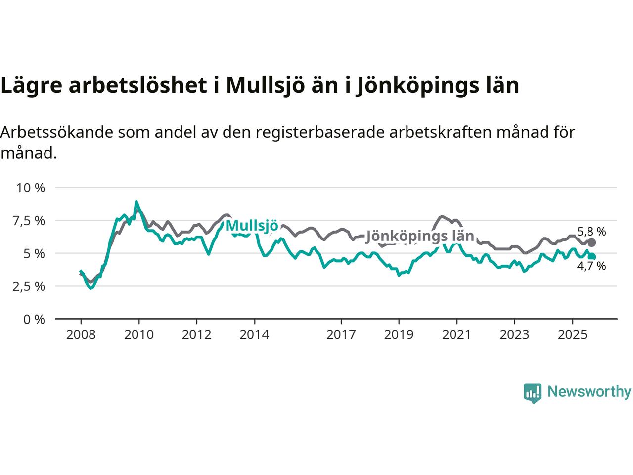 Under september månad rapporterade Mullsjö kommun en total arbetslöshet på 4,7 procent. Det är en minskning jämfört med samma tidpunkt i fjol (−0,3 procentenheter). Även i Jönköpings län sjunker arbetslösheten något.