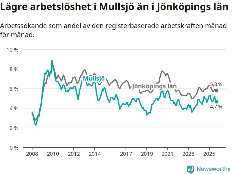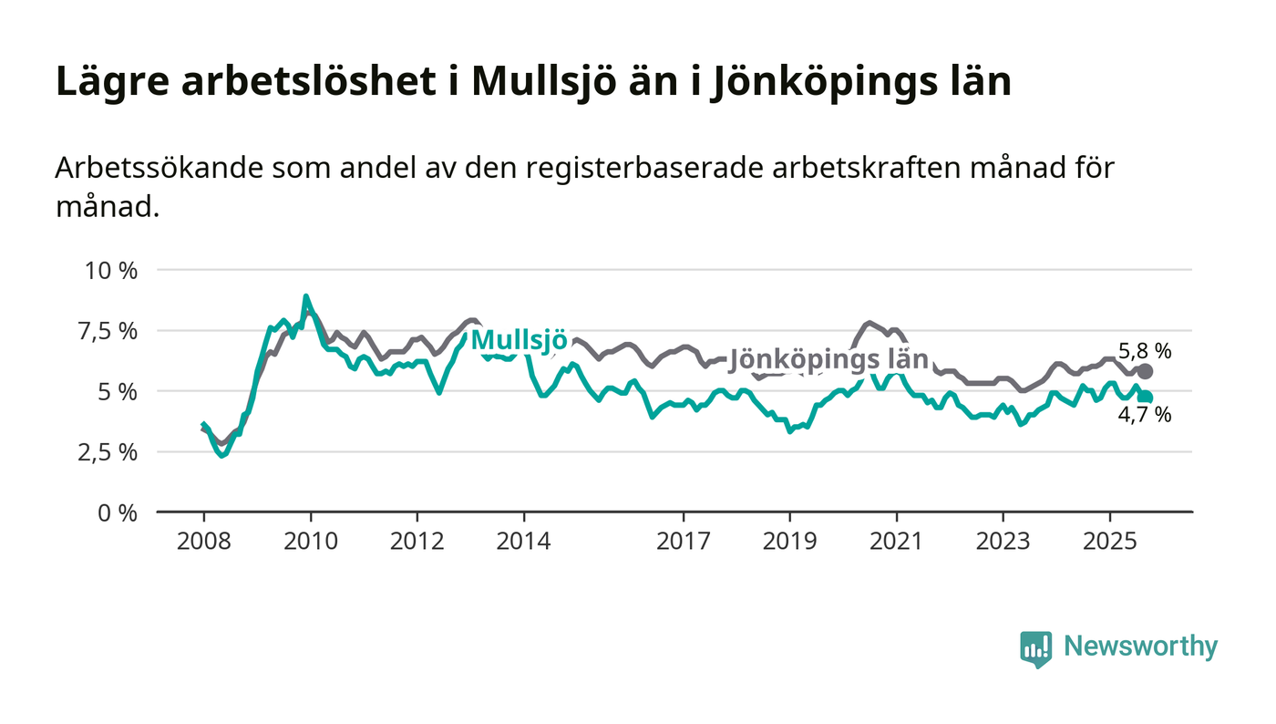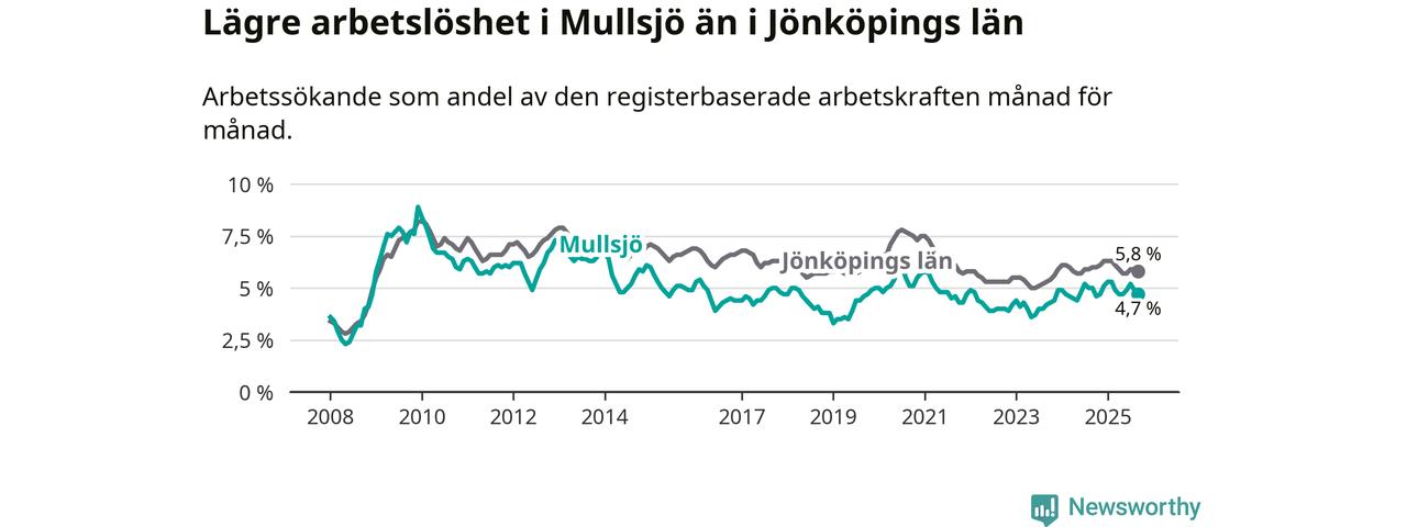 Mullsjö hade redan tidigare lägre arbetslöshet än snittet i hela Jönköpings län och nu växer klyftan (4,7 procent i kommunen, jämfört med 5,8 procent i hela länet). Habo har den lägsta arbetslösheten i länet (3,6 procent), medan Nässjö har den högsta (7,7 procent). För att Mullsjö skulle komma ner i samma arbetslöshetsnivå som Habo skulle 39 personer behöva sysselsättas.