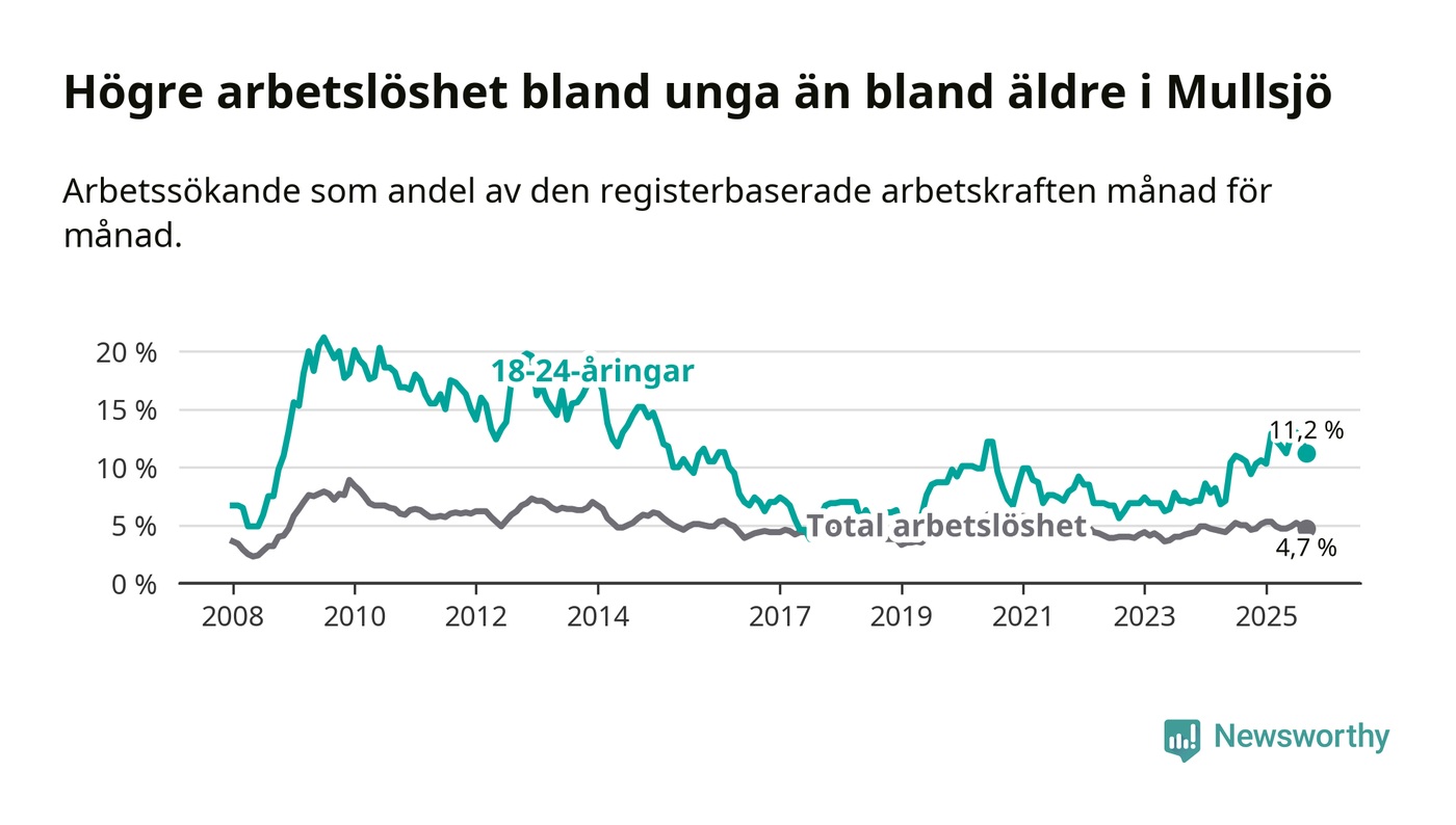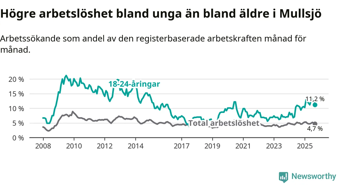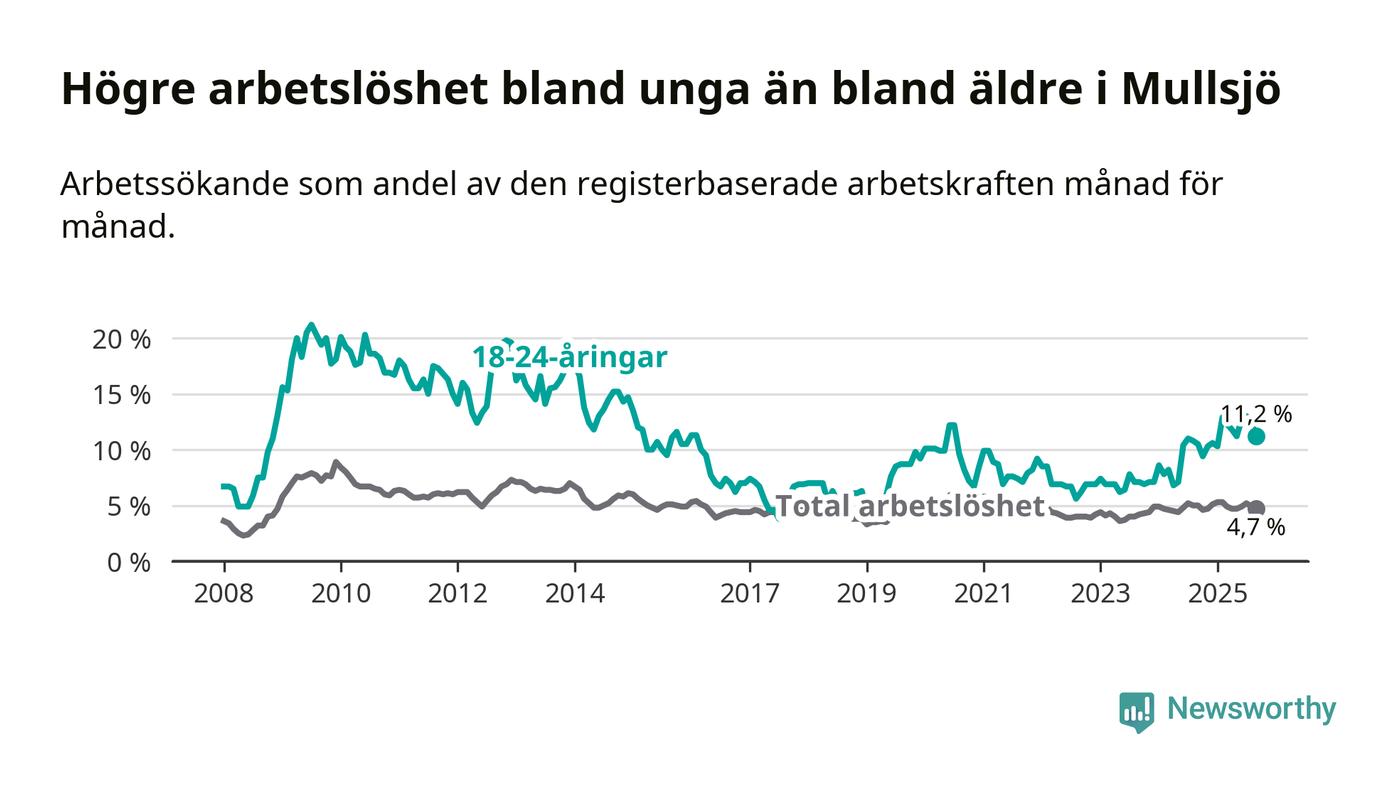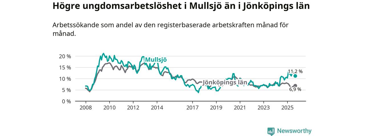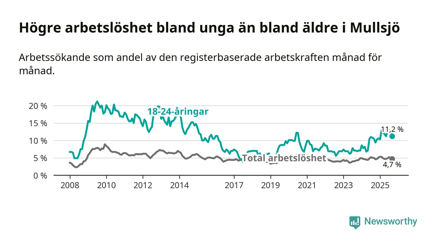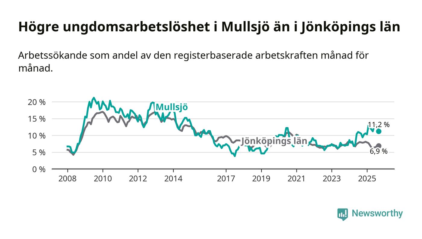 Medan Mullsjö har lägre total arbetslöshet än Jönköpings län, ligger ungdomsarbetslösheten 4,3 procentenheter högre i Mullsjö.