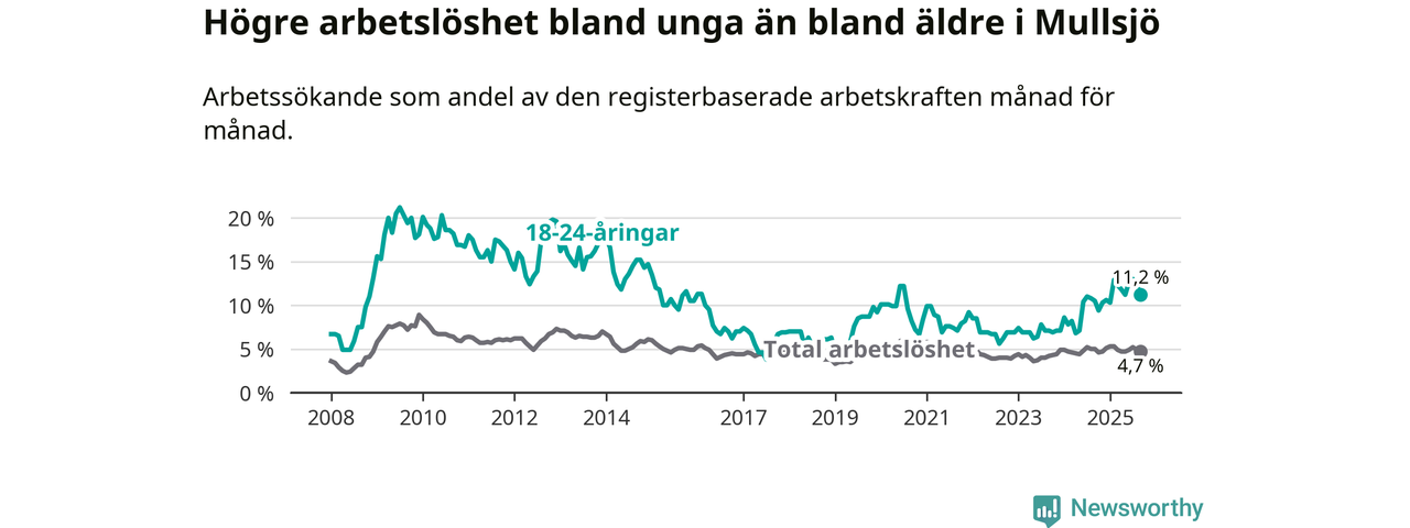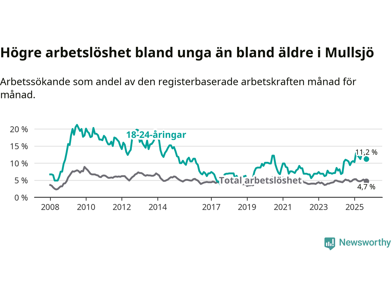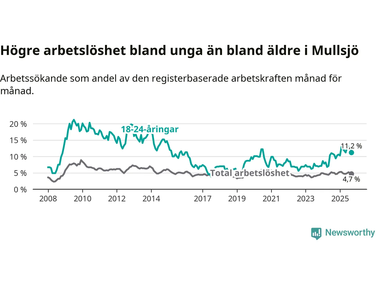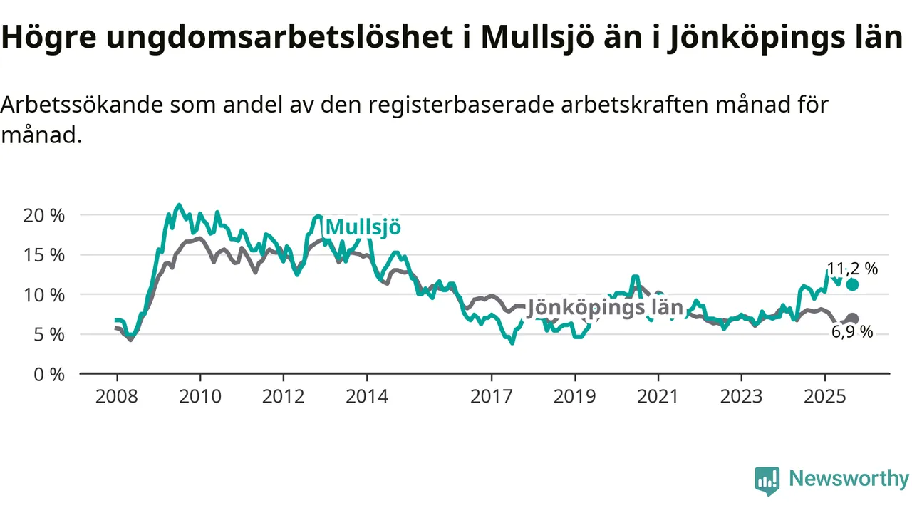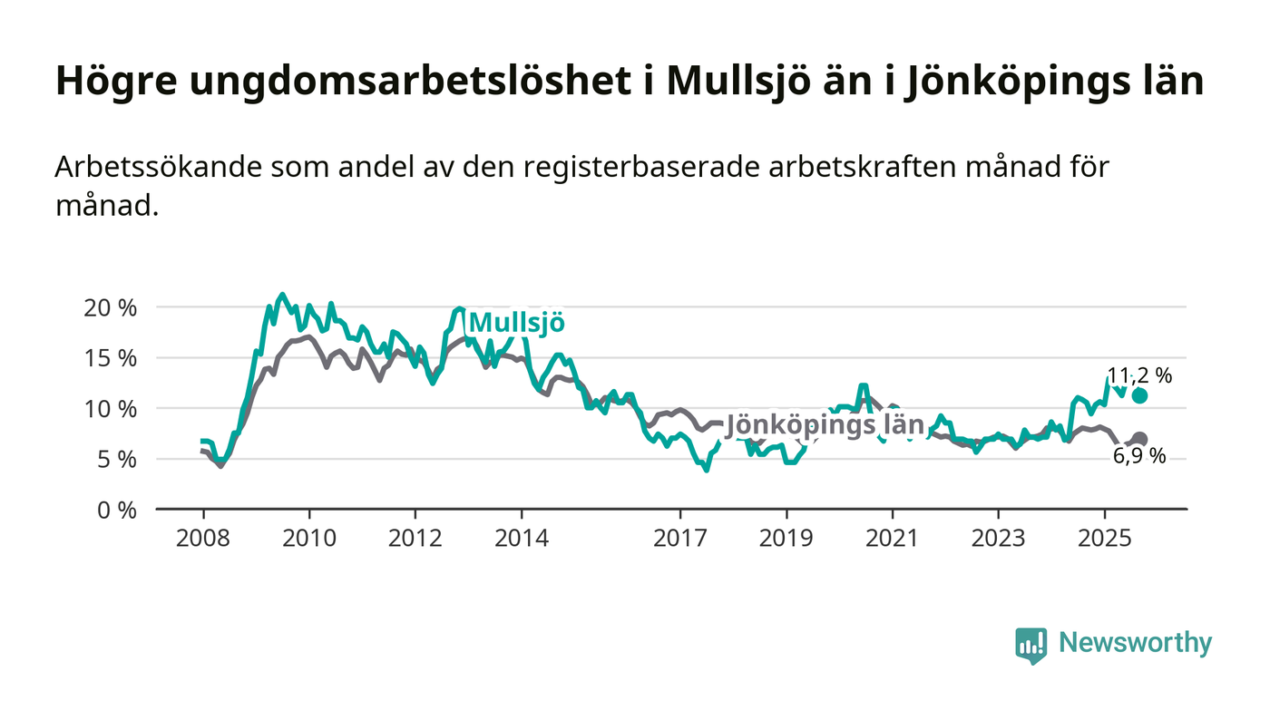 Medan Mullsjö har lägre total arbetslöshet än Jönköpings län, ligger ungdomsarbetslösheten 4,3 procentenheter högre i Mullsjö.