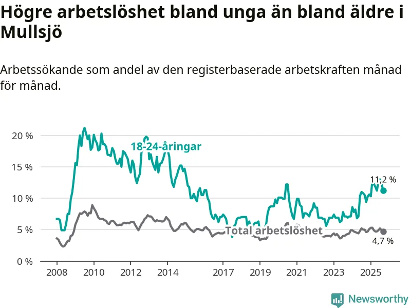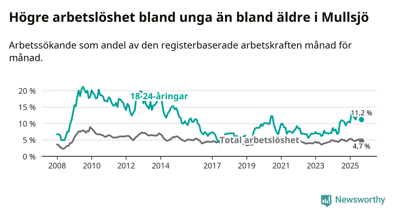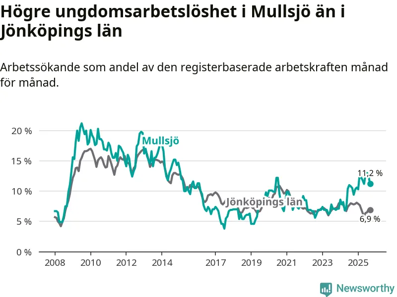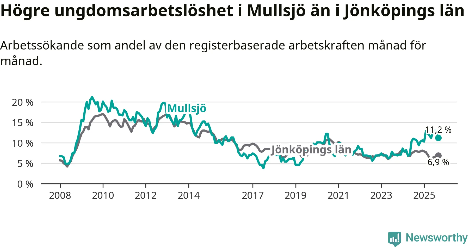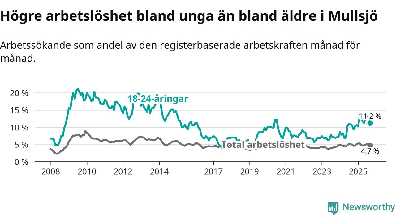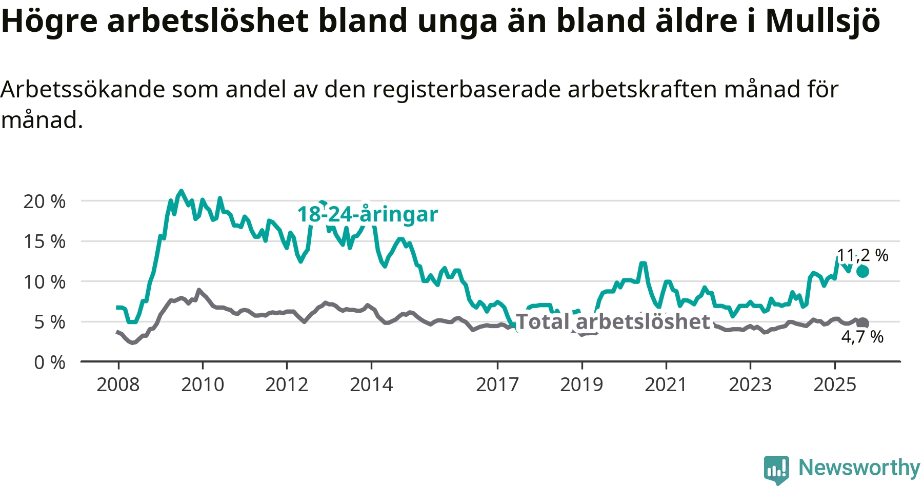 Medan Mullsjö har lägre total arbetslöshet än Jönköpings län, ligger ungdomsarbetslösheten 4,3 procentenheter högre i Mullsjö.
