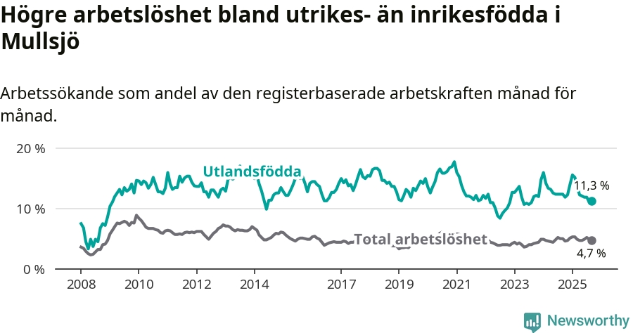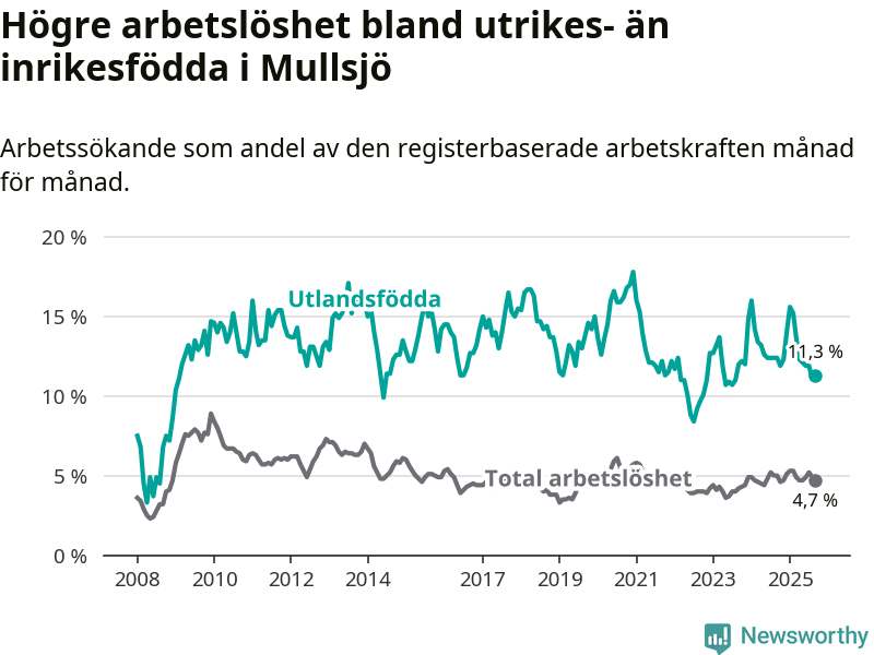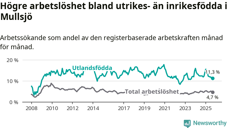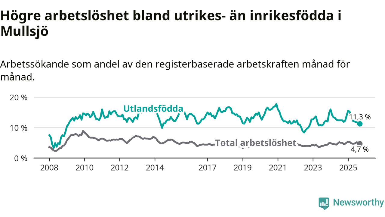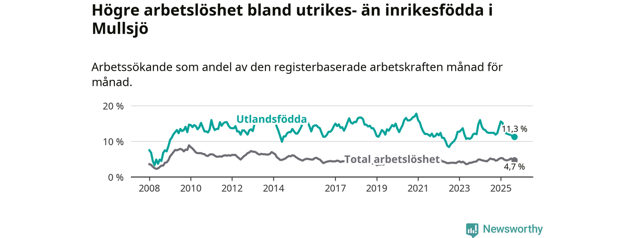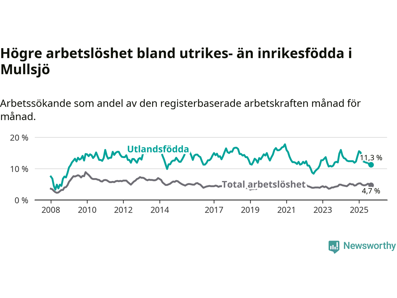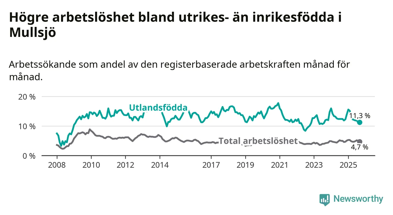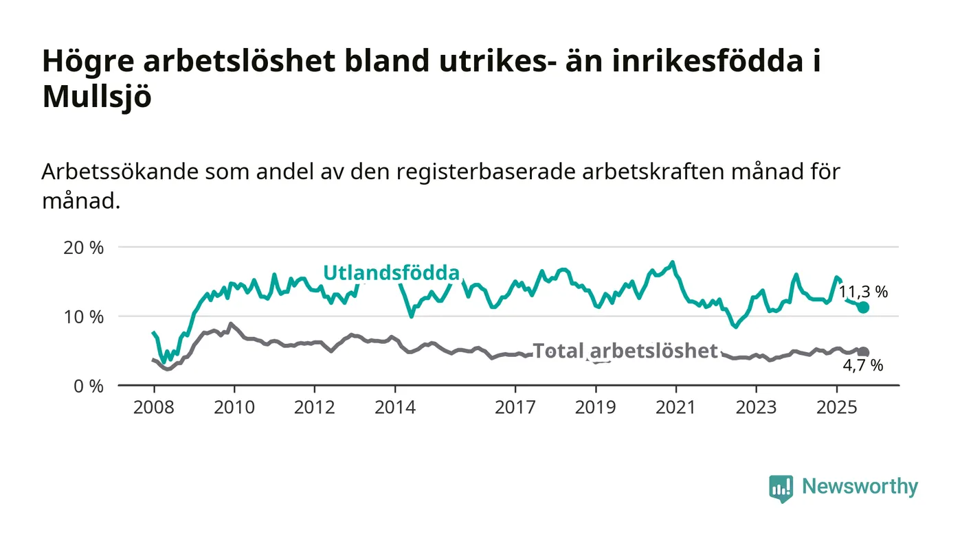 Skillnaden i arbetslöshet mellan utrikesfödda och hela befolkningen är 6,6 procentenheter i Mullsjö. Det är en mindre skillnad än för ett år sedan (−0,8 procentenheter).